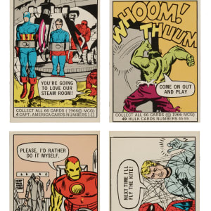 Presented is a complete 66-card set of 1966 Donruss "Marvel Super Heroes" accompanied by an original wrapper. Marvel's roster of super heroes serve as subjects for this popular set, including Spider-Man, Captain America, The Hulk, and others, in a series of colorful action scenes throughout the 66-card set. The Marvel characters featured in this set are essentially the equivalent to rookie cards in sports sets. Condition is 12% Ex-Mt to Nr/Mt, 62% Vg-Ex to Ex, and 26% Gd to Vg (including one lesser [card #1] and a couple with a slight miscut). The wrapper displays normal fold lines and wrinkles, grading Very Good to Excellent overall. This is an attractive mid-grade complete set of this popular 1960s nonsport issue. Total: 67 items (66 cards plus one wrapper).