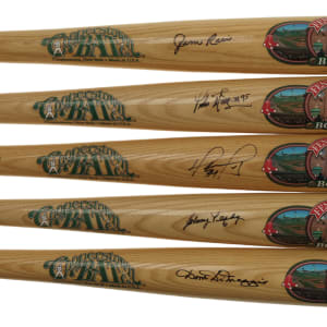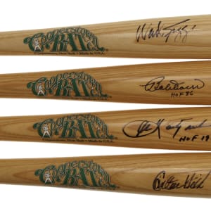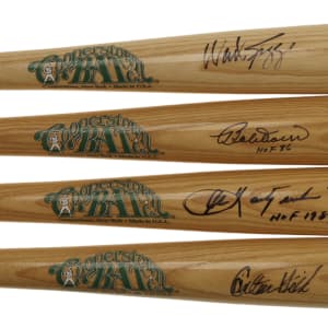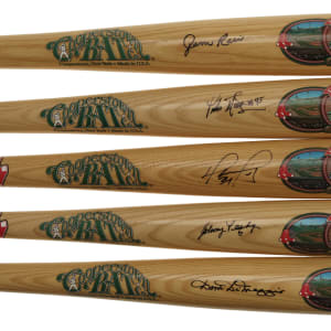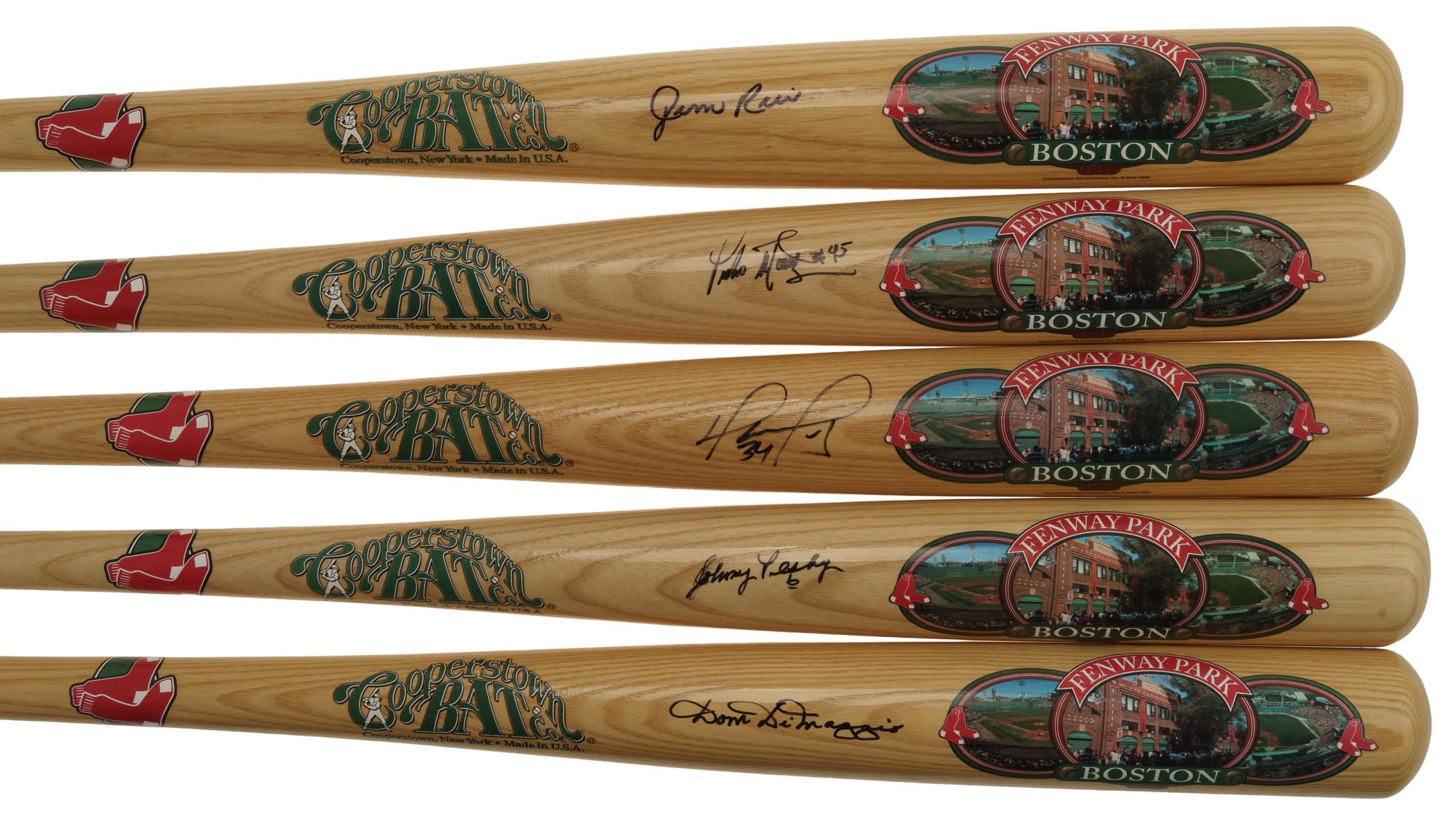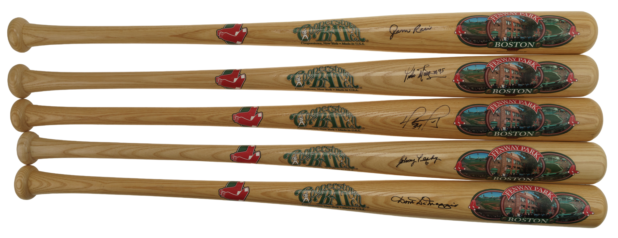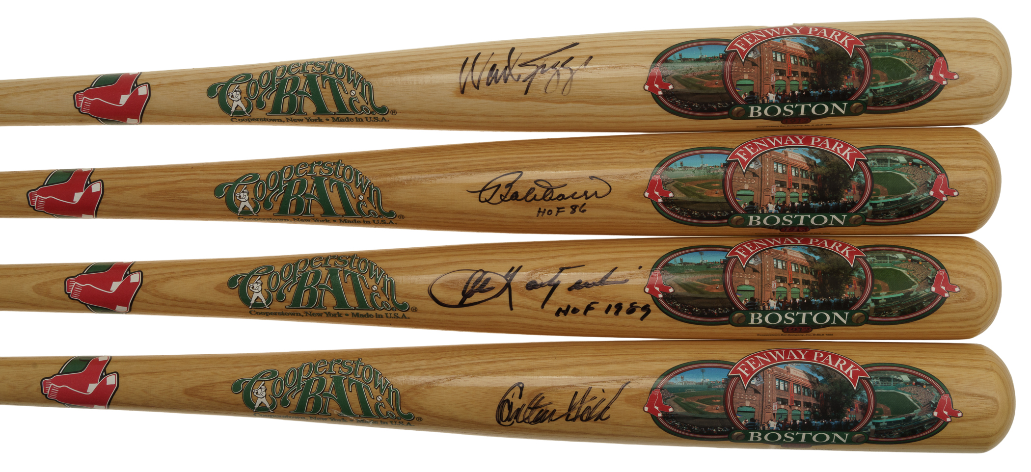 Collection of nine Cooperstown Bat Company "Fenway Park" bats (copyright 1999), each signed on the sweet spot of the barrel by a Boston Red Sox Hall of Famer or star: Pedro Martinez, Dom DiMaggio, David Ortiz, Jim Rice, Johnny Pesky, Wade Boggs, Carl Yastrzemski, Bobby Doerr, and Carlton Fisk. All the signatures are boldly scripted in black Sharpie. The bats (34 inches in length) are all in Near Mint condition. Total: 9 bats. Auction LOA from James Spence/JSA. The size/weight of this item requires that there will be an additional shipping charge for this lot