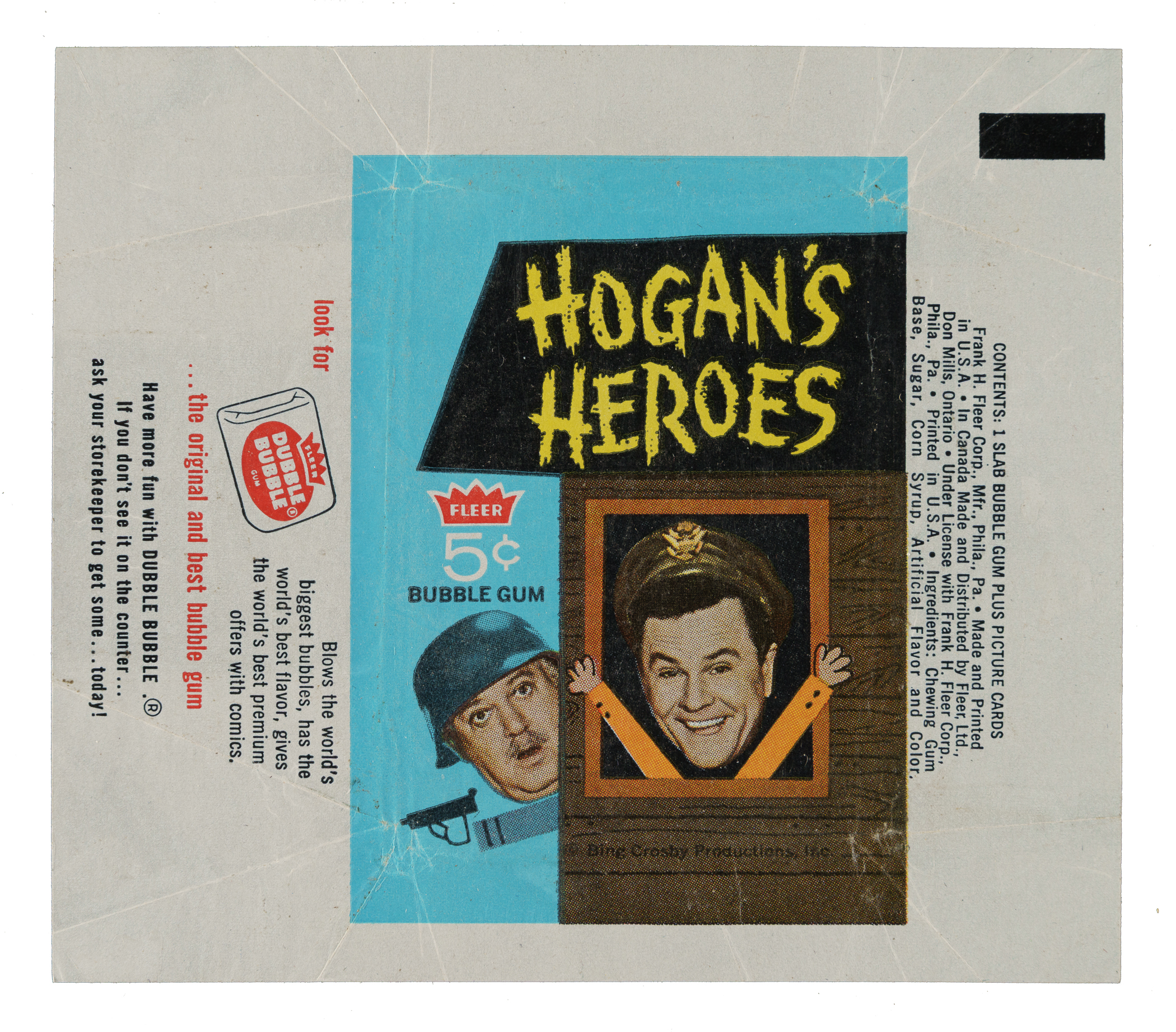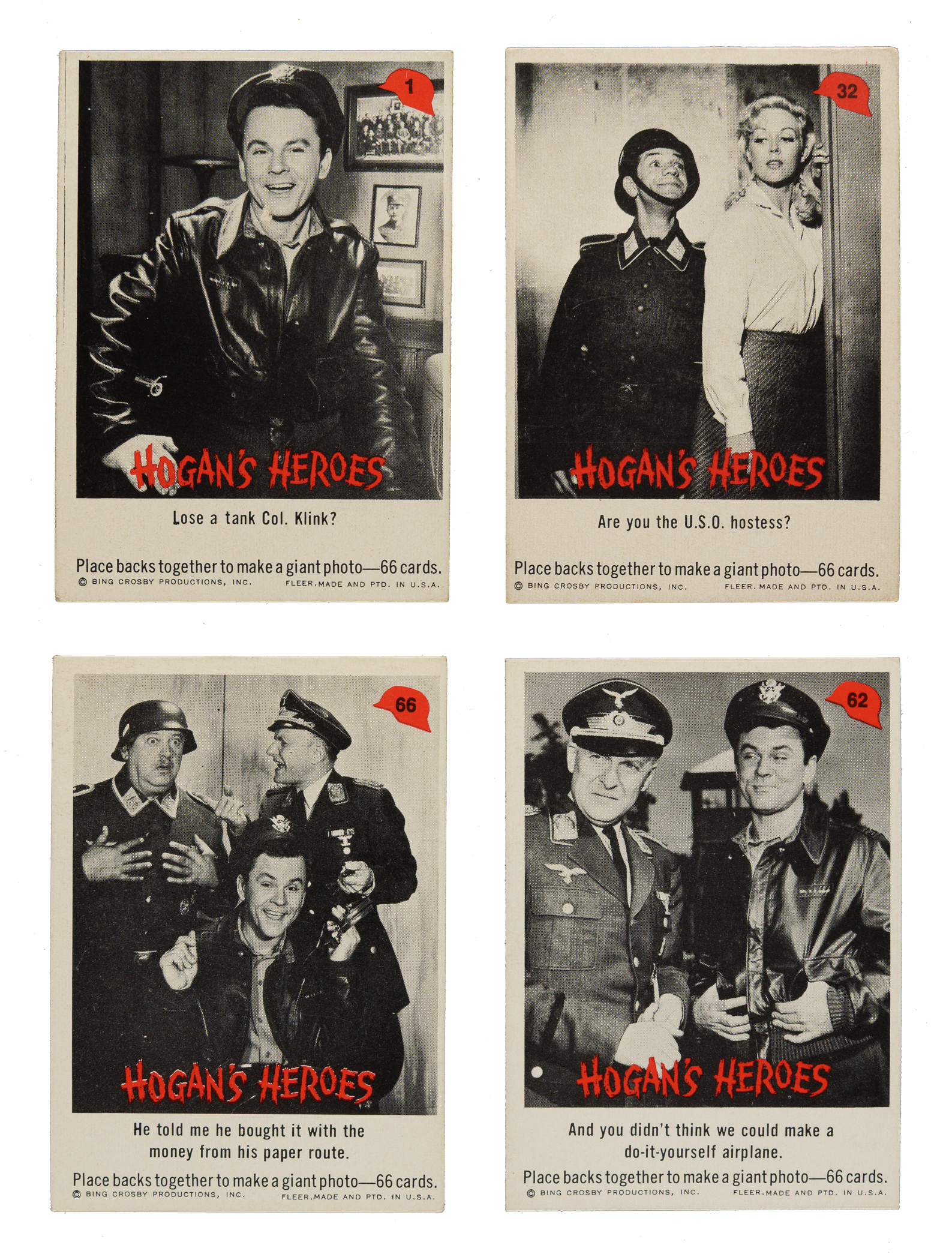 Presented is a 66-card complete set of 1965 Fleer "Hogan's Heroes" trading cards. Each card features black-and-white images from the popular television series on the front, with set name and a caption printed underneath. The reverse features part of an image intended to be pieced together with other cards from the set to produce a large, black-and-white display. Condition is 30% Ex (including a few Ex-Mt) and 70% Vg to Vg-Ex (including one Gd and a couple that measure a bit small). The set is accompanied by a wrapper with slightly more than normal packaging wrinkles and folds but which is still in overall Excellent condition. This is a very attractive mid-grade set that would be at home in any collection of 1960s nonsports cards or television-related collectibles. Total: 67 items (66 cards plus wrapper).