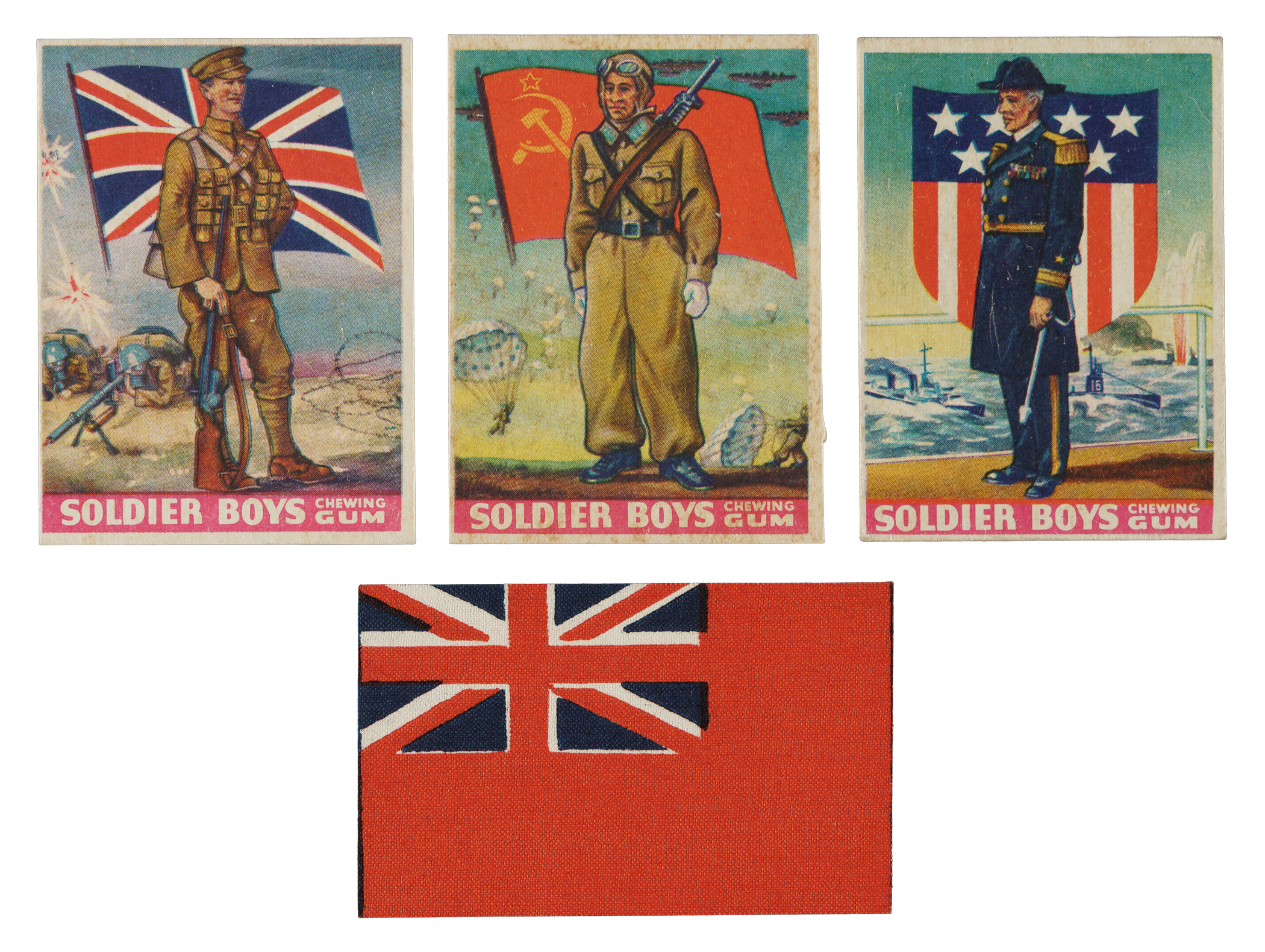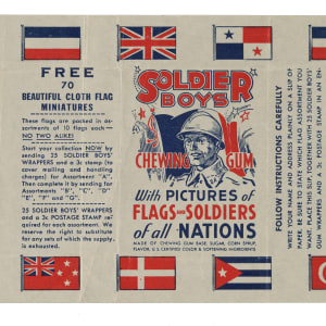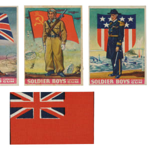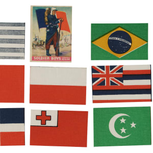 The colorful "Soldier Boys" set was issued with Goudey's "Soldier Boy Chewing Gum." The 24-card set features "Colorful, thrilling pictures of Soldiers and Flags of All Nations." Condition of the set is 25% Ex or slightly better, 58% Vg to Vg-Ex, and 17% slightly lesser. Accompanying the set is an original wax wrapper and nine miniature cloth flags (offered as a wrapper redemption). The wrapper grades Very Good due to extra creases beyond the normal fold lines. Condition of the cloth flags ranges from Vg-Ex to Nr/Mt, averaging Ex/Ex-Mt. Goudey "Soldier Boys" cards are rarely offered as a complete set. Total: 34 items (complete set of 24 plus nine cloths and a wax wrapper).