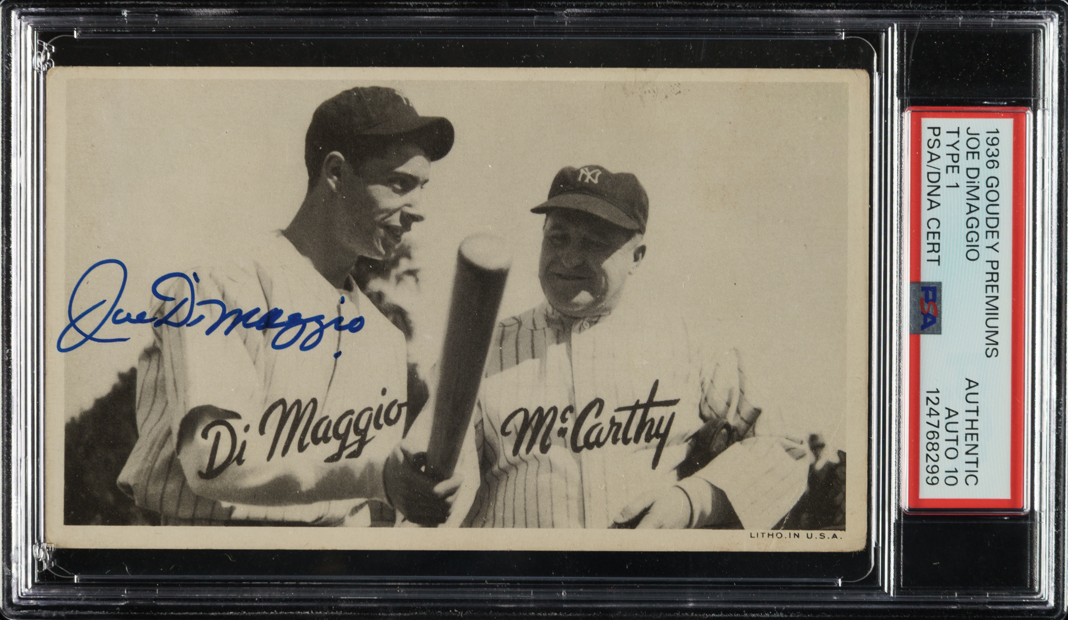 PSA/DNA has encapsulated the card, grading the signature GEM MINT 10 and certified the card as "Authentic." New York Yankees Hall of Famers Joe DiMaggio and manager Joe McCarthy, signed by the "Yankee Clipper" in blue ink across his image.