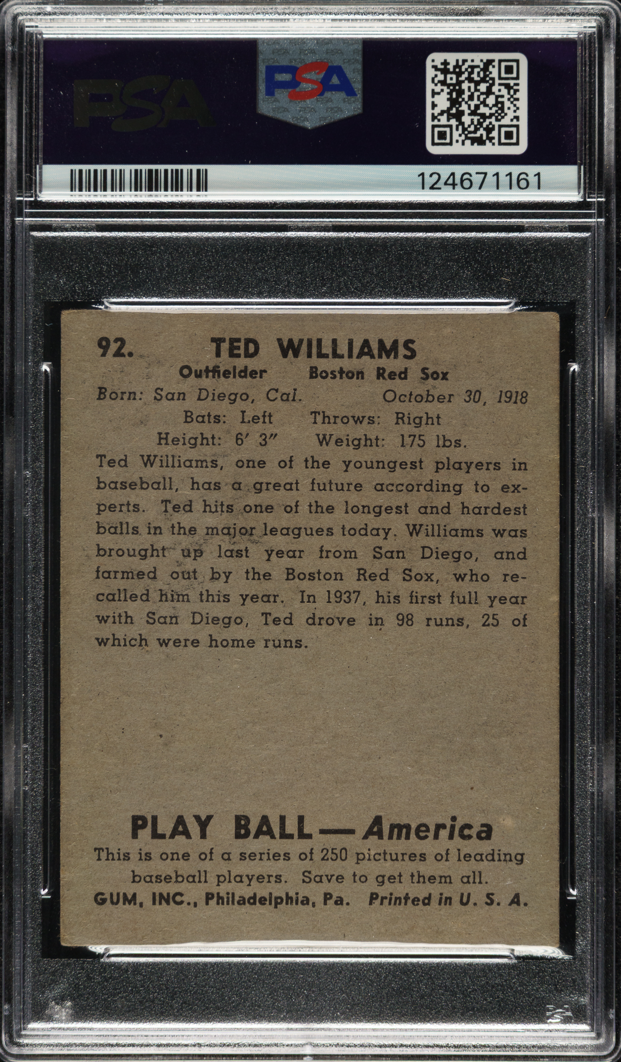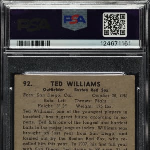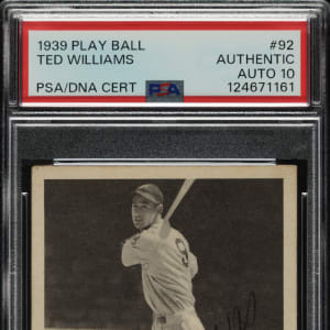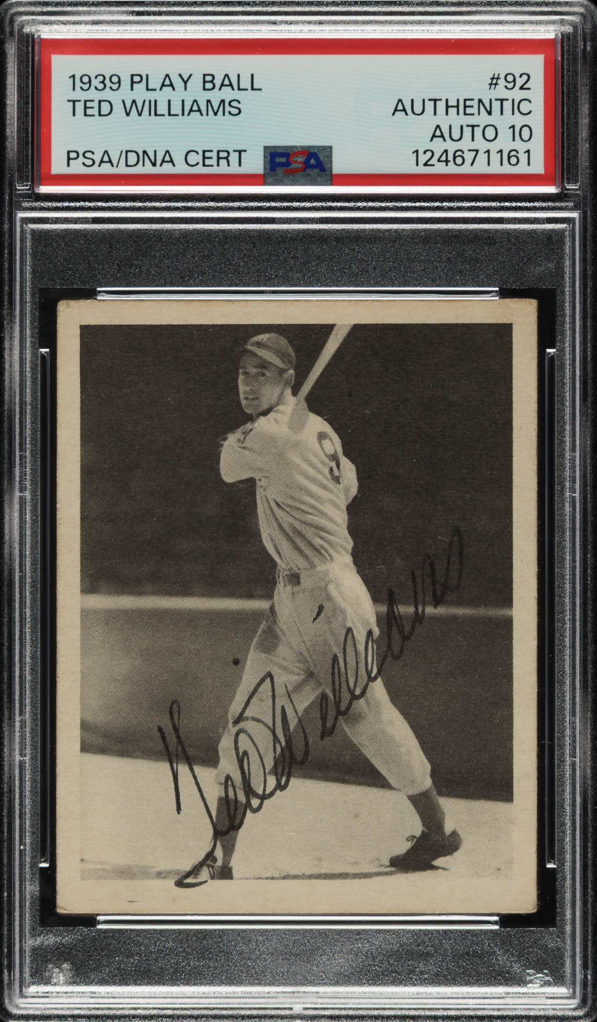 1939 Play Ball #92 Ted Williams signed in black ink on the front. PSA/DNA has graded the signature GEM MINT 10 and certified the card as "Authentic." Ted Williams' Play Ball rookie is part of PSA's Top 250 Sportscards in the Hobby set, based on the book Collecting Sports Legends: The Ultimate Hobby Guide by Joe Orlando, which selects the most significant cards from all the different sports. Because the card itself has always been an extremely highly prized and valuable collectible, it was not an item that the average fan would submit to Williams during a signing show in the 1980s or '90s, which is no doubt in part responsible for the rarity of signed examples today. This is just the sixth signed example we have ever offered. The card displays outstanding image clarity, light corner wear, and excellent centering. It remains an extremely attractive signed example that would be among the highlights of any advanced Ted Williams, Play Ball, or signed Hall of Fame rookie-card collection.