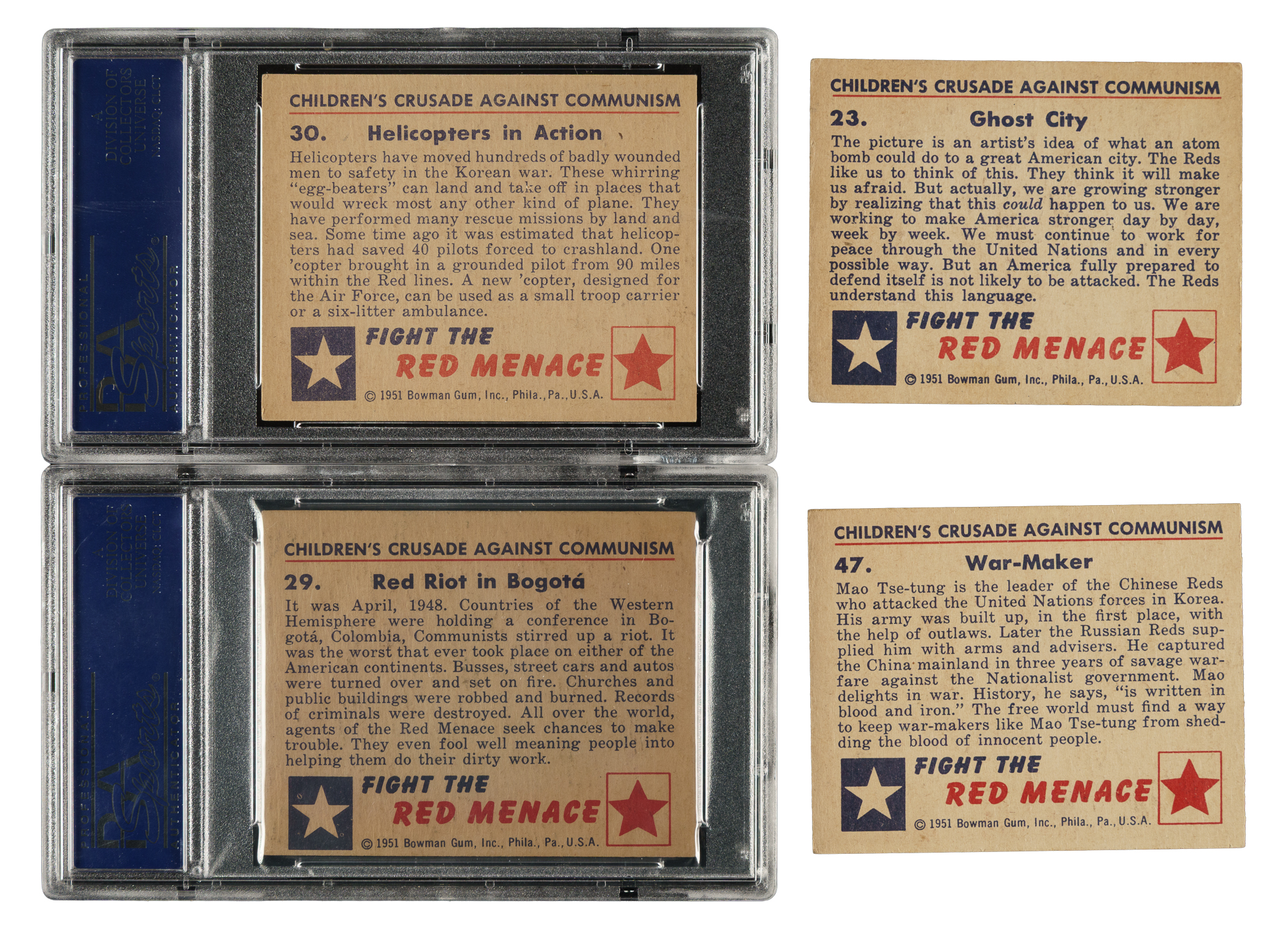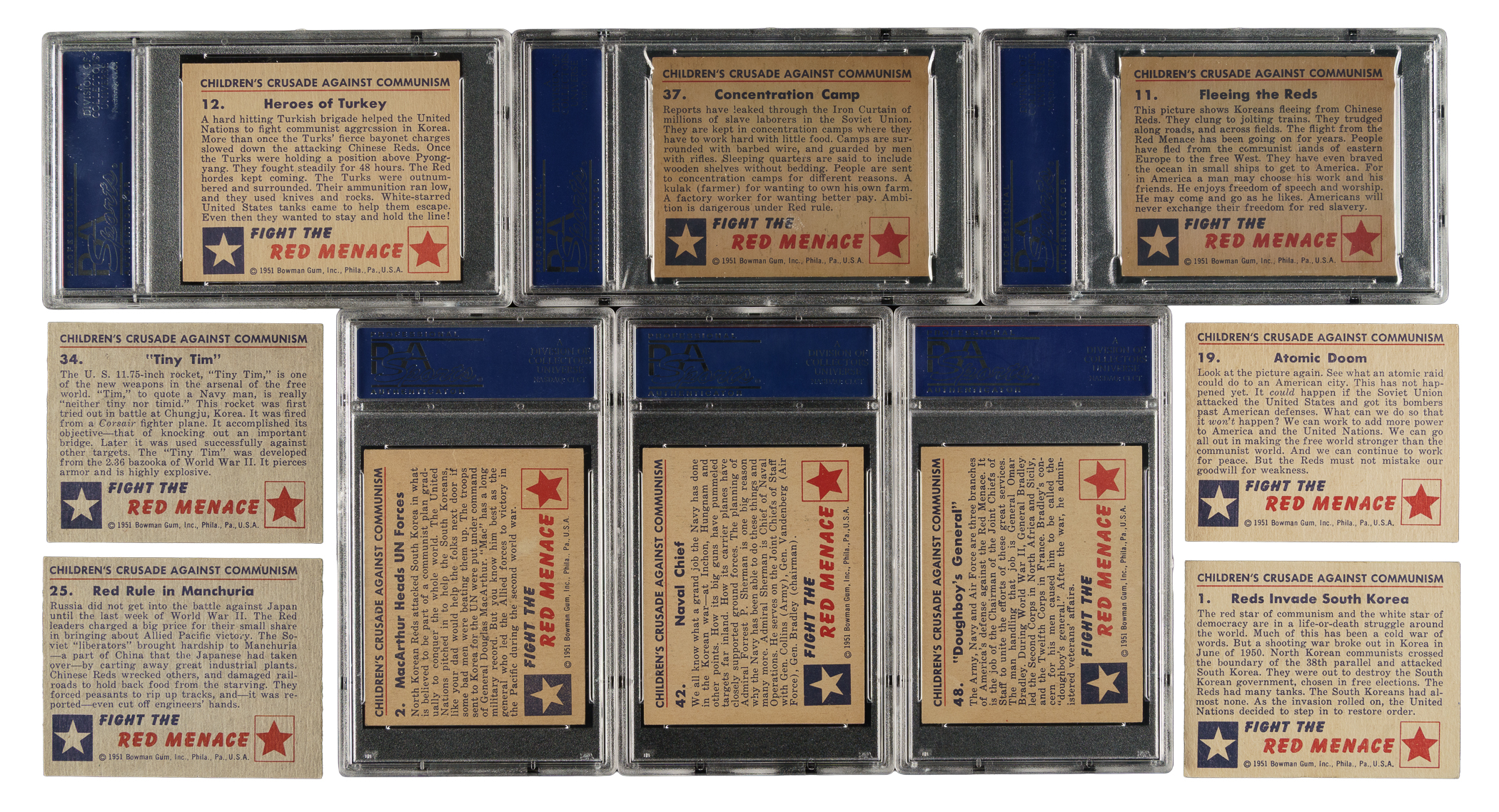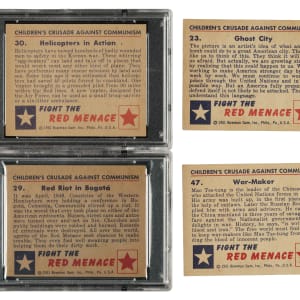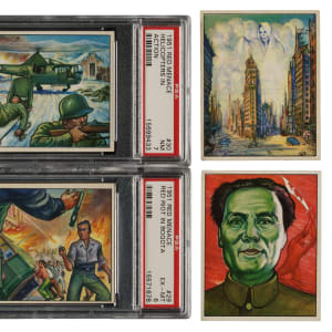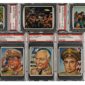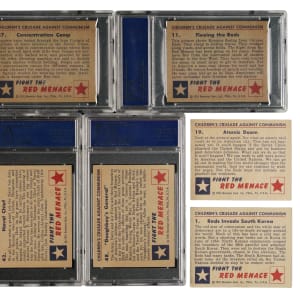 One of the most popular and colorful trading-card sets of the post-WWII era, Bowman Gum's "Red Menace" set was produced during the heart of the Cold War and captures the political spirit of the times. This set consists of 46 white backs and two gray backs (#25 [Ex] and 34 [Ex]). Condition is 20% Ex-Mt to Nr/Mt, 61% Vg-Ex to Ex, and 19% Gd to Vg (including one lesser). Eight cards have been professionally graded and encapsulated by PSA: #2 (EX 5), 11 (EX-MT 6), 12 (EX-MT 6), 29 (EX-MT 6), 30 (NM 7), 37 (EX-MT+ 6.5), 42 (EX 5), and 48 (EX 5). Keys: #1 "Reds Invade South Korea" (Vg), 19 "Atomic Doom" (Ex), 23 "Ghost City" (Vg), and 47 "War-Maker" (Ex). Very attractive mid- to high-grade complete set of this classic, and extremely historically significant, 1950s nonsport issue. Total: 48 cards.
