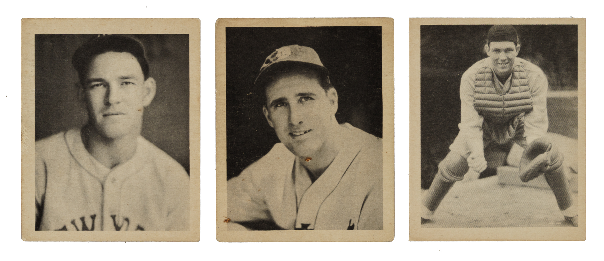 Very attractive near-complete set of 1939 Play Balls, the first of three major baseball-card sets by Gum, Inc., consisting of 159 of the 161 total cards in the set. This landmark set includes all of the other major stars and Hall of Famers of the era. Missing only #26 DiMaggio and 92 Williams (both offered as separate lots in this current auction). The rarer high-number series cards (#116-162) in 1939 Play Ball have always made the assembly of a complete set particularly challenging for collectors. Low Numbers (#1-115): Condition is 48% Vg-Ex to Ex, 43% Gd to Vg, and 9% Pr to Fr. Keys: #1 Powell (Gd), 3 Ruffing (Vg-Ex), 6 Durocher (Vg-Ex), 7 Doerr (Gd+), 30 Dickey (Ex), 39 Ferrell (Vg), 48 Gomez (Vg+), 50 Gehringer (Pr-Fr due to partially erased pencil on front), 51 Ott (Gd), 53 Hubbell (Gd), 55 Vaughan (Fr), 56 Greenberg (Vg), 82 Klein (Vg-Ex), 89 L. Waner (Vg), 94 Manush (Vg), 103 Berg (Vg-Ex), 112 P. Waner (Vg-Ex+), and 113 Schacht (Vg-Ex+). High Numbers (#116-162): Condition is 39% Vg-Ex to Ex, 43% Gd to Vg, and 18% Pr to Fr. Keys: #143 Averill (Gd). While 1939 Play Balls are numbered #1 through 162, no #126 was issued, making the set complete at 161 cards. The 46 high-number cards and the numerous Hall of Famers naturally give this set an impressive break value. This mostly mid-grade near-set has many highlights and offers an outstanding value, representing an extremely desirable and relatively affordable alternative to a higher-grade set of this classic prewar gum issue. Total: 159 cards.