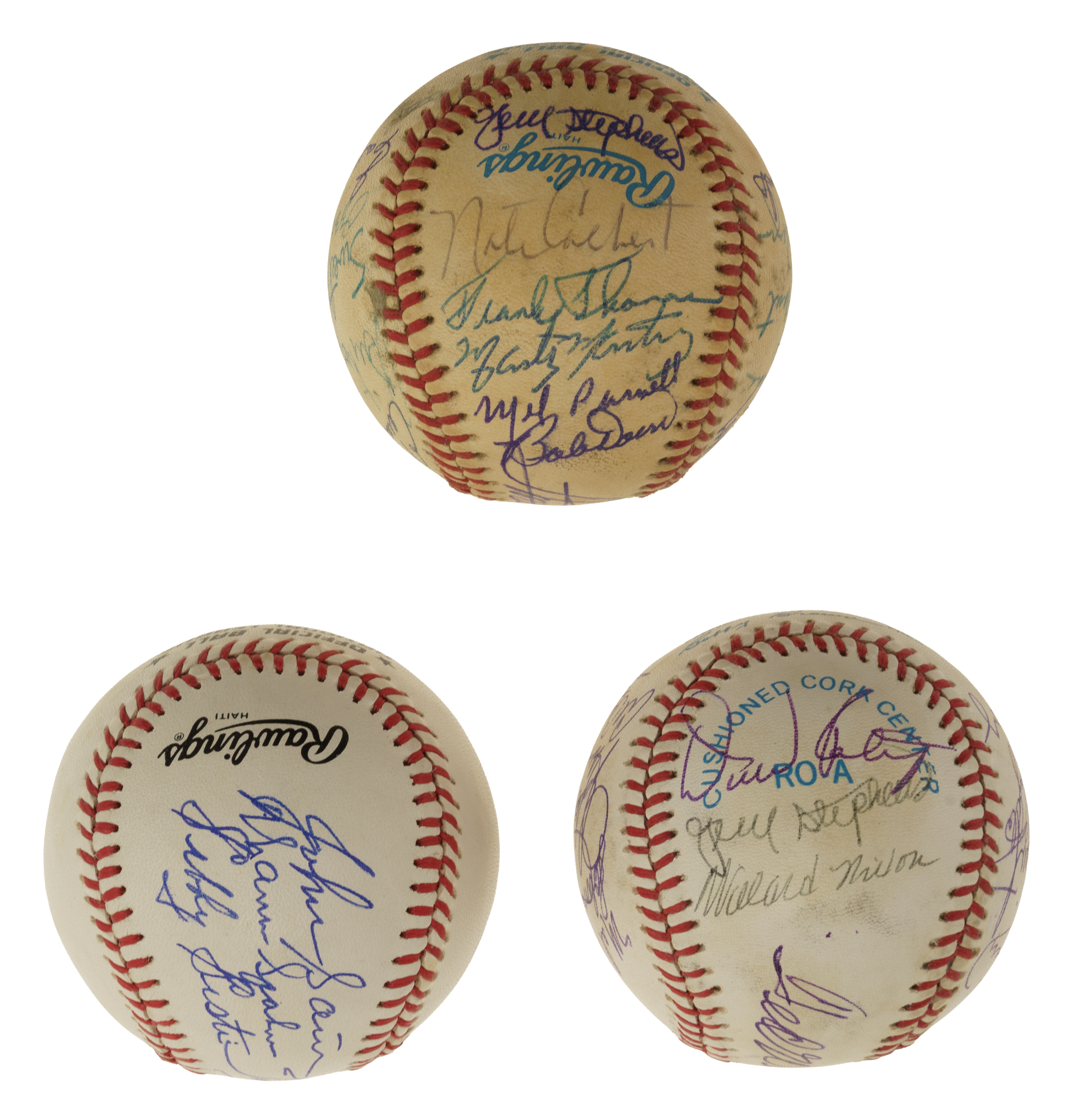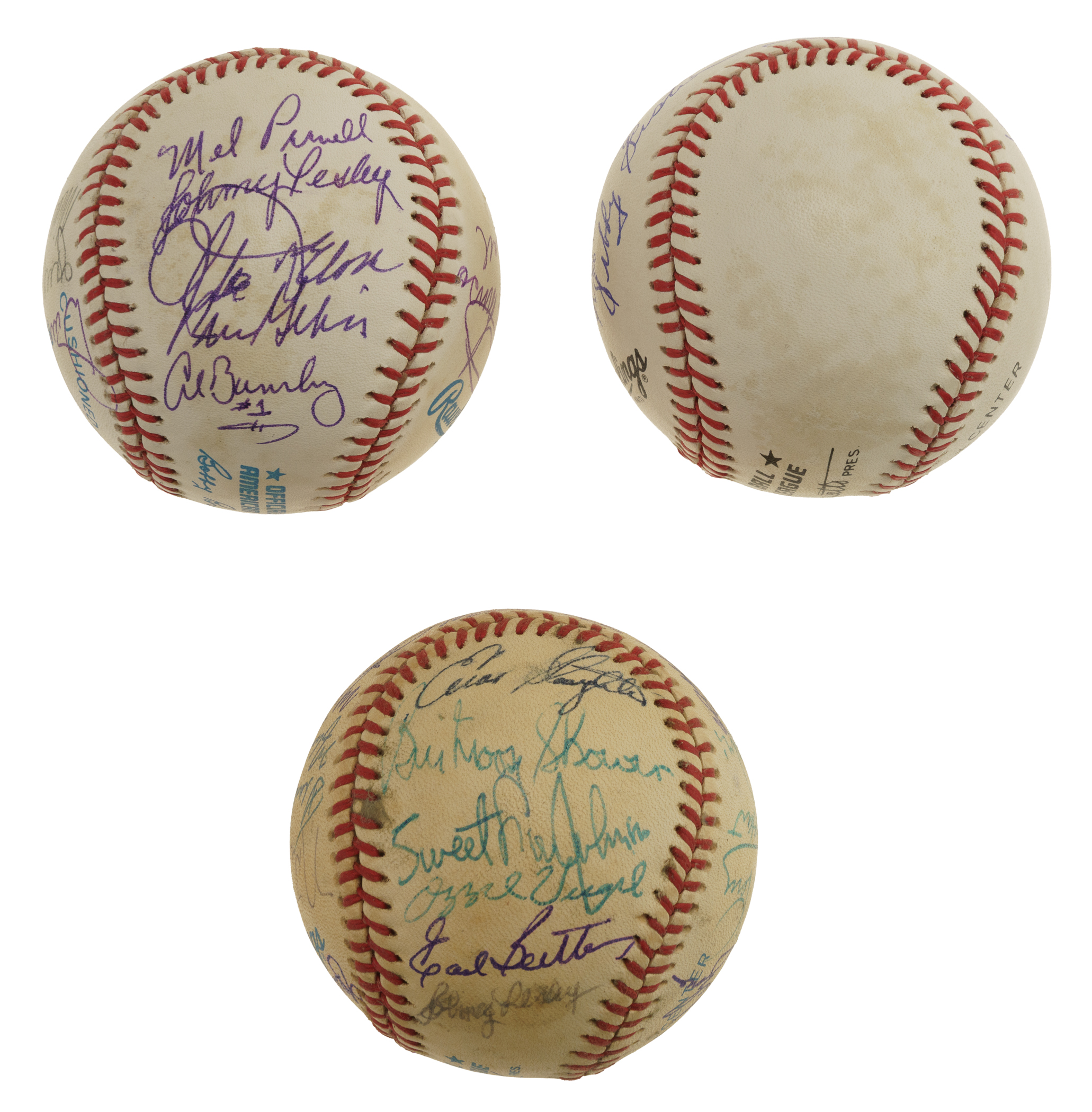 Trio of multi-signed baseballs, each signed by multiple Hall of Famers and stars. This trio consists of the following: 1) Official National League baseball (Giamatti) signed in blue ink by six players. Notable signatures include Tommy Holmes (sweet spot), Bob Feller (w/ "1988" inscription), Lou Boudreau, and Warren Spahn. The ball displays scattered patches of light toning but is otherwise in Near Mint condition overall. 2) Official American League baseball (Brown) signed in a variety of inks by 23 players. Notable signatures include Minnie Minoso (sweet spot), Enos Slaughter, Larry Doby, Bobby Doerr, Mel Parnell, Jim Perry, Nate Colbert, Tito Francona, Phil Regan, Mudcat Grant, and Pete Runnels. The ball is moderately toned throughout and is in Excellent condition overall. 3) Official American League baseball (Brown) signed by in purple and black ink 15 players. Notable signatures include Ted Williams (sweet spot), Minnie Minoso, Jimmy Piersall, Mel Parnell, Johnny Pesky, Al Bumbry, Bobby Doerr, Luis Tiant, and Enos Slaughter. The ball displays scattered patches of light-to-moderate toning but is otherwise in Excellent to Near Mint condition overall. Total: 3 balls. Auction LOA from James Spence/JSA.