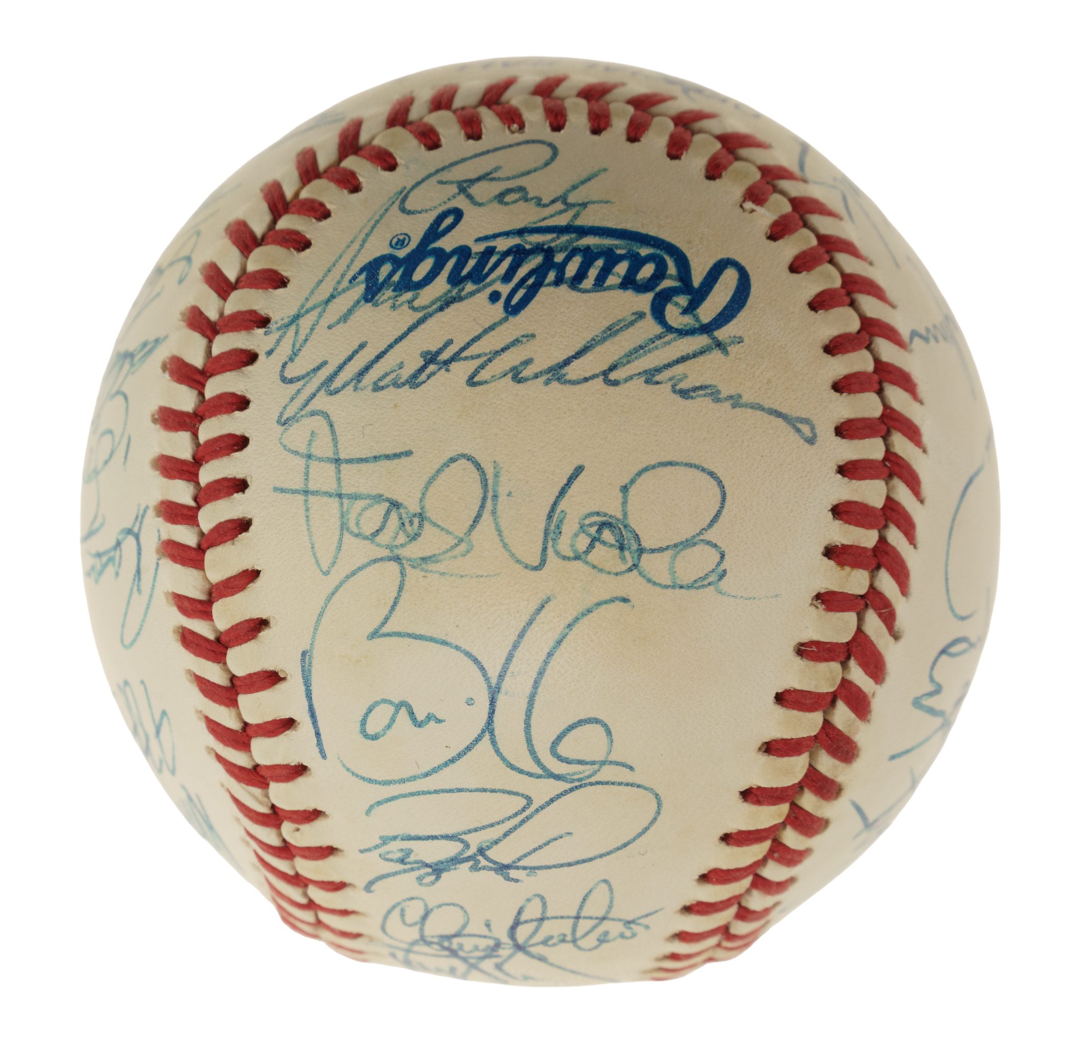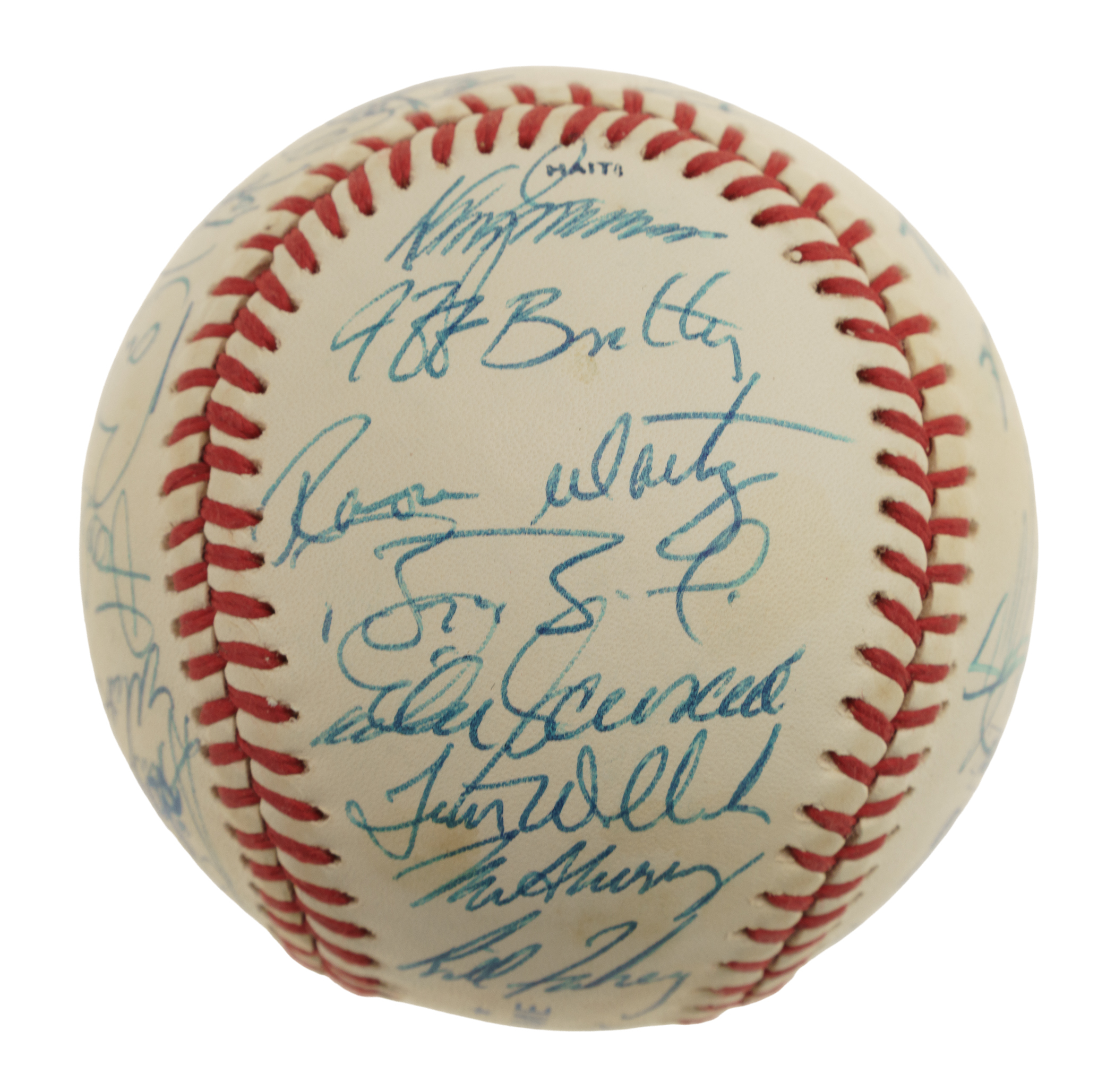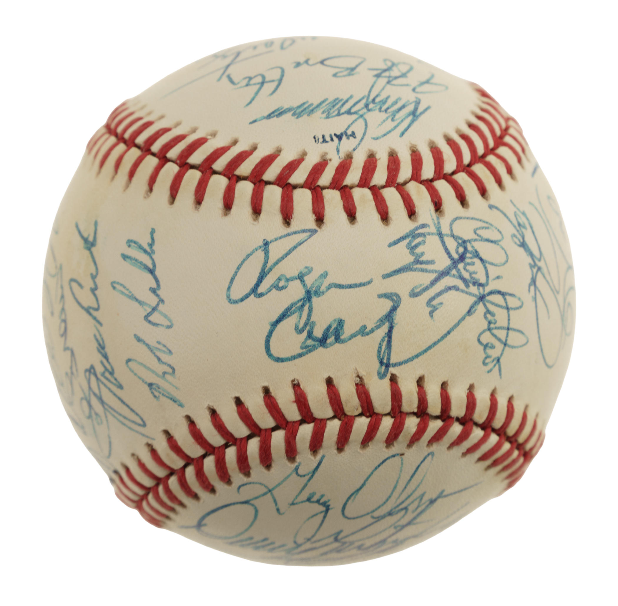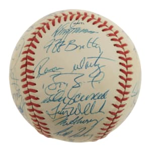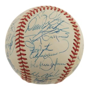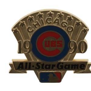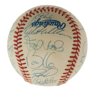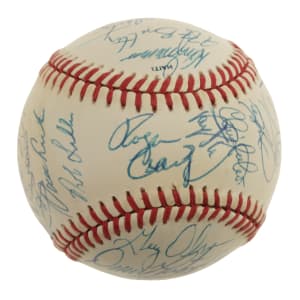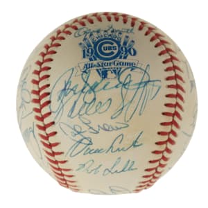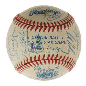 Official 1990 All-Star Game baseball signed in blue ink by 29 members of the 1990 National League All-Star team, including Roger Craig (Mgr., sweet spot), Ozzie Smith, Barry Bonds, Tim Wallach, Frank Viola, Matt Williams, Chris Sabo, Darryl Strawberry, Benito Santiago, Will Clark, Rob Dibble, Len Dykstra, Ramon Martinez, Mike Scioscia, Andre Dawson, Roberto Alomar, Tony Gwynn, Greg Olson, Dennis Martinez, Jeff Brantley, and John Franco. Also included is a press pin from the All-Star game (Nr/Mt). The ball displays a few small spots of toning but is otherwise in Near Mint condition. Auction LOA from James Spence/JSA. Total: 2 items (signed baseball and press pin).