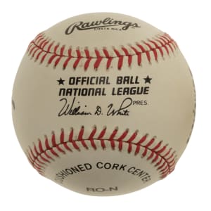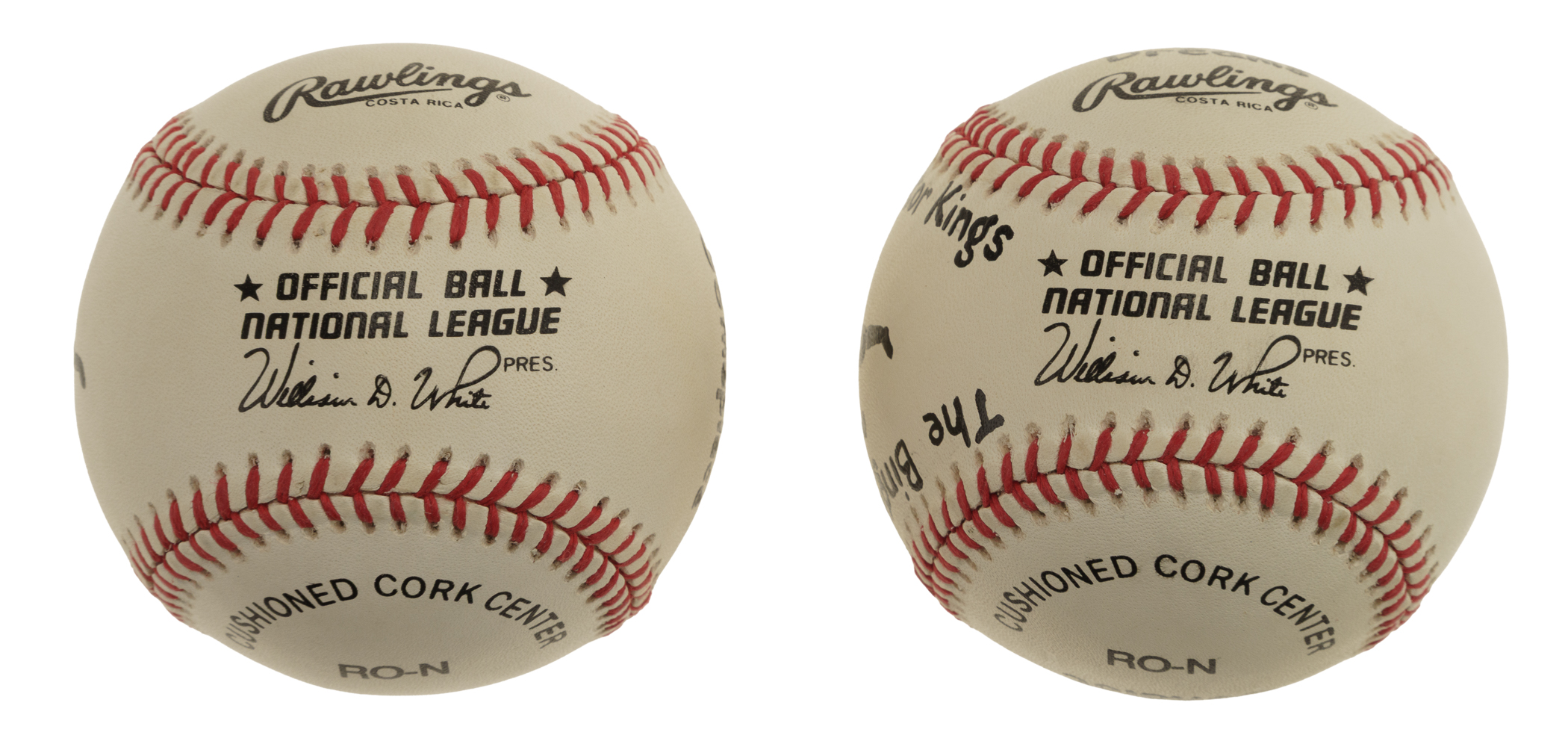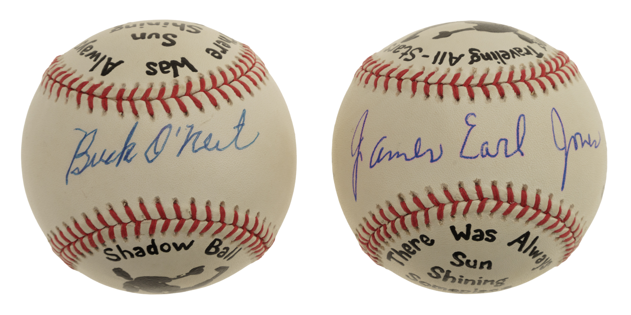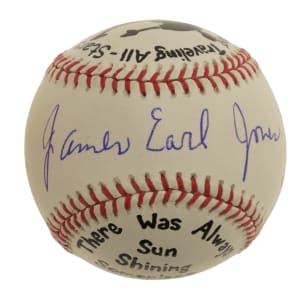 Pair of official National League baseballs (White), one signed across the sweet spot by actor James Earl Jones and the other signed across the sweet spot by Hall of Famer Buck O'Neil. Each ball commemorates the individual's career who signed it, both in pictures and words. The Jones-signed ball displays a few spots of light toning, but otherwise, both balls are in Near Mint condition. Total: 2 balls. Auction LOA from James Spence/JSA.