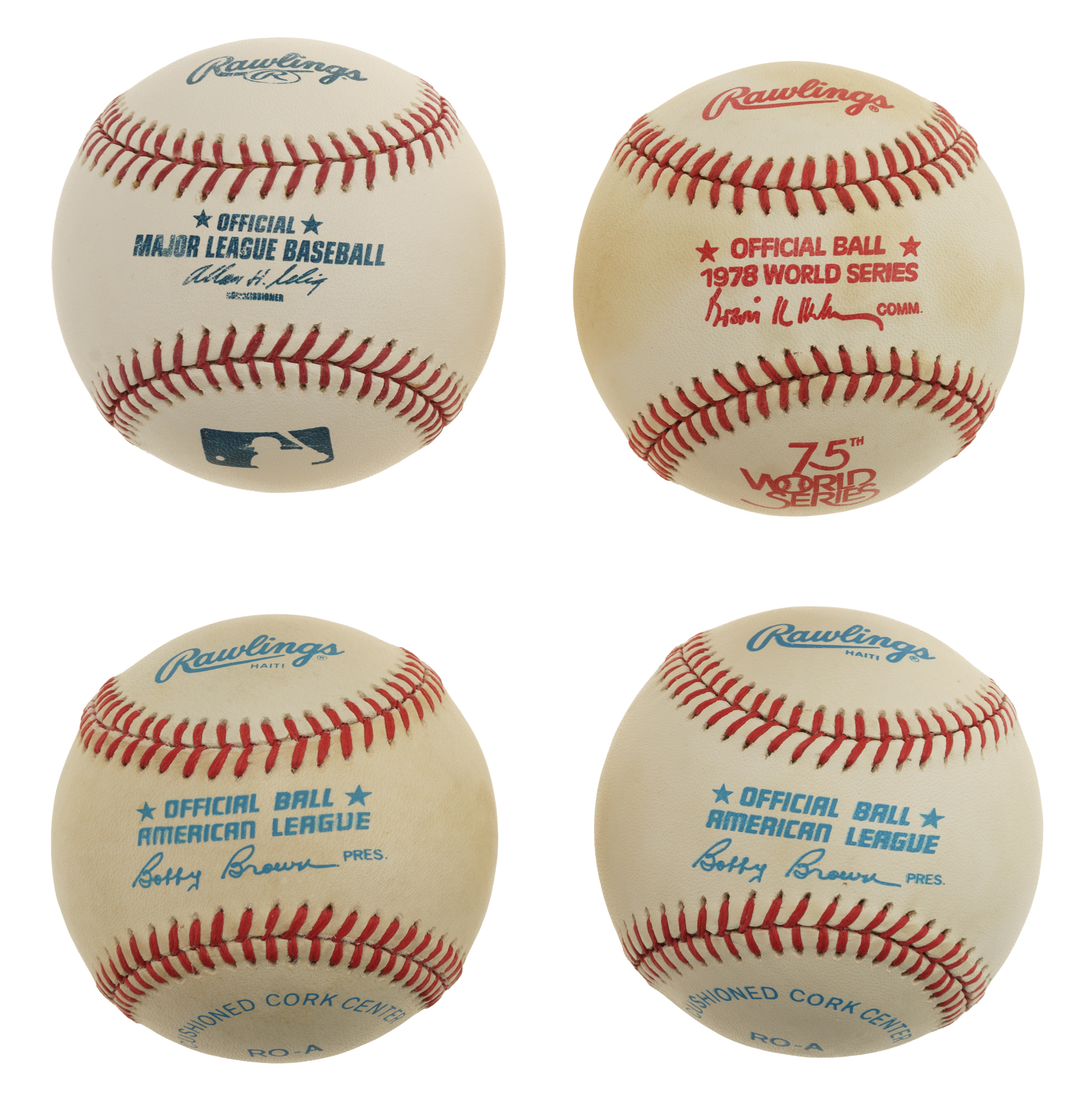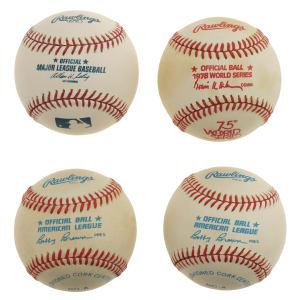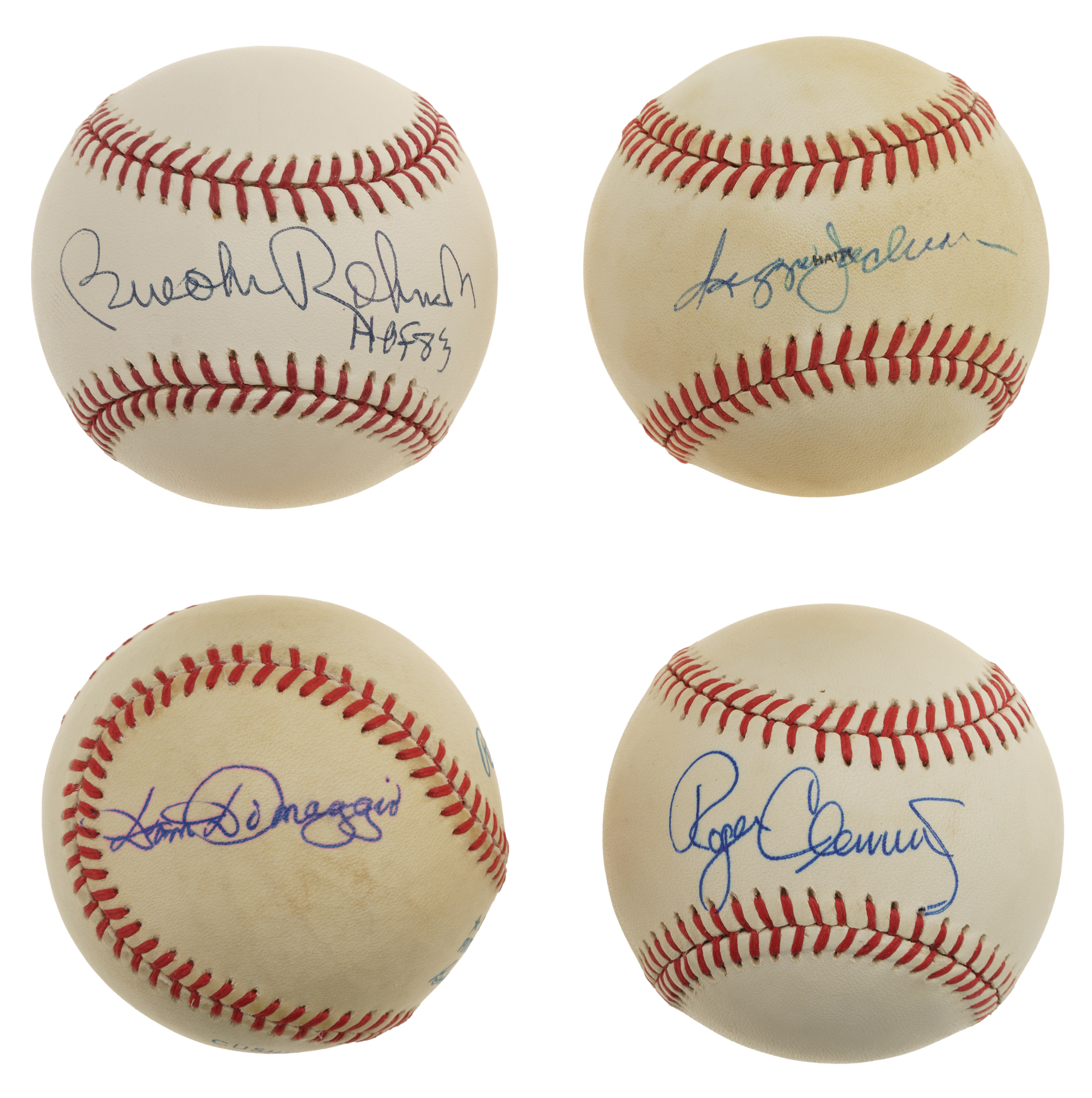 Collection of four Hall of Fame and Star single-signed baseballs. This collection consists of the following: Clemens, D. DiMaggio, Jackson (1978 World Series ball), and B. Robinson ("HOF 83" Inscription). Total: 4 baseballs. Auction LOA from James Spence/JSA. The size/weight of this item requires that there will be an additional shipping charge for this lot.