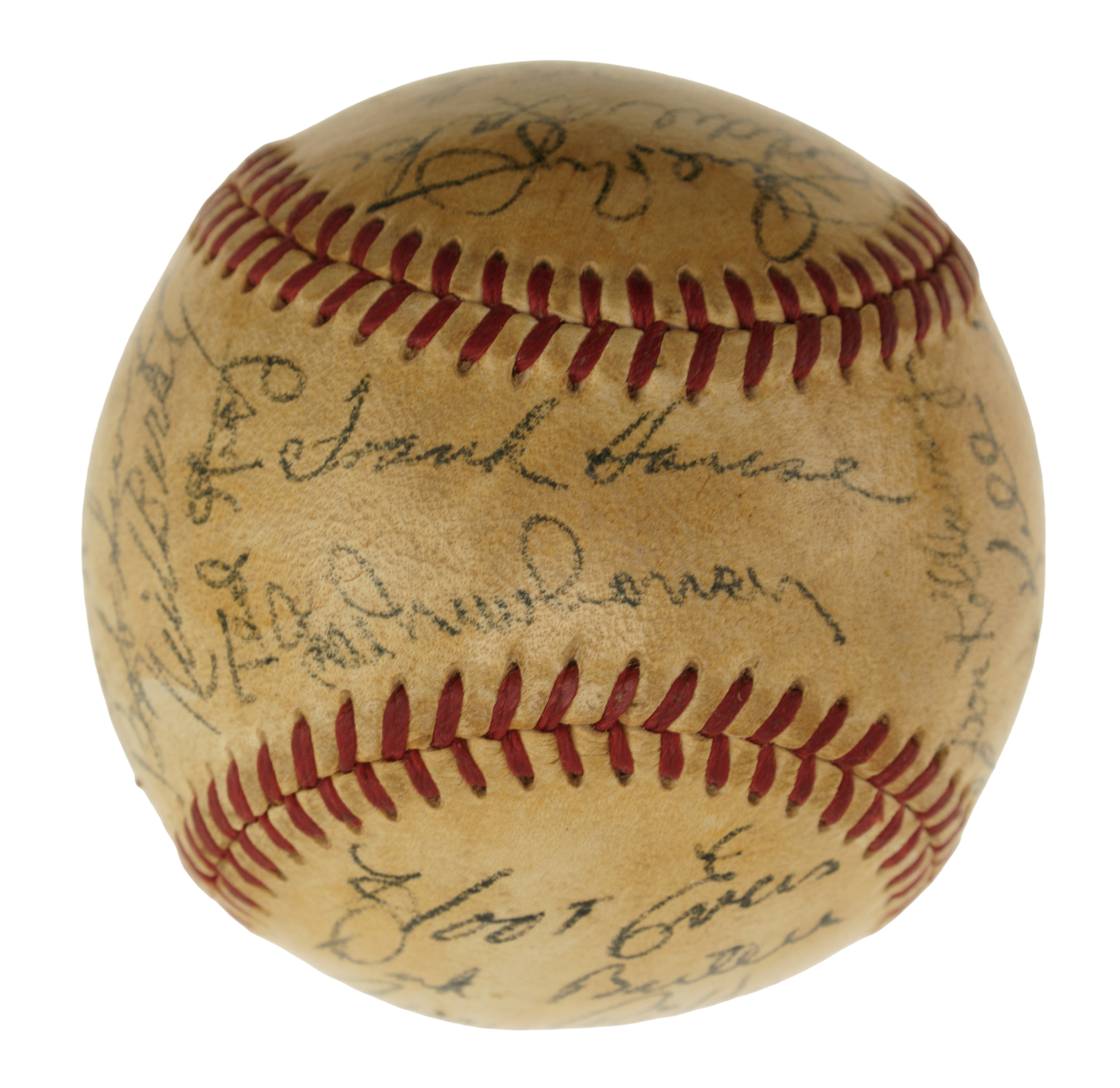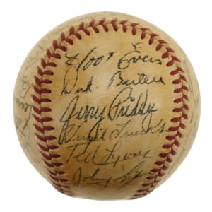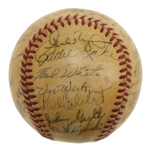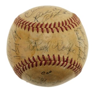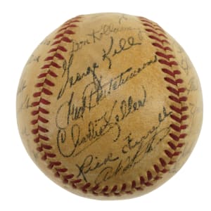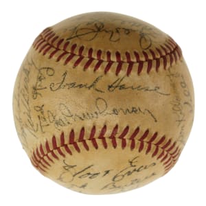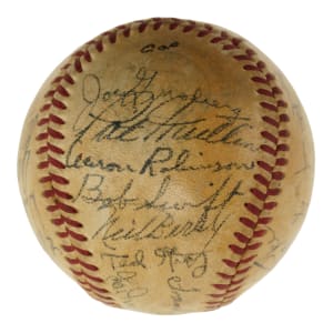 Official American League baseball (Harridge) signed in black ink by twenty-eight members of the 1950 Detroit Tigers. Notable signatures include House (sweet spot), Newhouser (sweet spot), Kolloway, Kell, Hutchinson, Keller, Ferrell (coach), Houtteman, Robinson, Evers, Bartell (coach), Priddy, Trucks, Lyons (coach), Rolfe (mgr.), Lake, White, Wertz, and Groth. Please note that Ginsberg's signature failed the James Spence/JSA authentication process. The ball has been coated with a moderate layer of protective shellac, and the league and manufacturing stampings are largely faded. Very Good condition overall. Auction LOA from James Spence/JSA.