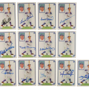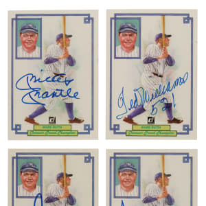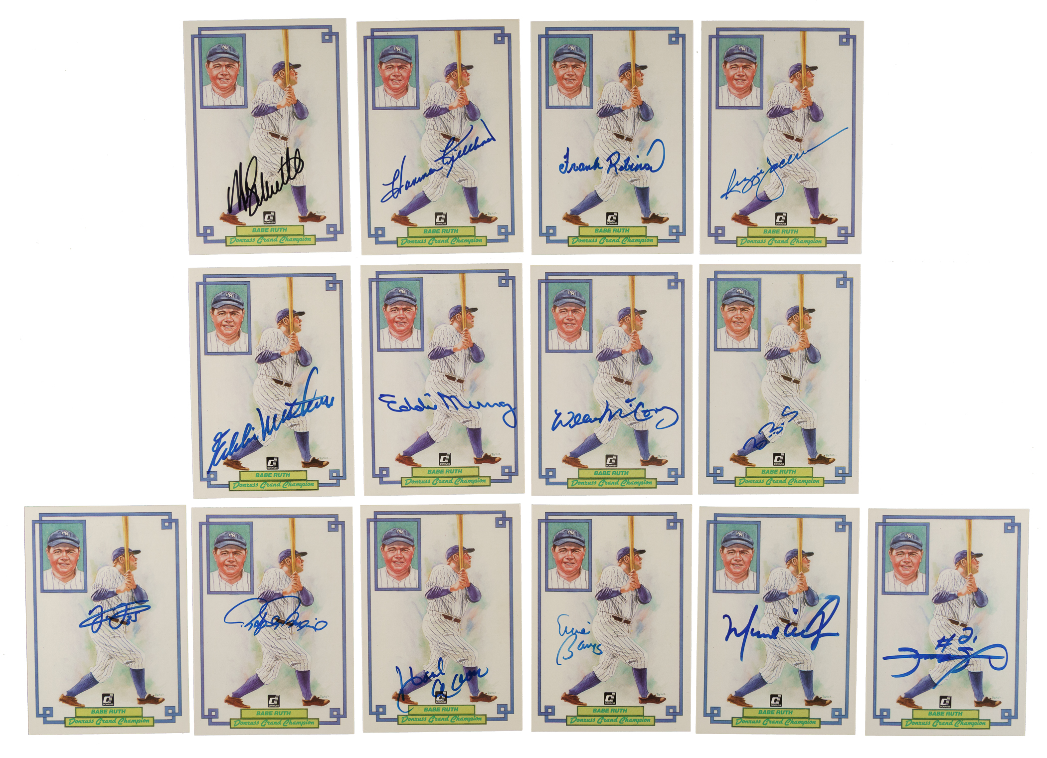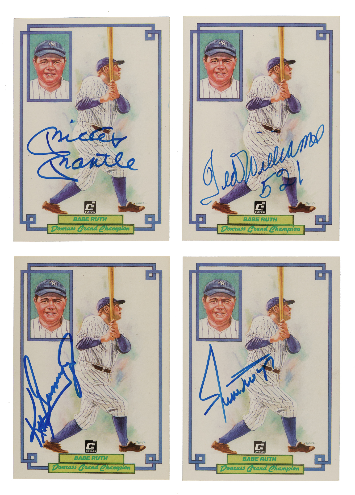 The 1984 Donruss Champions set features Dick Perez artwork of 10 "Grand Champions" alongside modern stars pursuing their records. This 60-card series holds a unique place amongst its 1980s Donruss contemporaries. Presented is a collection of 18 "Grand Champion" #1 Babe Ruth cards, each signed by a different member of the 500 home run club. The 18 cards have been single-signed by the following players: Hank Aaron, Ernie Banks, Barry Bonds, Ken Griffey Jr., Reggie Jackson, Harmon Killebrew, Eddie Mathews, Mickey Mantle, Willie Mays, Willie McCovey, Eddie Murray, Rafael Palmeiro, Manny Ramirez, Frank Robinson, Mike Schmidt, Sammy Sosa, Frank Thomas, and Ted Williams ("521" inscription). The condition of the cards ranges from Ex to Nr/Mt (averaging Ex-Mt), with a couple slightly higher and lower. Three cards (Ramirez, Sosa, and Thomas) show authentication stickers on the backs. Total: 18 cards. Auction LOA from James Spence/JSA.