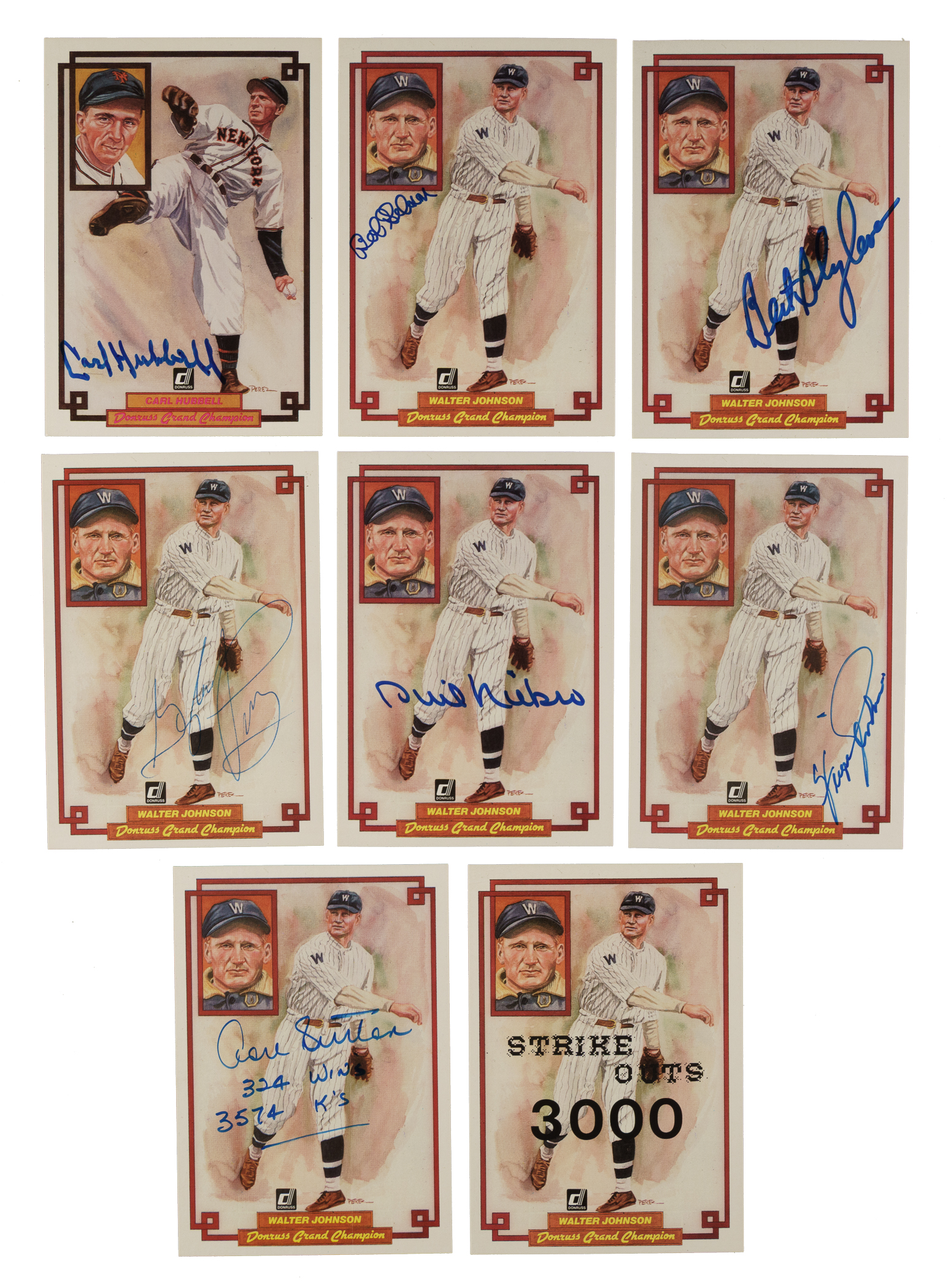 The 1984 Donruss Champions set featured Dick Perez artwork of ten "Grand Champions" alongside modern stars pursuing their records. This 60-card series holds a unique place amongst its 1980s Donruss contemporaries. Presented is a collection of ten "Grand Champion" #37 Walter Johnson cards each signed by a different member of the 3,000 strikeout club. Also included is a signed example of #55 Carl Hubbell (who is not a member of the 3,000 strikeout club) and an additional unsigned copy of #37 with "Strike Outs 3000" added on the front. This collection consists of cards signed by the following eleven players: Blyleven, Carlton, Clemens, Feller, Hubbell, Jenkins, Niekro, Perry, Ryan, Seaver, and Sutton ("324 Wins 3574 K's" inscription). The condition of the cards is Nr/Mt to Nr/Mt-Mt overall, with a couple lower. Total: 12 cards. Auction LOA from James Spence/JSA.