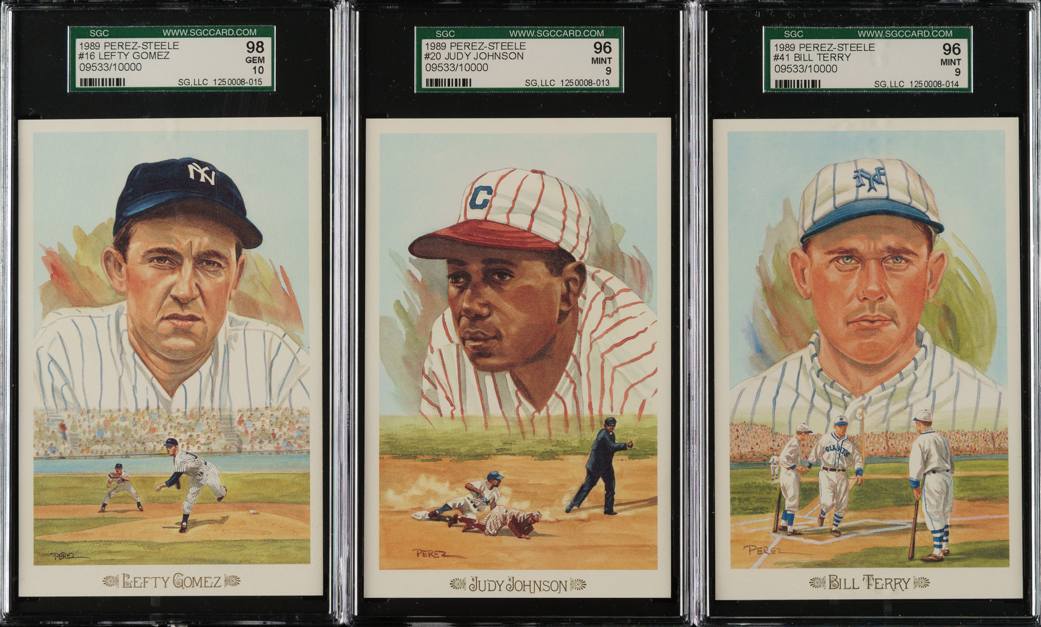 Trio of 1989 Perez-Steele Celebration postcards, each graded and encapsulated by SGC. This trio consists of the following: Gomez (GEM 98), Johnson (MINT 96), and Terry (MINT 96). Total: 3 postcards.