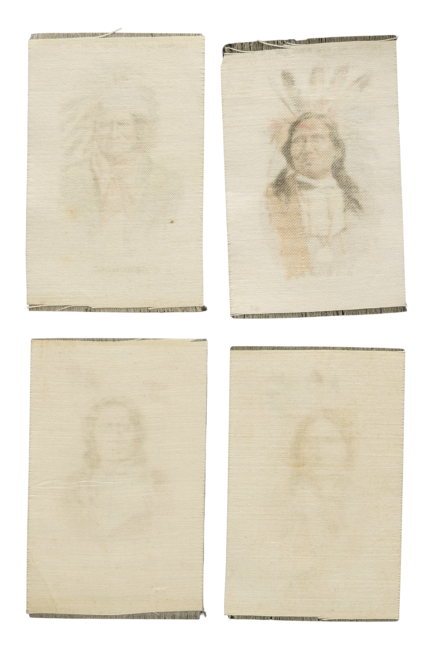 Presented is a near-complete set of S67 Indian Chiefs silks, circa 1910, consisting of forty-eight different silks (out of fifty in the set). Missing two silks for completion (#17 Black Eye and 37 Striker). Issued by the American Tobacco Company, one silk was included in each package of Tokio Cigarettes. This colorful issue uses the same artwork as the N2 Allen & Ginter American Indian Chiefs series issued in 1888 and features many legendary American Indian Chiefs. Included are Geronimo, Red Cloud, Sitting Bull, Chief Joseph, and many more. Each silk measures approximately 2 x 3.25 inches. We have found this issue to be particularly challenging to find as a complete or near-complete set compared to other Indian silks. This is a very attractive near-complete set, bright and clean with outstanding color, ranging from Vg to Ex-Mt condition (averaging Vg-Ex), with a couple lesser and one trimmed. Total: 48 silks.