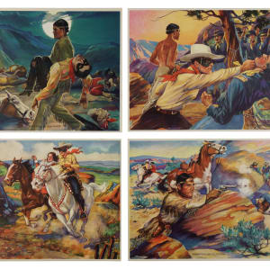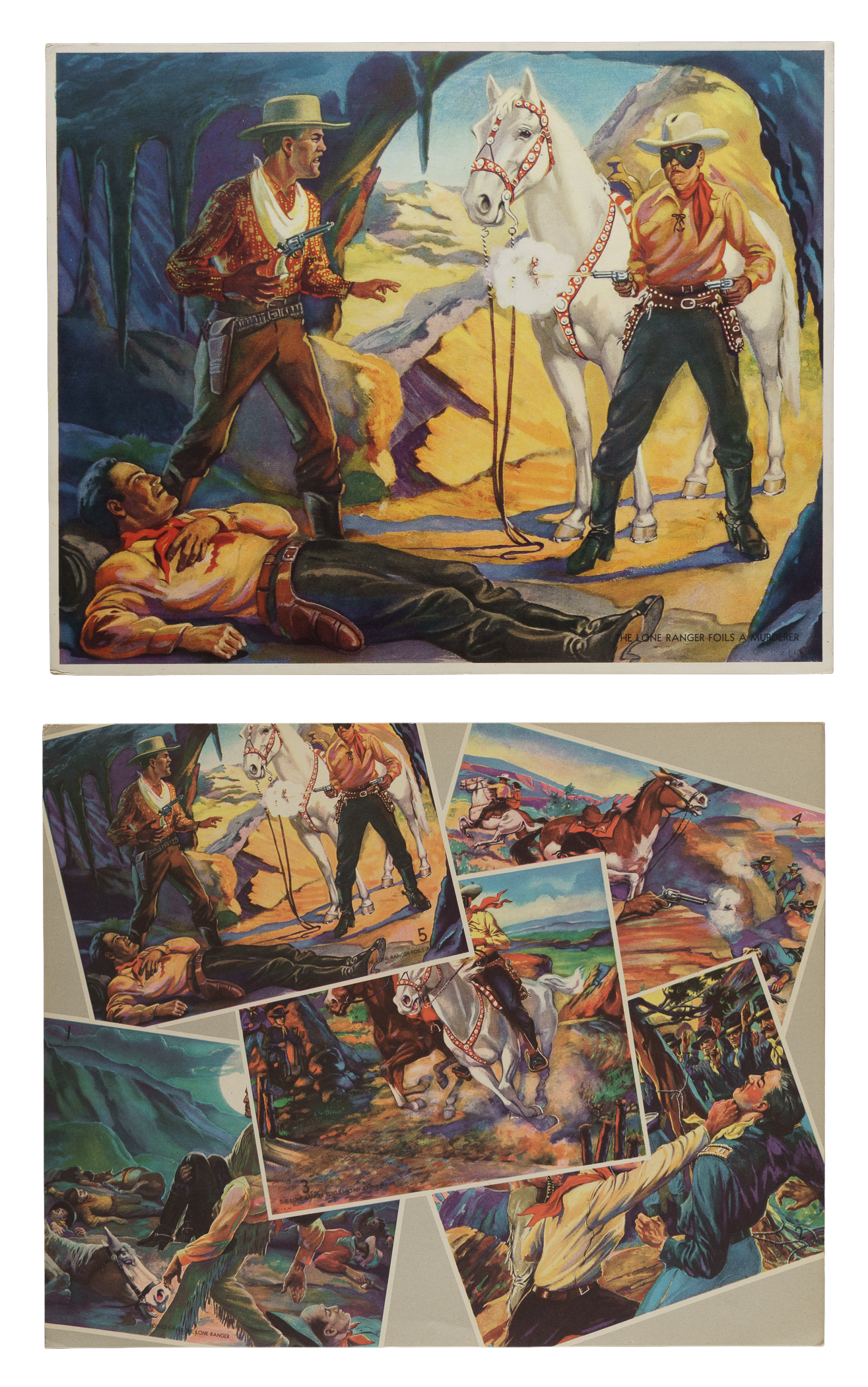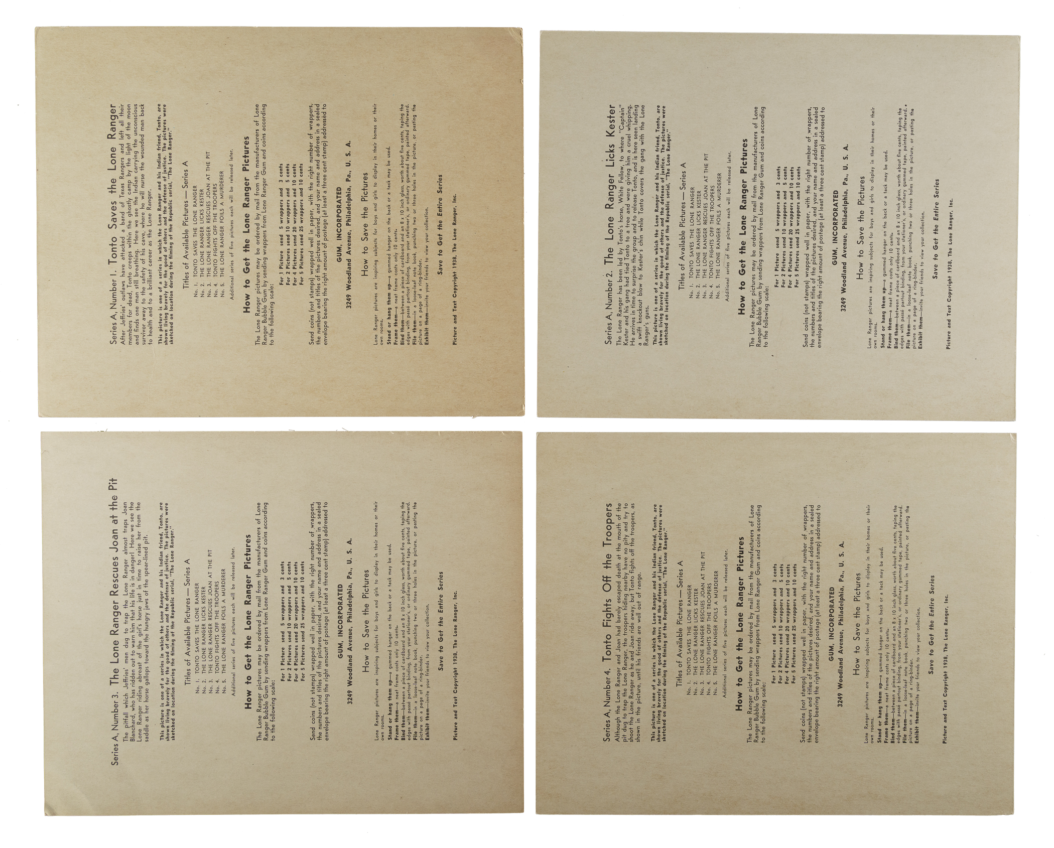 Extremely attractive complete set of all five R83A Gum, Inc., "Lone Ranger" premiums along with a rare store advertising promo sheet. Regarded by collectors as among the most visually appealing of all 1930s premiums, the R83A series is comprised of five 8 by 10-inch premiums depicting scenes from The Lone Ranger film in brilliant color and detail. The reverse features a description of the scene, a checklist of the titles included in the series and instructions on how to obtain and display the premiums. These premiums are also particularly rare, which is no doubt related to how they were distributed. A complete set could be obtained for 25 wrappers and 10 cents. "Lone Ranger" premiums are often encountered in modest grade due to their size. Condition Report: #1 Tonto Saves the Lone Ranger (Vg), 2 The Lone Ranger Licks Kester (Vg+), 3 The Lone Ranger Rescues Joan at the Pit (1/8-inch tear of right edge, otherwise Vg), 4 Tonto Fights Off the Troopers (Vg), and 5 The Lone Ranger Foils a Murderer (Vg). The colors on all five premiums remain vibrant. The accompanying advertising sheet also grades Very Good. This complete set of premiums and one advertising sheet are ideal for display and would make an outstanding accompaniment to the classic smaller-format R83 Gum, Inc. "Lone Ranger" set (as intended by Gum, Inc.) or significant addition to any nonsport collection. Total: 6 items (5 premiums and one advertising sheet).