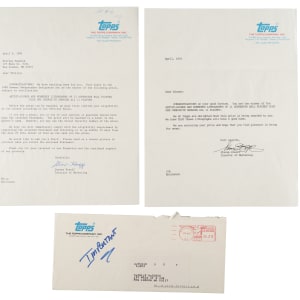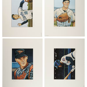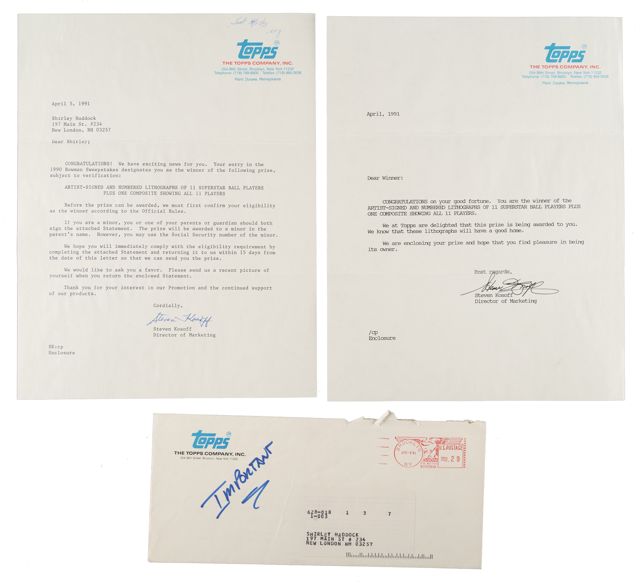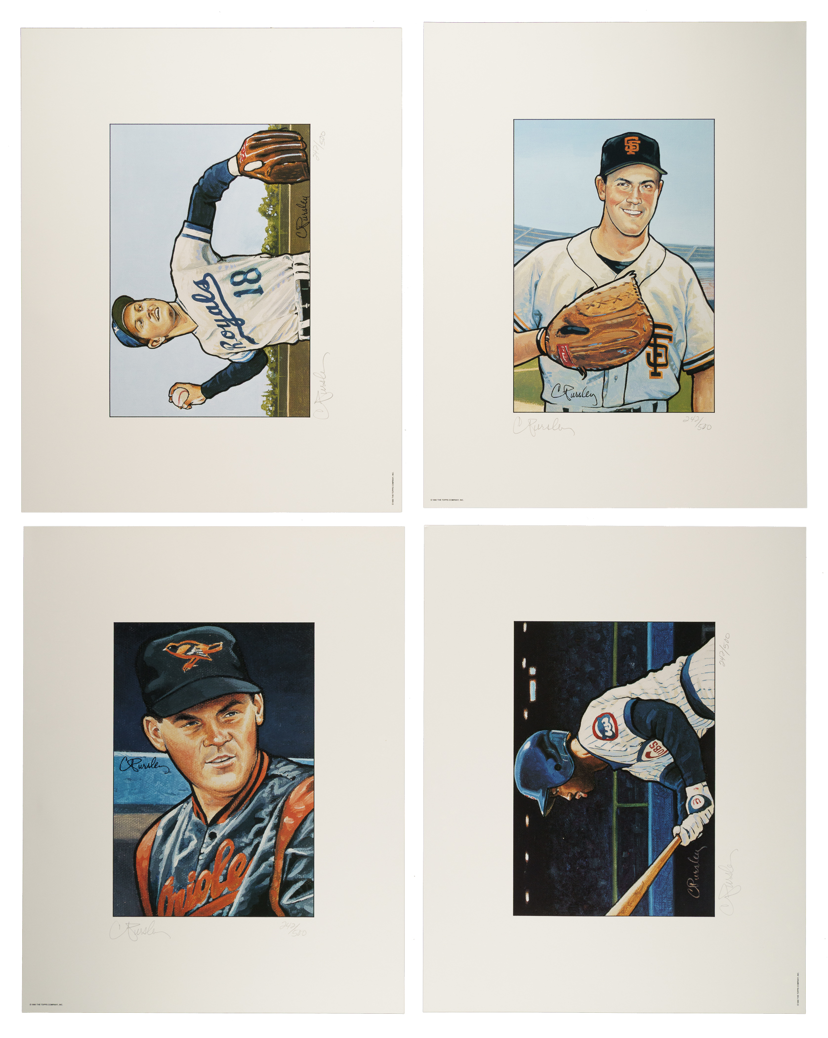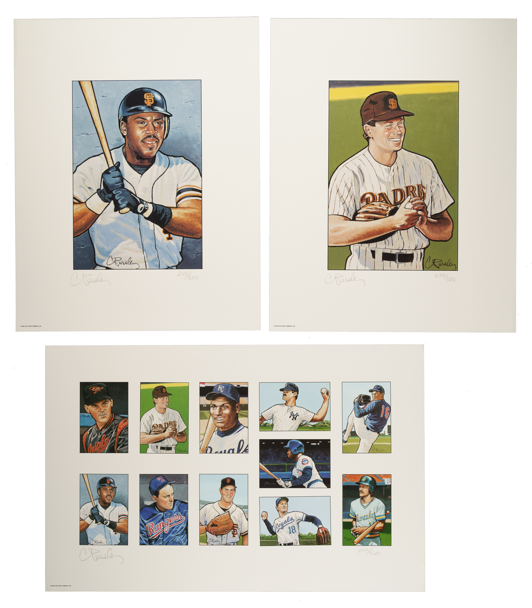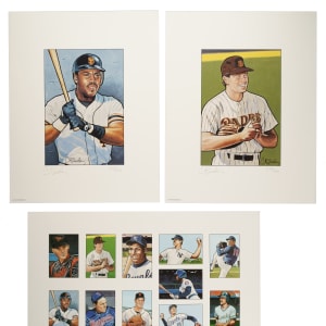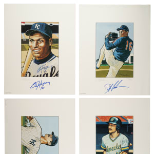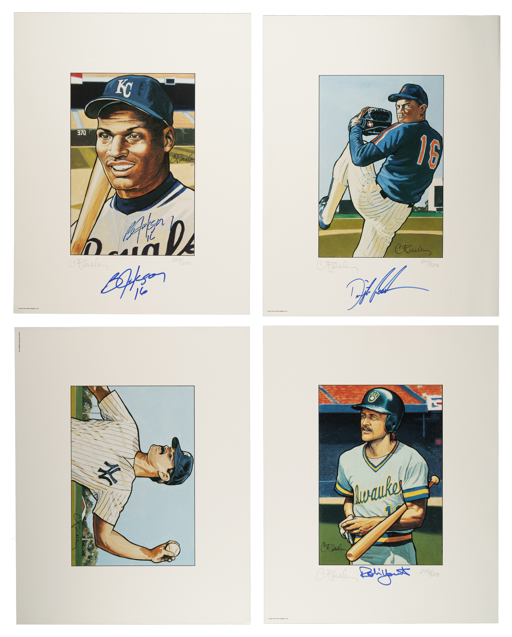 Presented is a near-complete set of 1990 Bowman lithographs, missing only Nolan Ryan for completion. Also included is a composite lithograph (11 x 17 inches) that combines all the portraits from the series into a single piece. With the exception of Don Mattingly, each lithograph is hand-numbered "242/500" and signed by the artist, Craig Pursley. The 1990 Bowman lithographs (11 x 14 inches) were originally issued through hobby dealers, a wrapper redemption offer, and as sweepstakes prizes. Bo Jackson (twice), Robin Yount, and Dwight Gooden have each signed their lithograph in blue marker. Near Mint condition overall. Total: 11 lithographs. Auction LOA from James Spence/JSA.