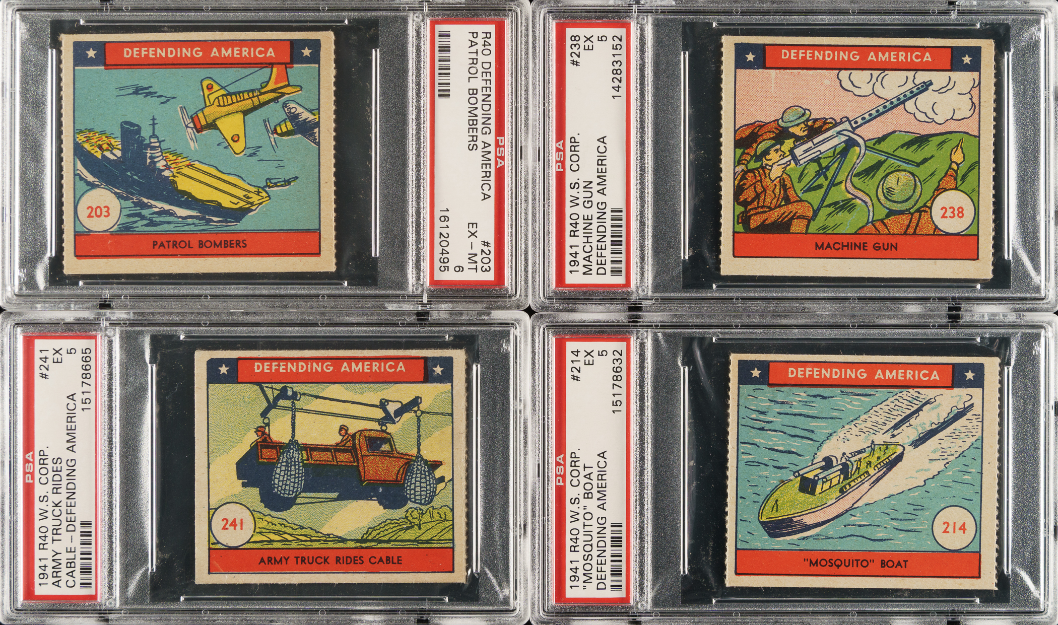 Complete set of forty-eight cards from the R40 "Defending America" series. Each card measures 2-3/8 x 2-15/16 inches and features a colorful illustration of military scenes and weaponry. Condition is 18% Ex-Mt or slightly better, 46% Vg-Ex to Ex, 27% Gd to Vg, and 9% lesser. Five cards have been professionally graded and encapsulated by PSA: #203 (EX-MT 6), 214 (EX 5), 238 (EX 5), 240 (EX 5), and 241 (EX 5). This is a very consistent and attractive set of this classic patriotic issue. Total: 48 cards.