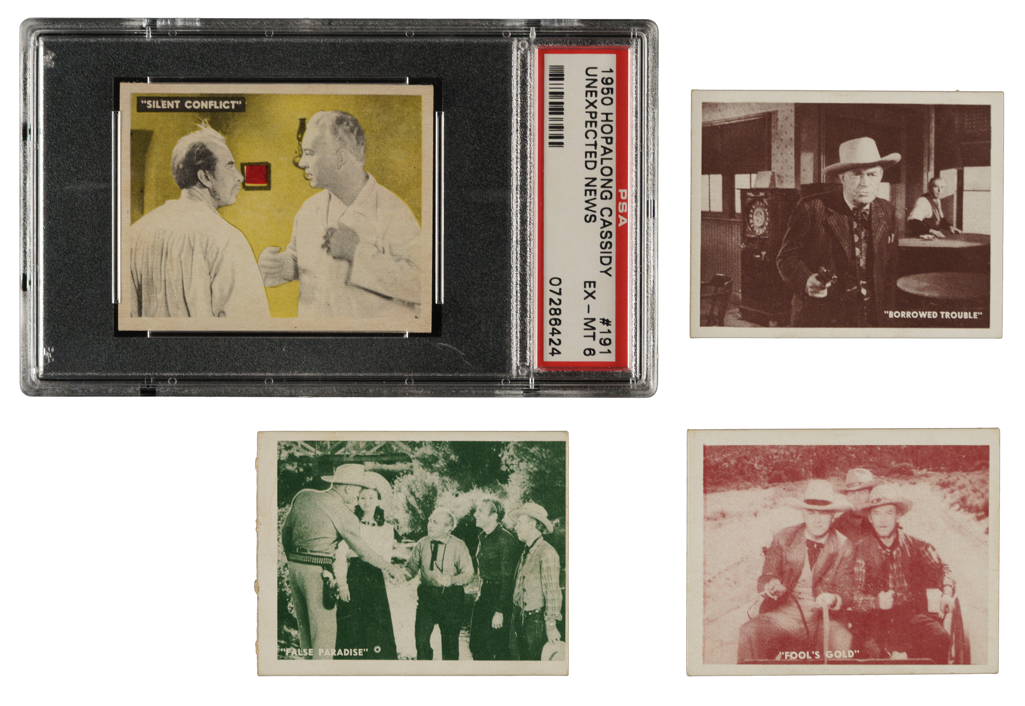 Complete set of this very early Topps issue featuring William Boyd as Hopalong Cassidy. "Hoppy" was very popular with kids and was a natural to be the subject of a card set in the earliest days of the Topps Gum Company. Also included with the set are all eight scarce unnumbered foil cards (which are considered by most to be a separate issue), three Fyna Foods (Australia) "Hoppy Western" cards (episodes 1 [Vg-Ex], 12 [Vg], and 16 [Ex] of "Silent Conflict"), and four original wrappers. The complete 230-card (#1-230) "Hopalong Cassidy" set narrates ten different stories. Cards feature photographs from both the movies and the TV show. The condition of the set is 14% Ex-Mt or slightly better, 59% Vg-Ex to Ex, and 27% Gd to Vg (including a couple lesser). One card has been professionally graded and encapsulated by PSA: #191 (EX-MT 6). The condition of the foil header cards is: Dangerous Venture (Vg-Ex), Borrowed Trouble (Gd), Hoppy's Holiday (Vg+), False Paradise (Gd+), Unexpected Guest (Vg-Ex), Devil's Playground (Vg), The Dead Don't Dream (Vg-Ex), and Fool's Gold (Fr). Includes the following four flattened wrappers: green one-cent wrapper (Vg-Ex), white one-cent wrapper (slightly trimmed and repaired with tape, otherwise Vg), five-cent wrapper (trimmed and altered, otherwise Gd), and 1950s candy wrapper (Pr-Fr). This is a very tough set, rarely offered complete in any grade, and of enormous significance as one of the earliest card sets ever issued by Topps. Total: 245 Items (241 cards and four wrappers).