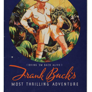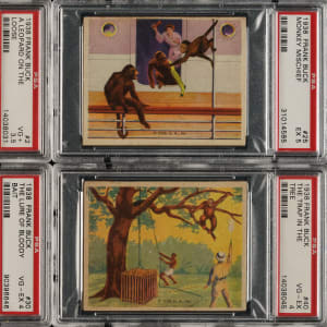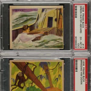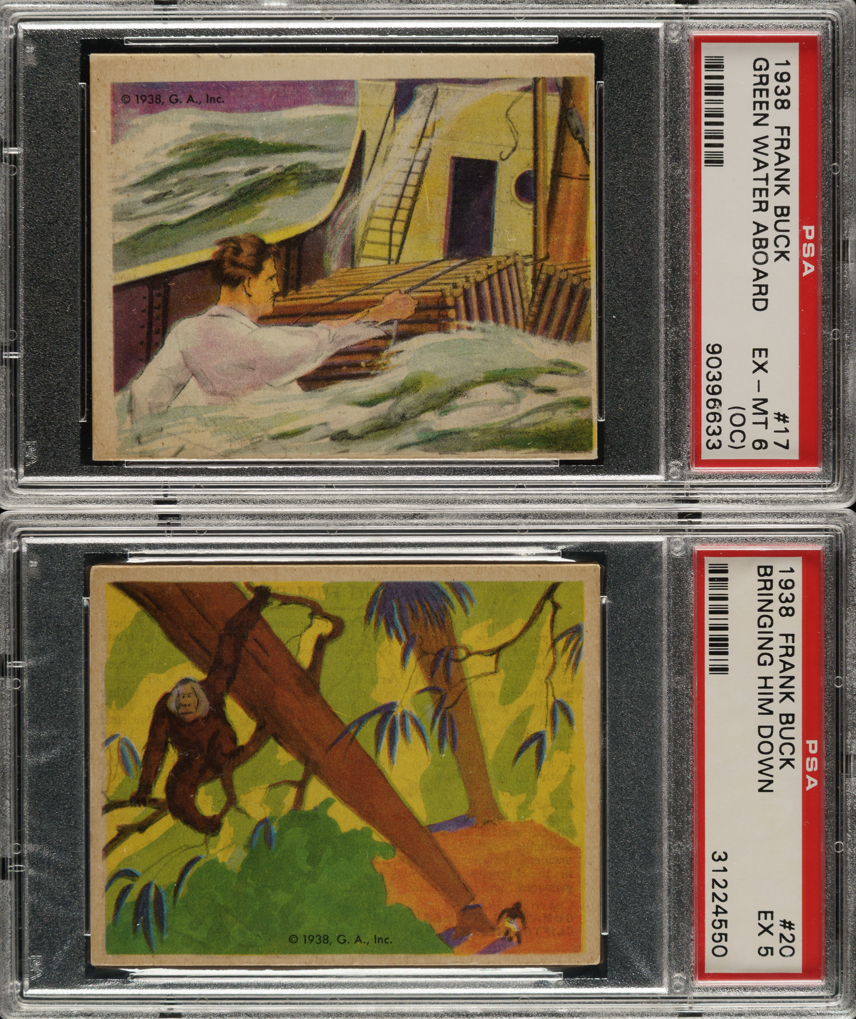 Complete 48-card set of the R55 Frank Buck "Bring 'Em Back Alive" series, issued by Gumakers of America in 1938. The Frank Buck "Bring 'Em Back Alive" series was based on the adventures of Frank Buck, the world's greatest hunter, and the fascinating stories of his encounters with the ferocious beasts of the jungle. Also included is an original 1934 "Official Handbook for members of Frank Buck's Adventurers Club." The booklet shows a pinhole in the cover, otherwise grading Vg-Ex. Six cards have been professionally graded and encapsulated by PSA: #2 (VG+ 3.5), 17 (EX-MT 6 [OC]), 20 (EX 5), 25 (EX 5), 30 (VG-EX 4), and 40 (VG-EX 4). The condition of the forty-two card balance is Vg to Vg-Ex overall, with a couple slightly higher and lower. This is a very attractive mid-grade complete set of one of the era's most popular nonsport-card issues. Total: 48 cards plus handbook.