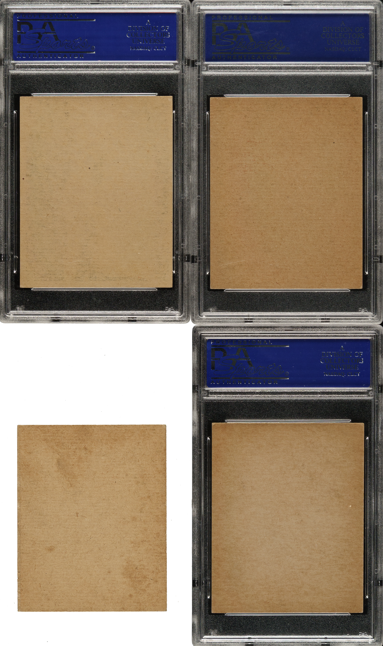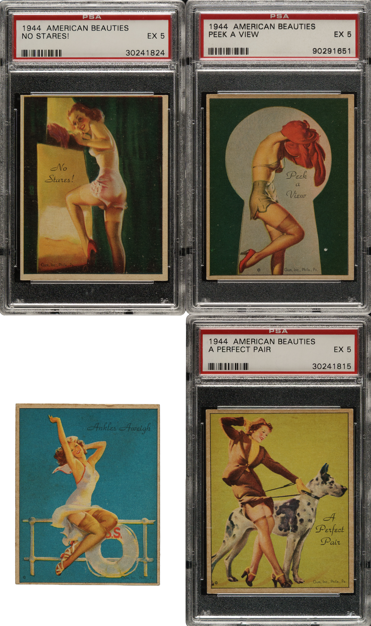 Complete set of this beautiful full-color classic 1940s “girlie” issue. In the style of arcade cards of the era, in 1944 Gum, Inc. issued cards featuring beautiful pinup artwork by the top illustrators of the day. The public’s appetite for pinup art exploded during this era, with images by artists such as Gil Elvgren, Zoe Mozert, and Earl Moran appearing on everything from matchbook covers to ink blotters to calendars. To avoid potential criticism from the general public, Gum, Inc. sold these very risqué cards in tobacco stores rather than in candy stores where kids frequently visited. This outstanding high-quality set is crisp and clean with vibrant colors. Condition is 13% Nr/Mt, 45% Ex to Ex-Mt, and 42% Vg to Vg-Ex (including 17% lesser, one trimmed, and some with 100/0 centering). Three cards have been professionally graded and encapsulated by PSA. PSA-graded cards: A Perfect Pair (EX 5), No Stares! (EX 5), and Peek a View (EX 5). Total 24 cards. The size/weight of this item requires that there will be an additional shipping charge for this lot.