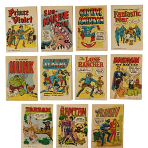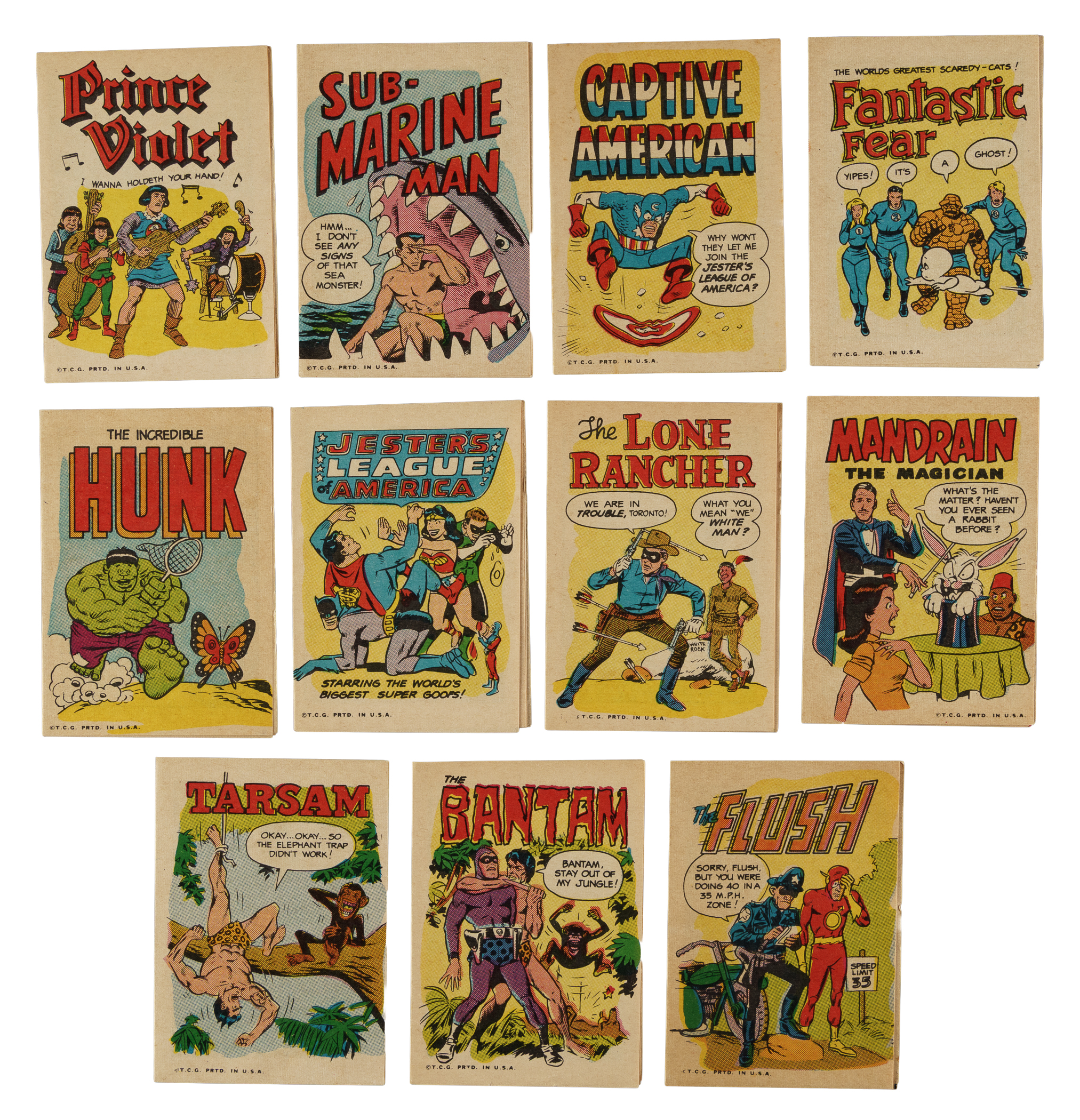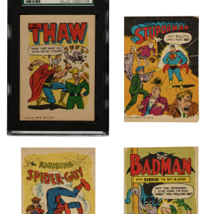 Presented is a remarkable complete set of one of the rarest and most fascinating of all Topps Test nonsport issues: The 1967 Topps "Krazy Little Comics" set. The set consists of sixteen eight-page booklets that are designed as mini comic books. Each booklet is a spoof on a particular comic book super hero with titles such as "Amusing Spider-Guy," "Badman," "Captive America," and the "Incredible Hunk." Each booklet is extremely fragile due to its stock and is naturally susceptible to damage. The condition of the set is one Nr/Mt ("The Meekly Thaw," graded SGC NM 84), seven Ex to Ex-Mt, six Vg to Vg-Ex, and two slightly lesser. Almost all of the booklets are bright and crisp but have been downgraded due to minor technical concerns, such as a crease or tiny tear. The example of "Blunder Woman" is in its original uncut proof form prior to being assembled into a booklet. The "Blunder Woman" sheet (5 x 7.5 inches) is bright, crisp, and clean, with vibrant colors, and square corners. Light wrinkles are visible, mentioned strictly for accuracy. This uncut sheet was originally saved by Topps as an example for their files but was later sold by the company after opening the Topps Vault. The sheet is accompanied by a COA from the Topps Vault affirming its special provenance. The "Krazy Little Comics" booklets are among the scarcest and most desirable of all 1960s Topps Test nonsport issues, and this set would be an outstanding addition to any advanced nonsport-card collection. Total: 16 booklets.
