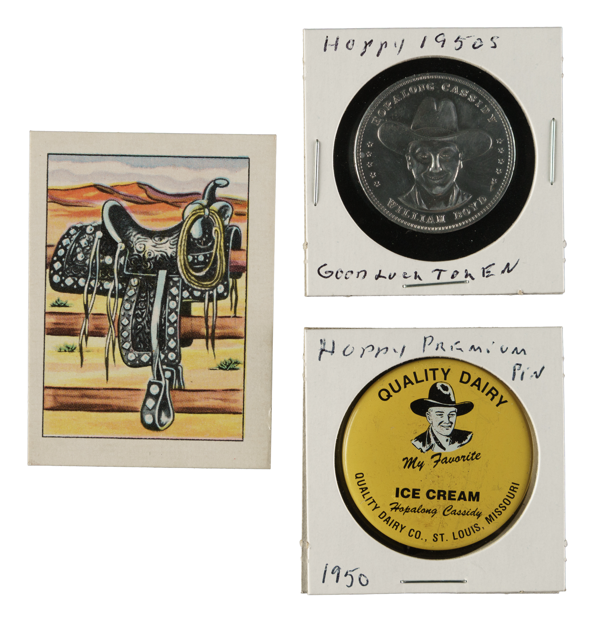 Complete 36-card set of 1951 Post Cereal "Hopalong Cassidy Wild West" trading cards. Also includes seven rare Canadian variations (#9, 11, 21, 23, 27, 29, and 34), a premium pin, and a good luck token. Condition is 8% Ex to Ex-Mt, 23% Vg to Vg-Ex, and 69% Gd. Condition of Canadian variations ranges from Vg to Ex-Mt (averaging Vg-Ex), including one lesser. This is very attractive complete set of this popular 1950s nonsport-card issue. Total: 45 items (complete set of 36 plus 7 variations, one pin, and one coin). The size/weight of this item requires that there will be an additional shipping charge for this lot.