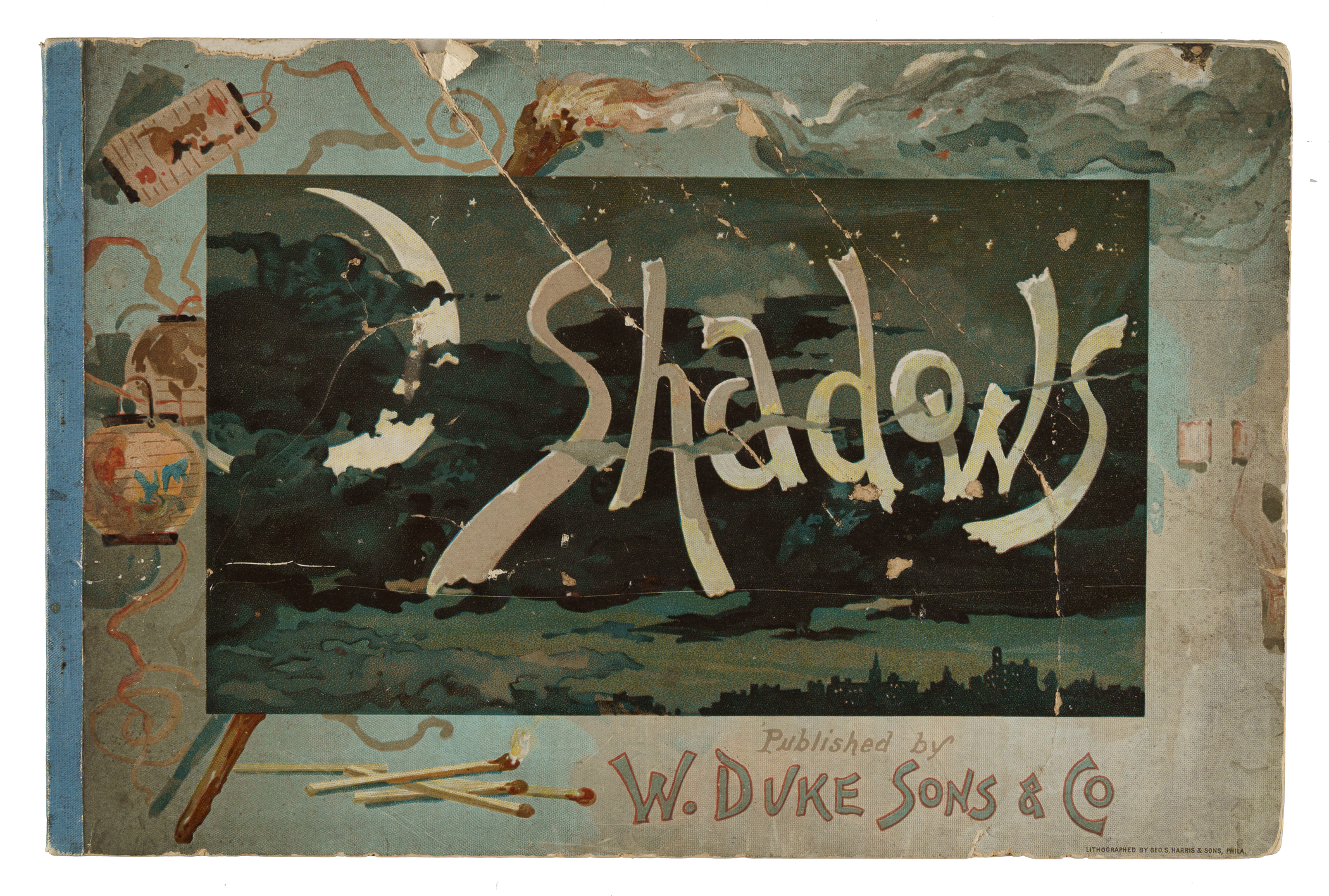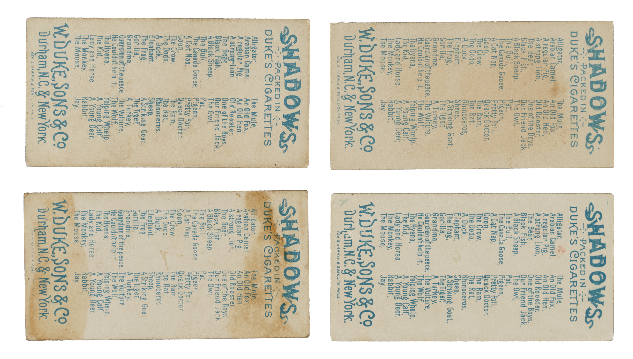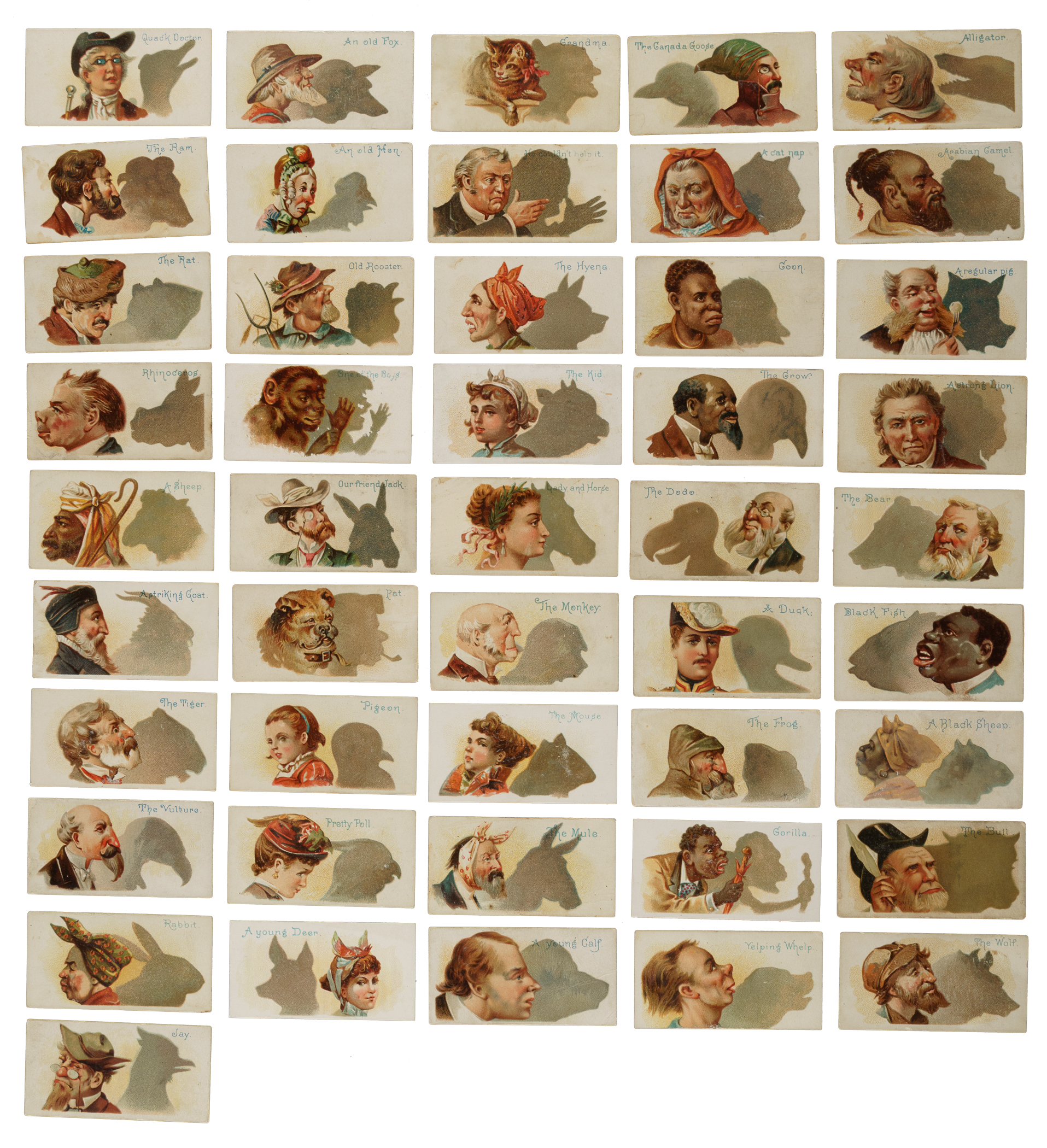 Complete set of fifty 1888 N87 Duke "Shadows" cards. Rarely offered set of these very unusual and amusing nineteenth-century tobacco cards which so effectively provide a window into the culture and humor of America in the 1880s, as well as its shortcomings: Of particular note is the extreme racism that is reflected by four cards in the set. Issued with Duke's Cigarettes, each card illustrates a head shot with title of an individual in the foreground, casting a shadow of a different animal in the background, designed to provide a humorous effect (reminiscent of similar visual gags that appeared in Mad magazine many decades later). The back of each card features a checklist of the set. Condition is 24% Vg-Ex to Ex, 54% Gd to Vg, and 22% lesser. Also included is a rare tobacco premium album issued by W. Duke Sons & Co. for this "Shadows" card set. In the 1880s, in addition to insert cards, tobacco companies also offered special albums available only by mail in exchange for coupons (usually 75 or 100) which were packed with tobacco one coupon per pack. Each premium album features images of all of the subjects (usually 50 different) in a given set, along with additional background artwork. These souvenir albums were the top prizes offered by the tobacco companies, and have long been highly valued by collectors. Many collectors are familiar with the few albums featuring baseball players as they are very popular and expensive. The nonsport albums are just as scarce. This "Shadows" album, classified as A31, pictures the complete set of fifty cards. The album is in modest condition overall, with most of the condition issues confined to the covers, which display heavy creasing, small spots of paper loss, and a couple of small pieces missing from the perimeter. The binding is partially detached. The interior pages are clean and display vibrant colors, with wrinkles across each corner. This is an extremely unusual and very rarely offered complete set and premium album. Total: 50 cards plus album.
