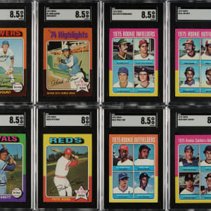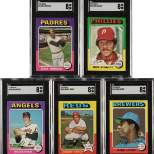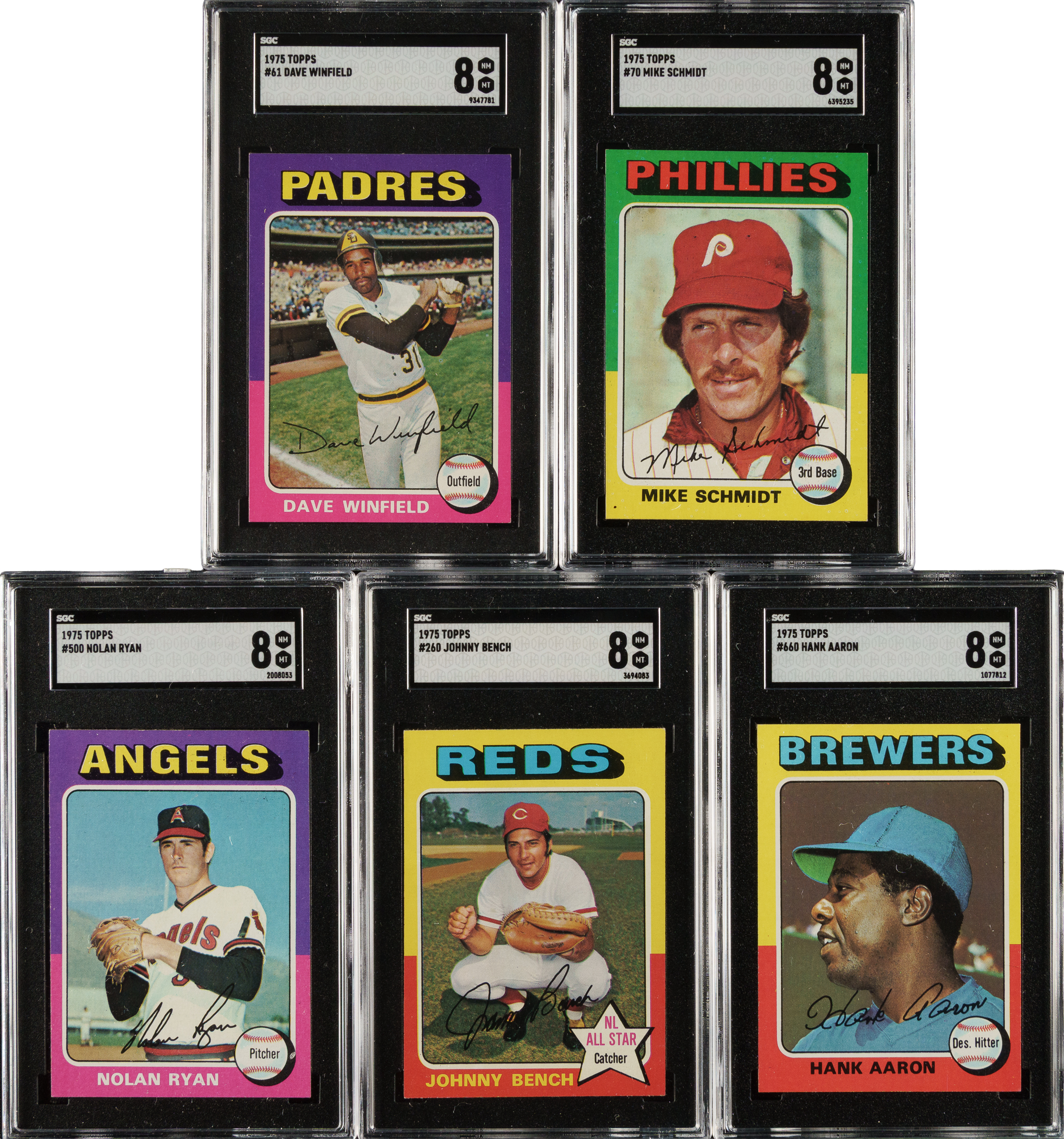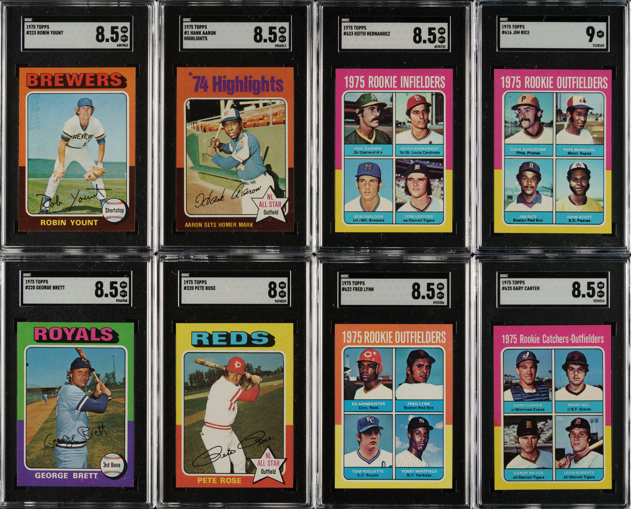Presented is an extraordinary ultra-high-grade complete set of 1975 Topps baseball cards. This is one of the finest complete sets of this popular issue we have ever offered! The colored flush-to-the-border design of the 1975 Topps set makes it particularly challenging to collect in extremely high grade. This classic set features all the stars of the era, including rookie cards of Hall of Famers George Brett, Robin Yount, Gary Carter, and Jim Rice, and stars such as Hank Aaron, Nolan Ryan, Reggie Jackson, and Mike Schmidt. All 660 cards have been professionally graded and encapsulated by SGC.