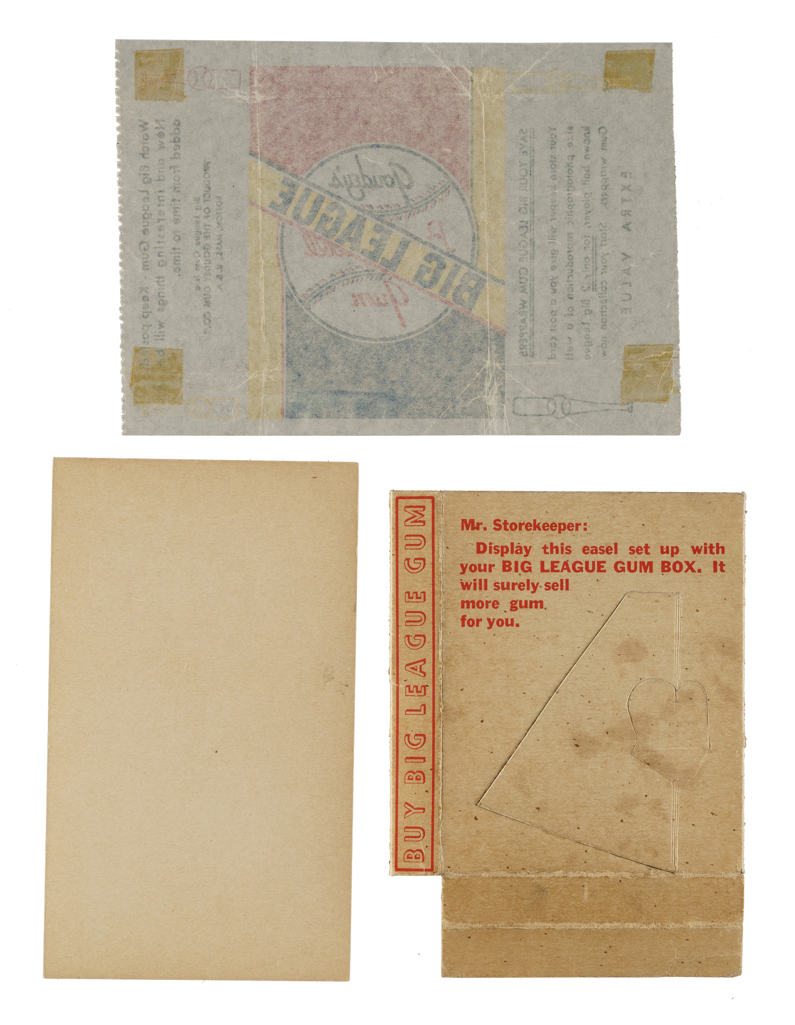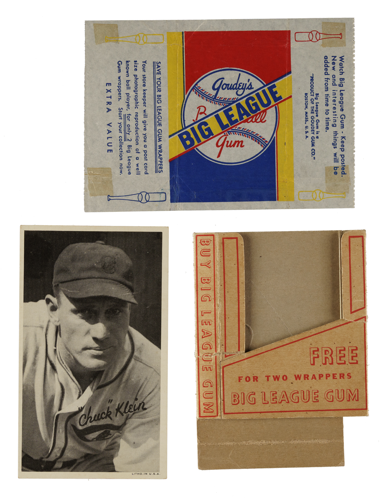 Pair of 1936 R322 Goudey Wrapper and R314 Goudey "Wide Pen" Premium Original Box. This collection consists of the following: 1) 1936 R322 Goudey Wrapper: Condition is Pr due to tape residue and tear. 2) 1936 R314 Goudey "Wide Pen" Premiums Original Box: Condition is Pr-Fr due to tears. 3) 1936 R314 Goudey "Wide Pen" Premiums (1 card): Klein (Gd+). Total: 3 items.