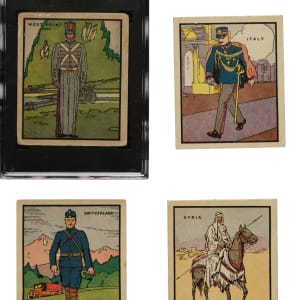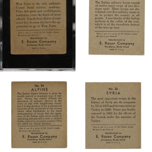 Complete set of R139 "Soldier Cards" produced by E. Rosen Company. This scarce, full-color set features images of soldiers from around the world, with historical information for each soldier printed on the reverse. The card backs advertise a series of 192 cards, but production stopped at thirty-six. Condition of the set is 22% Ex, 59% Vg to Vg-Ex, and 19% Gd (including 11% lesser). Key: #30 West Point Cadet (SGC VG 40). This is very presentable complete set of this 1930s nonsport-card issue. Total: 36 cards. The size/weight of this item requires that there will be an additional shipping charge for this lot.