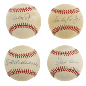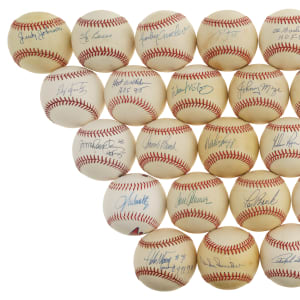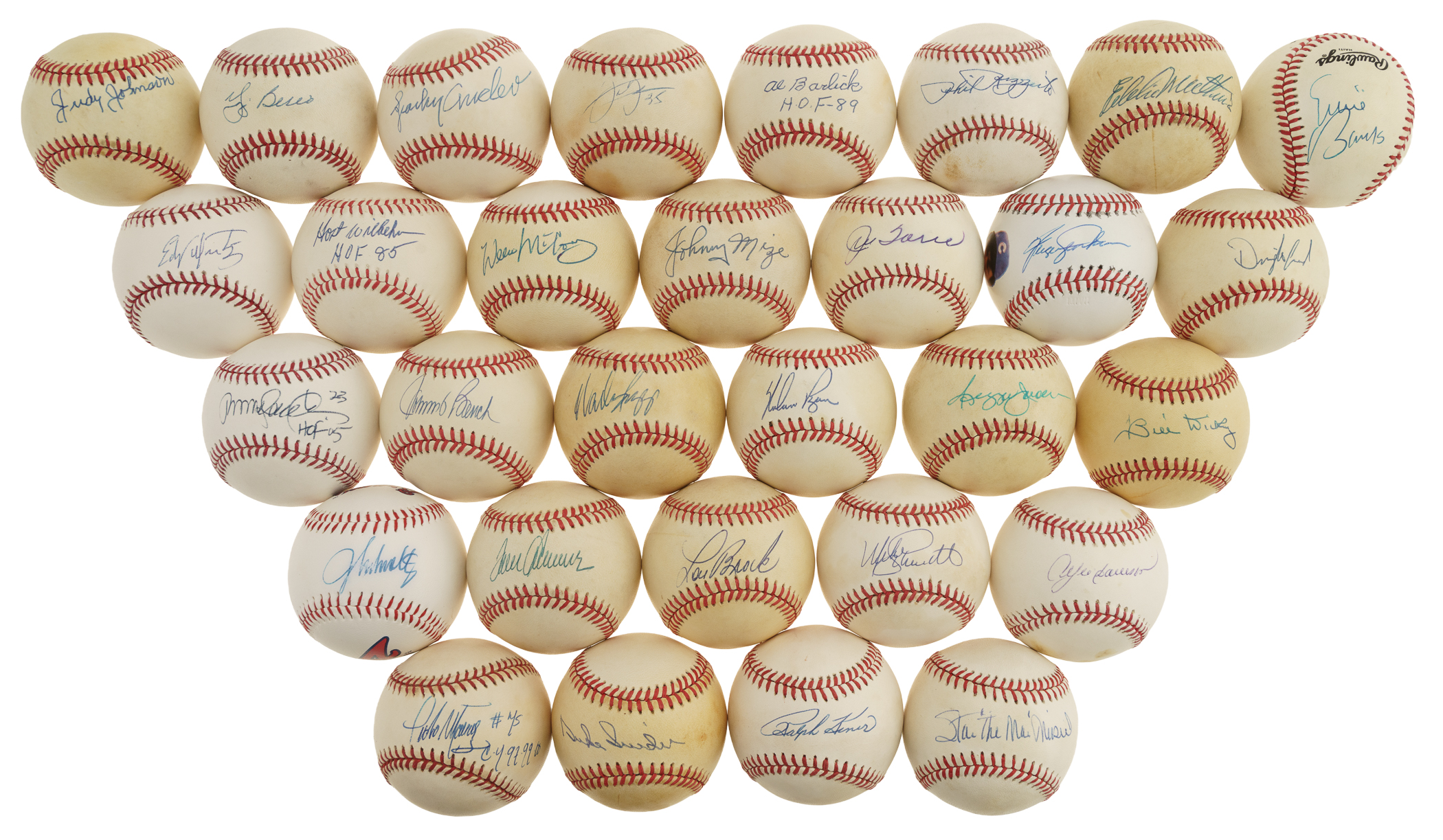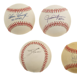 Collection of 39 single-signed baseballs consisting exclusively of Hall of Fame players. Unless otherwise noted, all the signatures appear on the sweet spot of an official American, Major, or National League baseball dating from the 1980s or later. Most of the balls have varying degrees of age toning, otherwise all are in Excellent to Mint or better condition overall. This collection consists of the following: Aaron, Anderson, Banks (side panel), Barlick (HOF 89), Bench, Berra, Boggs, Brock, Dawson, Dickey, Fingers, Gossage (310 Saves), Hunter (HOF 87, faded signature), R. Jackson, Jenkins (portrait ball), J. Johnson, Kiner, Koufax, Marichal, E. Martinez, P. Martinez ("CY 97 99 00"), Mathews, McCovey, Mize, Musial ("The Man"), Ripken, Rizzuto (HOF souvenir ball), Ryan, Sandberg (#23 HOF 05), Schmidt, Seaver, Smoltz (Braves souvenir ball), Snider, F. Thomas ("35"), Thome (side panel), Torre, Wilhelm (HOF 85), T. Williams, and Winfield. Total: 39 signed baseballs. Auction LOA from James Spence/JSA. The size/weight of this item requires that there will be an additional shipping charge for this lot.
