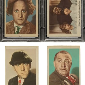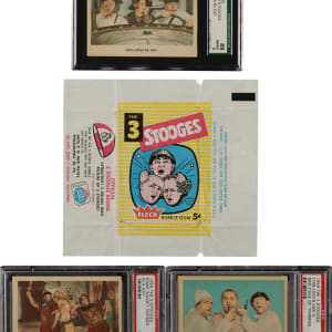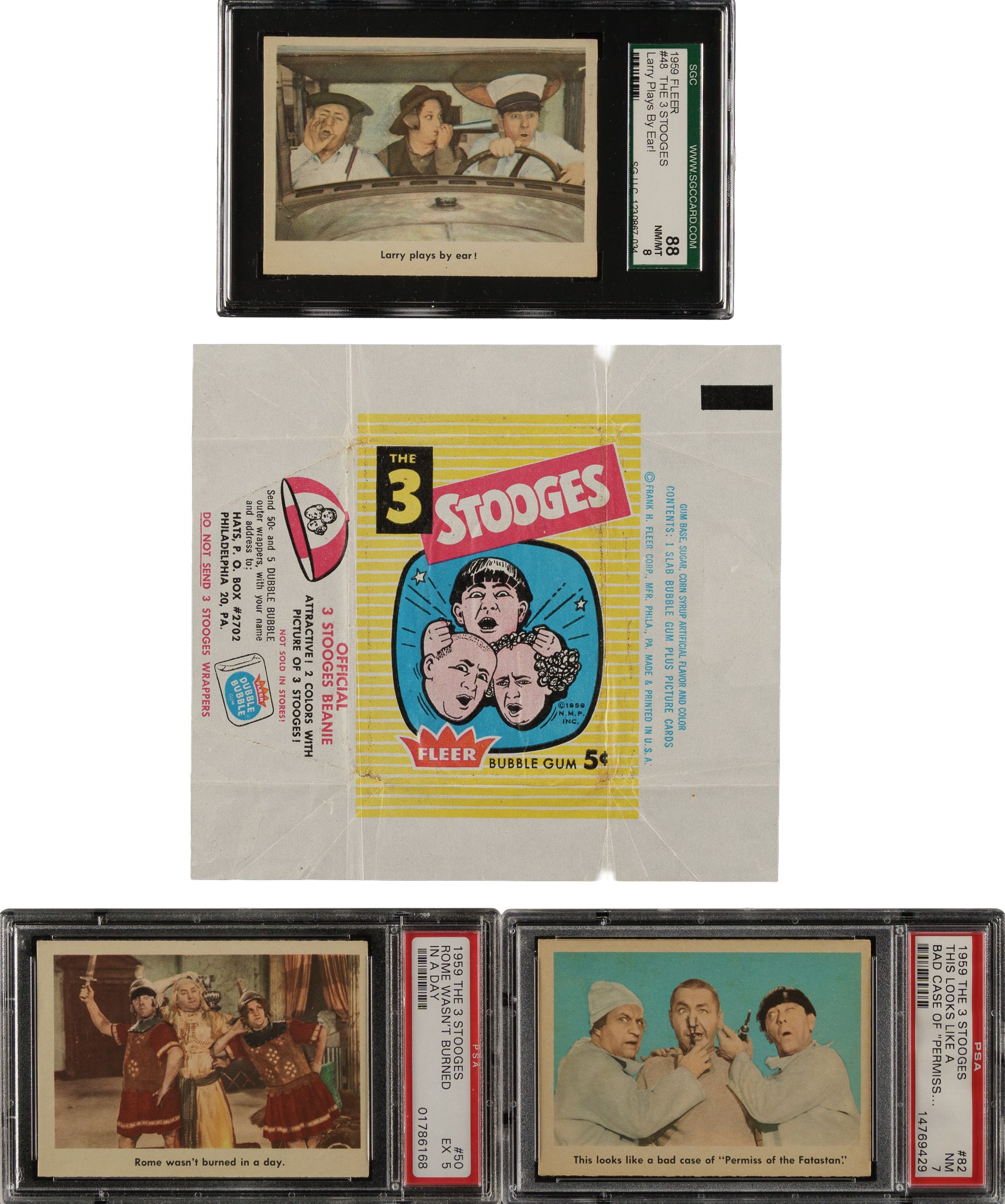 Presented is a very attractive complete set of this classic nonsport issue. Fleer's 1959 "Three Stooges" set is recognized as one of the most popular nonsport issues of the era. This set was issued when the Stooges' movie shorts were being introduced on television for the first time to a new generation of youngsters. The exposure revitalized their careers, giving them a second chance to entertain millions. This second shot of stardom resulted in even greater popularity than they had experienced in the 1930s and 1940s and ingrained the Stooges' comedy into the consciousness of America and popular culture. Naturally, many products were produced to capitalize on this stardom, including this set of bubble-gum cards. Their shorts, which were originally produced to be shown as bonuses with feature films at movie theaters, are still shown on television today, ensuring a legion of new fans in each generation and promoting the Stooges' status as American icons of comedy. The set includes five of the tougher gray-back variations (#30, 36, 53, 54, 75, and 89). Condition is 7% Nr/Mt or better, 28% Ex to Ex-Mt, 57% Vg to Vg-Ex, and 8% lesser (including three trimmed). Five cards have been professionally graded and encapsulated by PSA (4) and SGC (1). Keys: #1 Curly (trimmed right edge, otherwise Vg), 2 Moe (Vg), 3 Larry (EX 5), 35 (NM-MT 8), 48 (SGC NM/MT 88), 50 (EX 5), and 82 (NM 7). The set is accompanied by a wrapper that shows two very small tears where the corners were wrapped, otherwise presenting in Very Good to Excellent condition. This is a very attractive, mostly mid-grade complete set of this classic 1950s nonsport issue. Total: 96 cards plus wrapper.