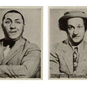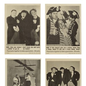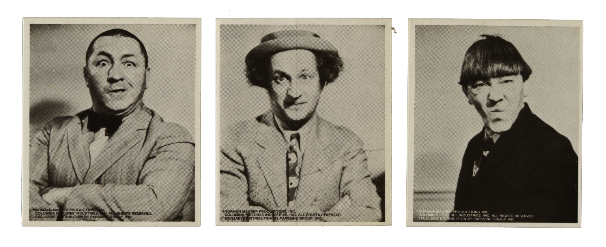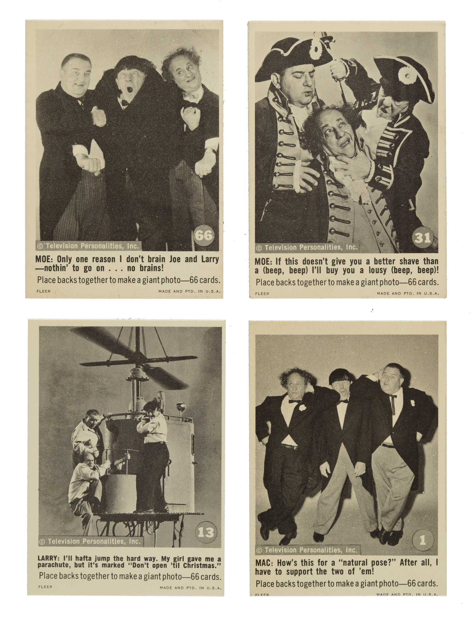 Presented is a complete 66-card set of 1966 Fleer "Three Stooges." "Three Stooges" is one of many sets Fleer produced based on television shows in the 1960s which decades later still captivate the attention of collectors. Fleer's "Three Stooges" sets are one of the most popular nonsport issues of the era. This set was issued when the Stooges' movie shorts were being introduced to a new generation of youngsters on television. The exposure revitalized their careers, giving them a second chance to entertain millions. This second shot of stardom was even greater than what they had experienced in the 1930s and 1940s, and ingrained the Stooges' comedy into American popular culture. Naturally, many products were produced to capitalize on this stardom, including this set of bubble-gum cards. Condition is 21% Ex-Mt to Nr/Mt, 63% Vg-Ex to Ex, and 16% Gd to Vg. Included is a complete eight-card set of 1974 Parssine "Three Stooges" Vending Stickers which grade Nr/Mt, five Ex, and two Vg. A very attractive mid-grade collection of these popular non-sport issues. Total: 66 cards and 8 stickers.
