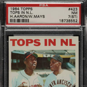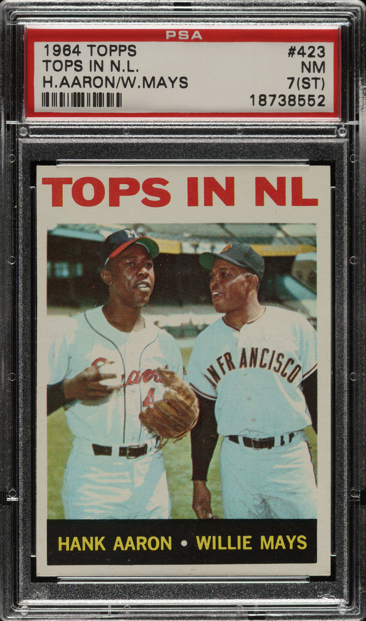 Graded NM 7 (ST) by PSA. Milwaukee Braves and San Francisco Giants Hall of Famers Hank Aaron and Willie Mays.