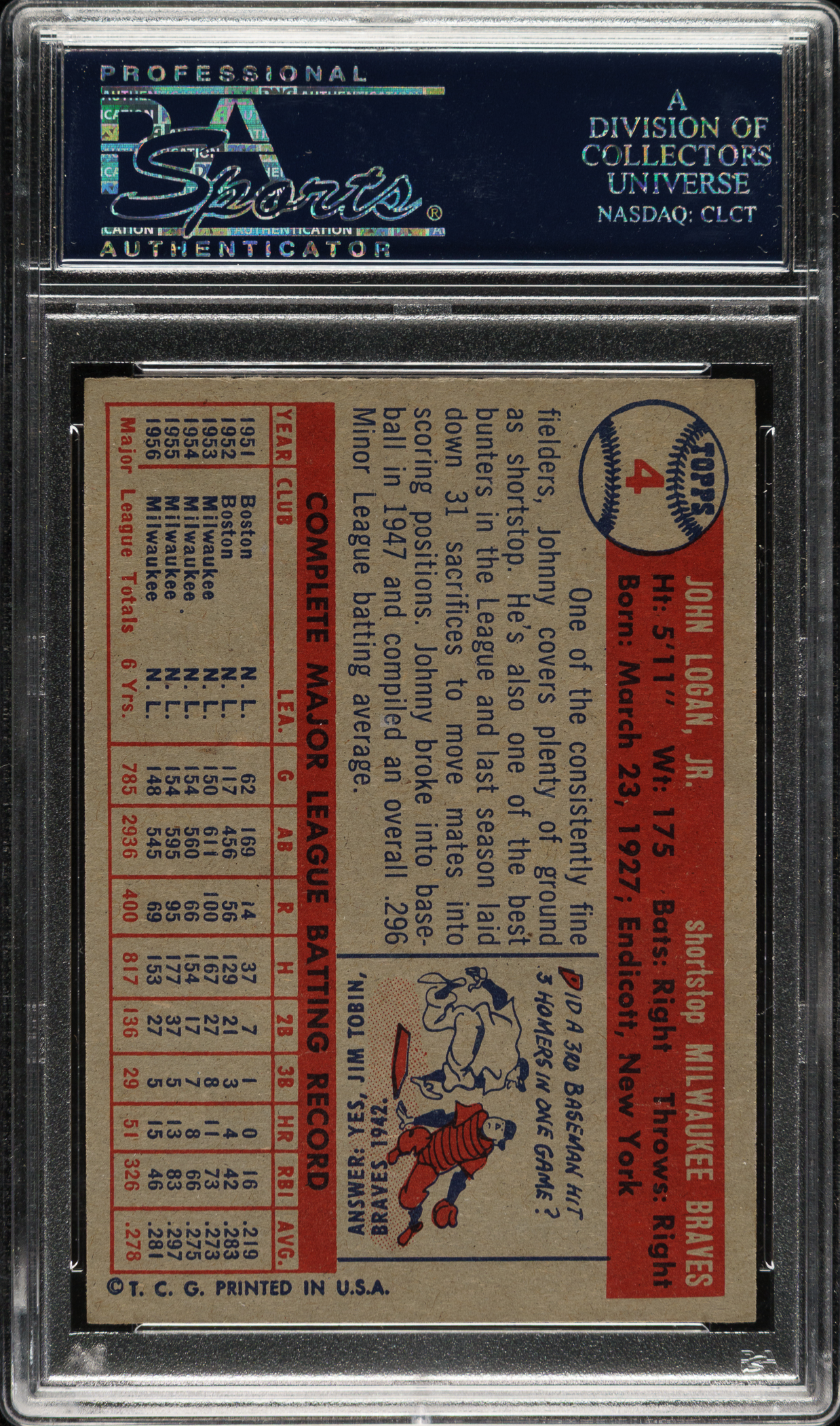 Graded NM-MT 8 by PSA. Milwaukee Braves.