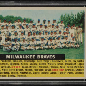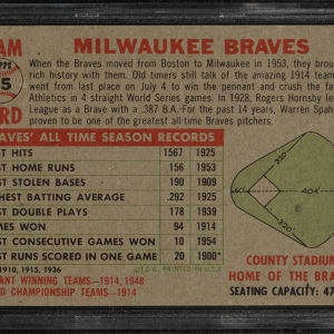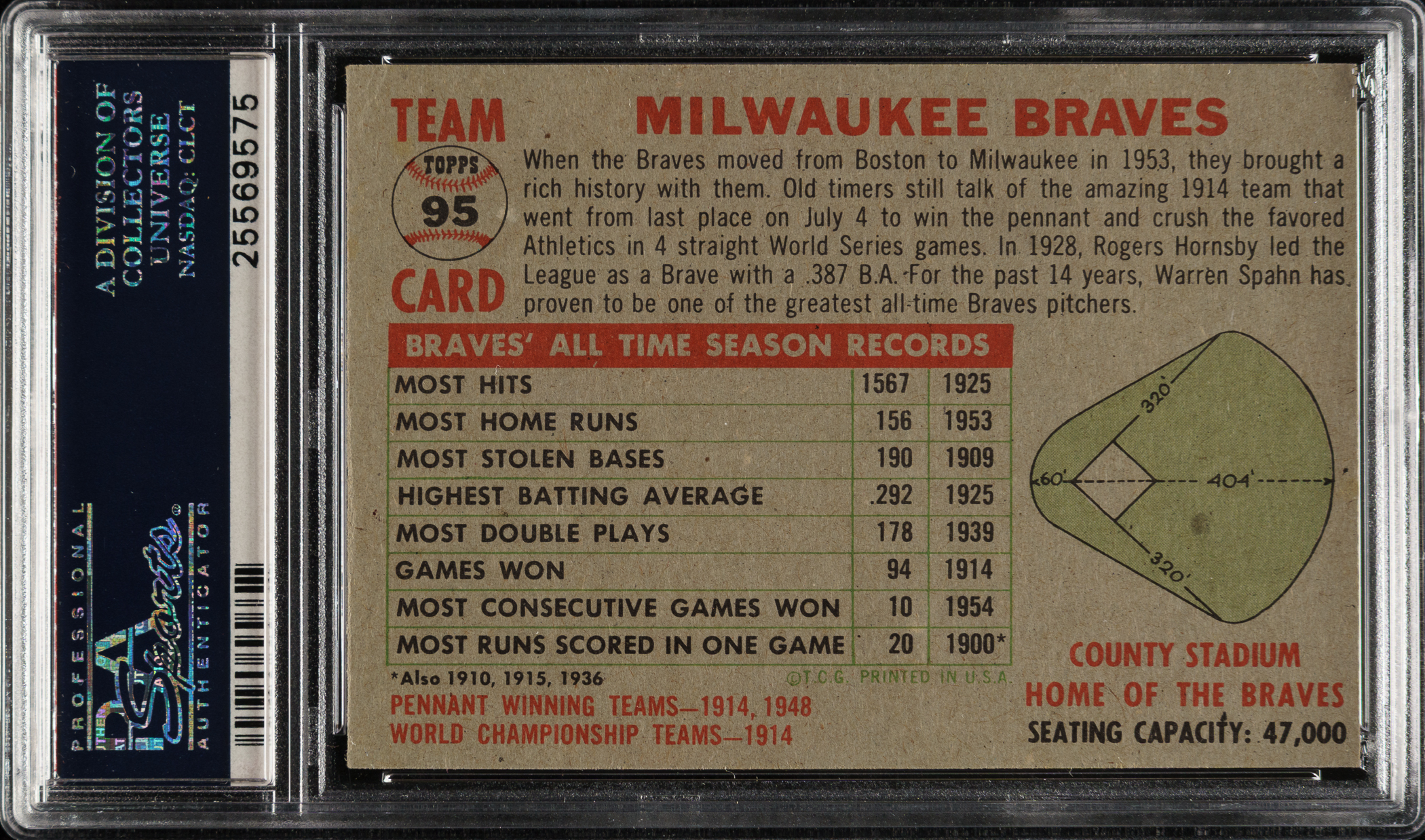 Lot # 2722: 1956 Topps #95 Braves Team No Date, Name Center Gray Back PSA NM 7