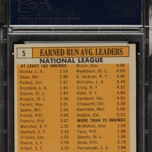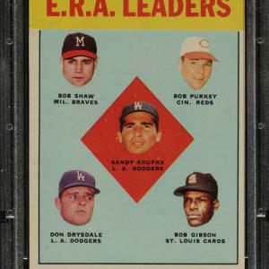 Graded NM-MT 8 by PSA. Los Angeles Dodgers and St. Louis Cardinals Hall of Famers Sandy Koufax, Don Drysdale, and Bob Gibson.