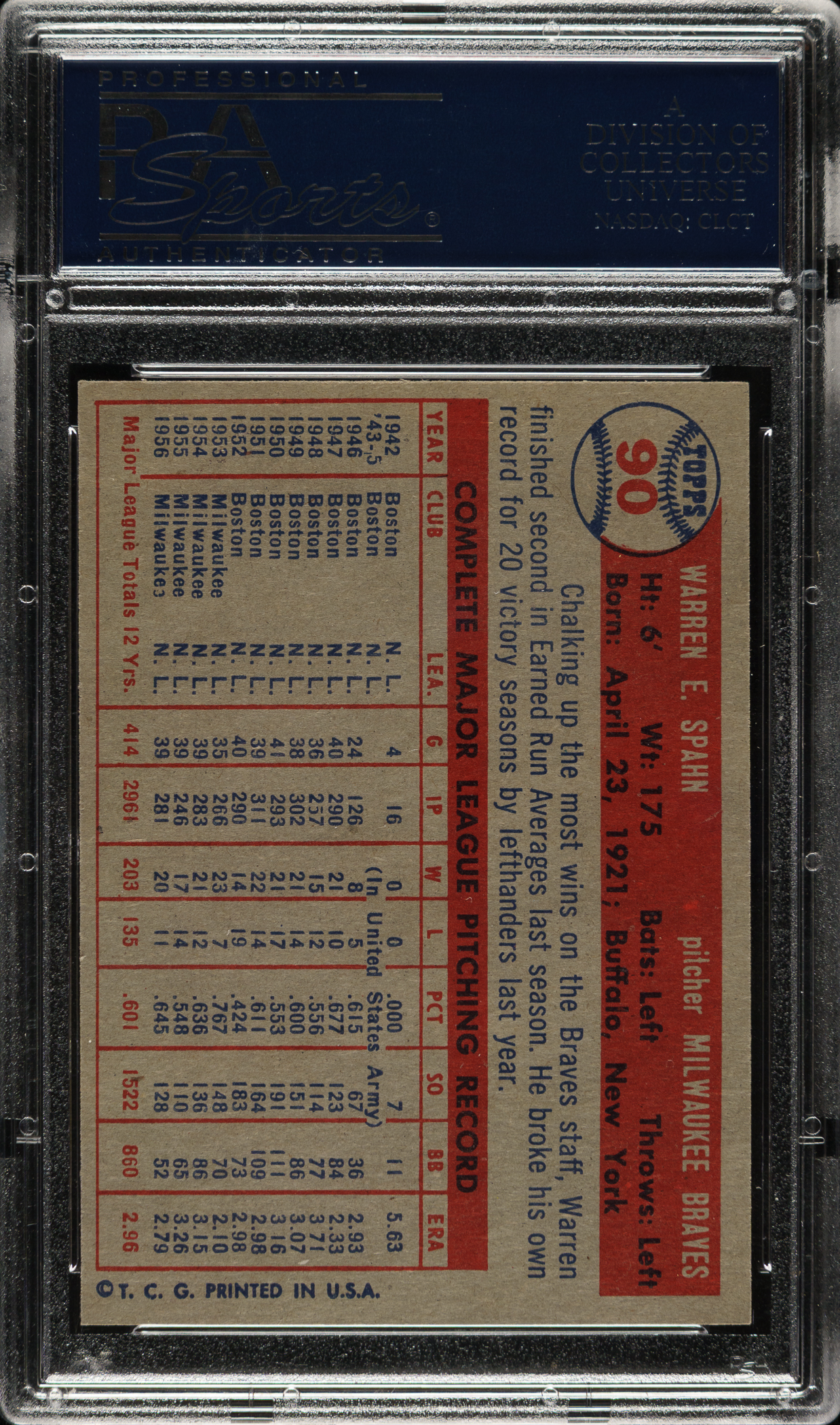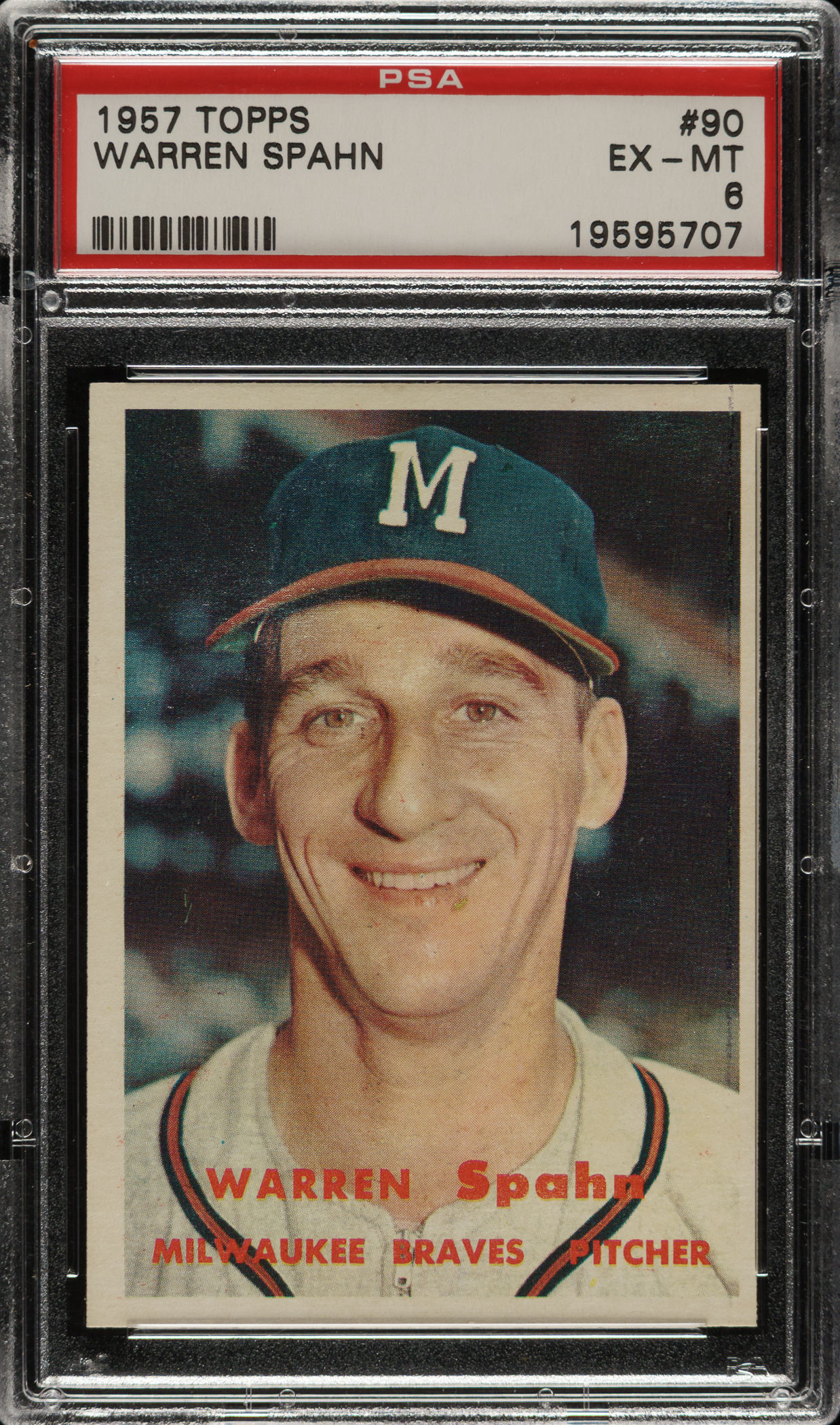 Lot # 2761: 1957 Topps #90 Warren Spahn PSA EX-MT 6