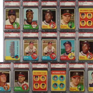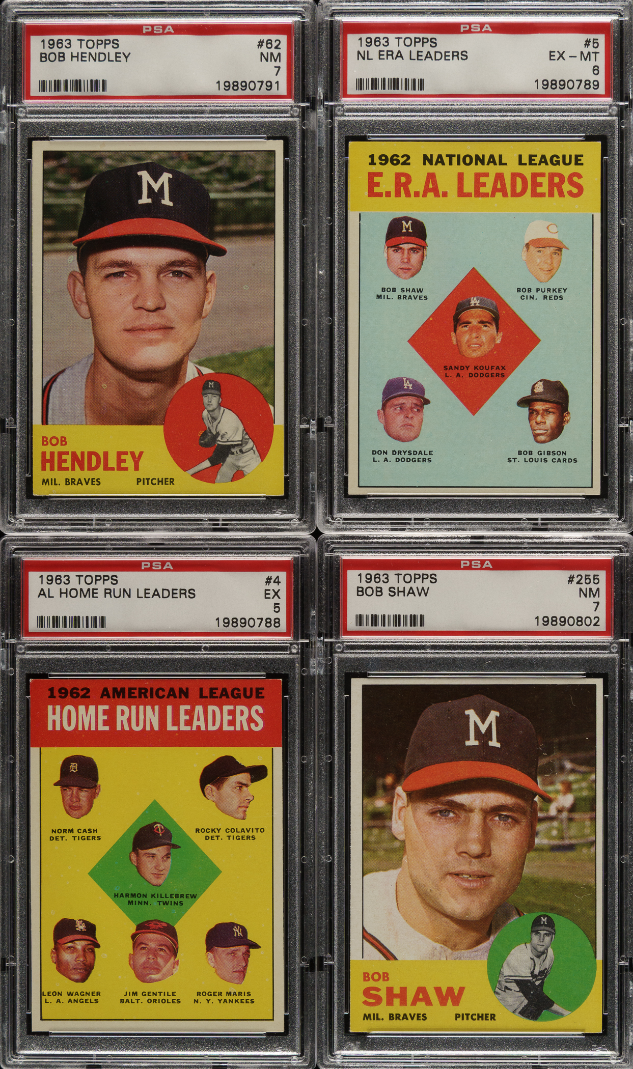 Collection of twenty 1963 Topps cards, each graded and encapsulated by PSA. PSA Grading Composite: NM 7 (10 cards): #62, 107, 109, 137, two 255, 299, 503, and two 570. EX-MT+ 6.5 (1 card): #519. EX-MT 6 (6 cards): #5 NL ERA Leaders with Koufax/Drysdale/Gibson, 137, 156, 179, 299, and 324. EX 5 (3 cards): #4 AL HR Leaders with Killebrew, 255, and 547. Total: 20 cards. The size/weight of this item requires that there will be an additional shipping charge for this lot.