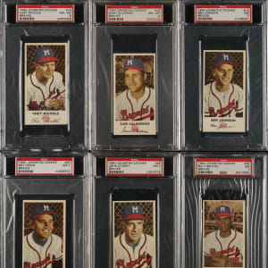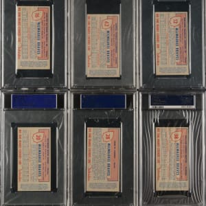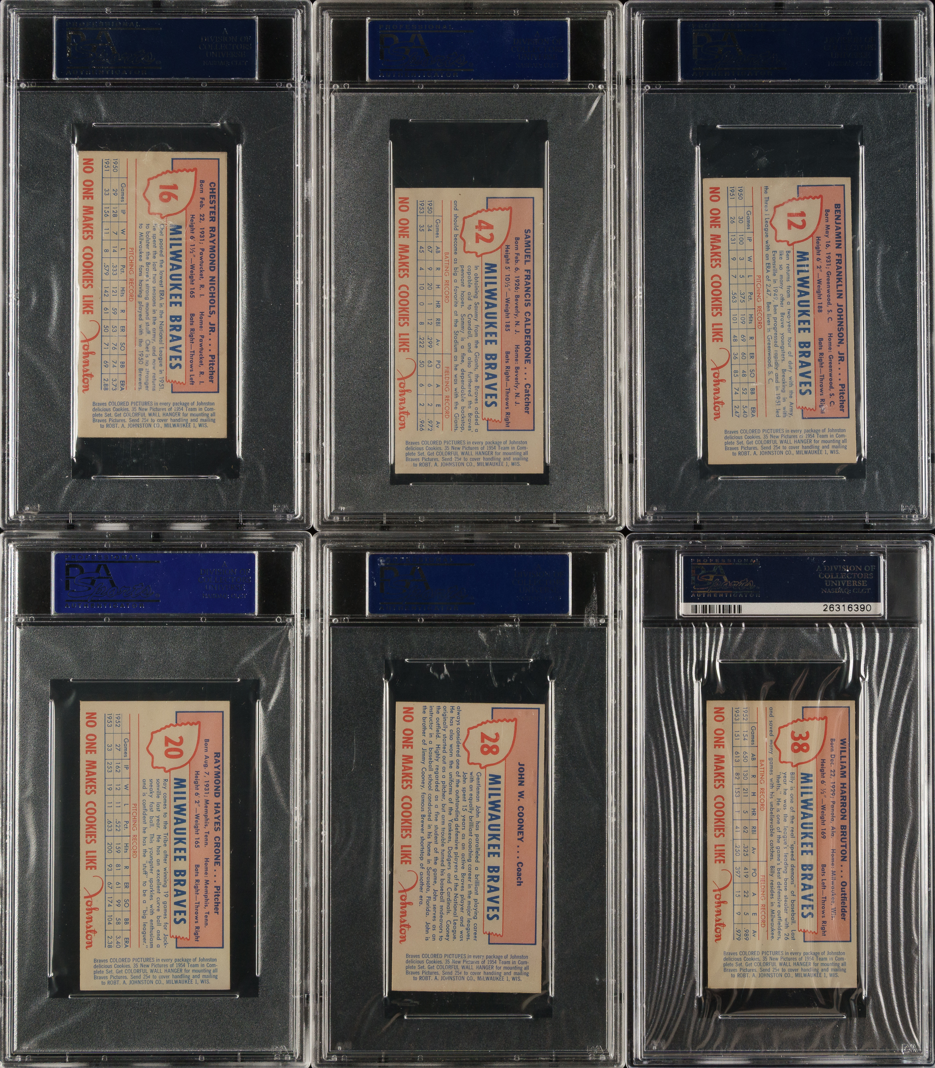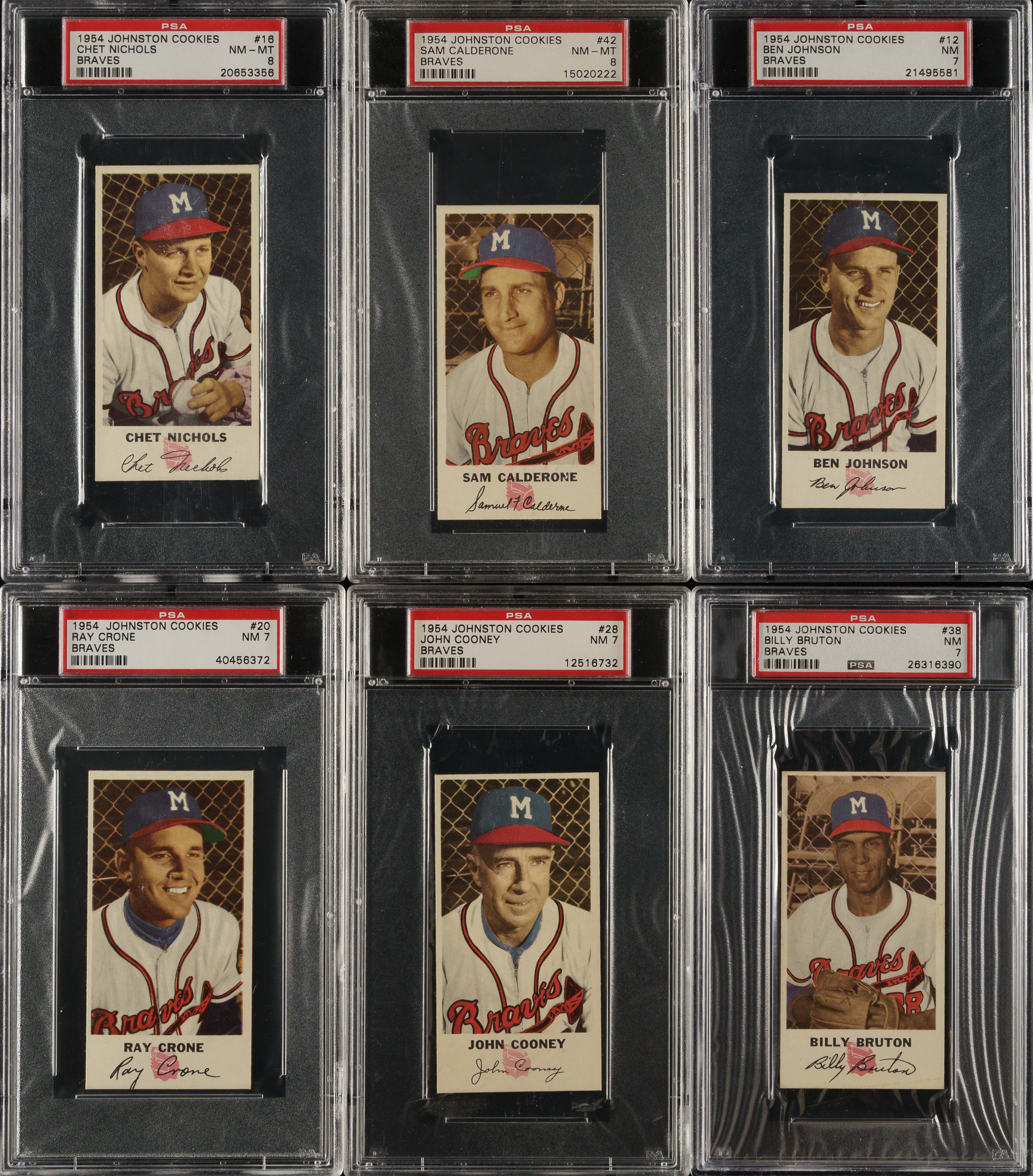 Collection of six 1954 Johnston Cookies cards, each graded and encapsulated by PSA. PSA Grading Composite: NM-MT 8 (2 cards): #16 and 42. NM 7 (4 cards): #12, 20, 28, and 38. Total: 6 cards. The size/weight of this item requires that there will be an additional shipping charge for this lot.