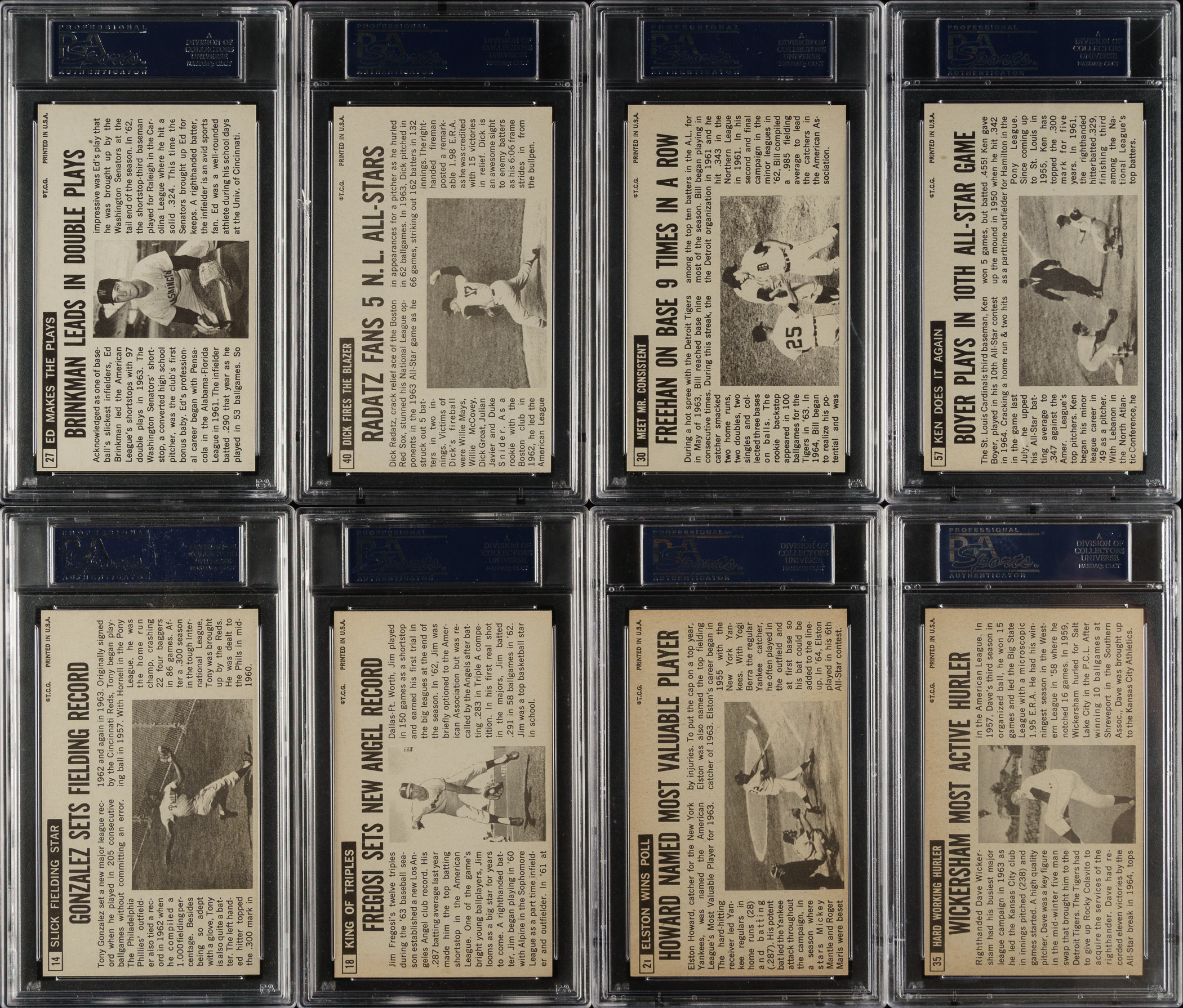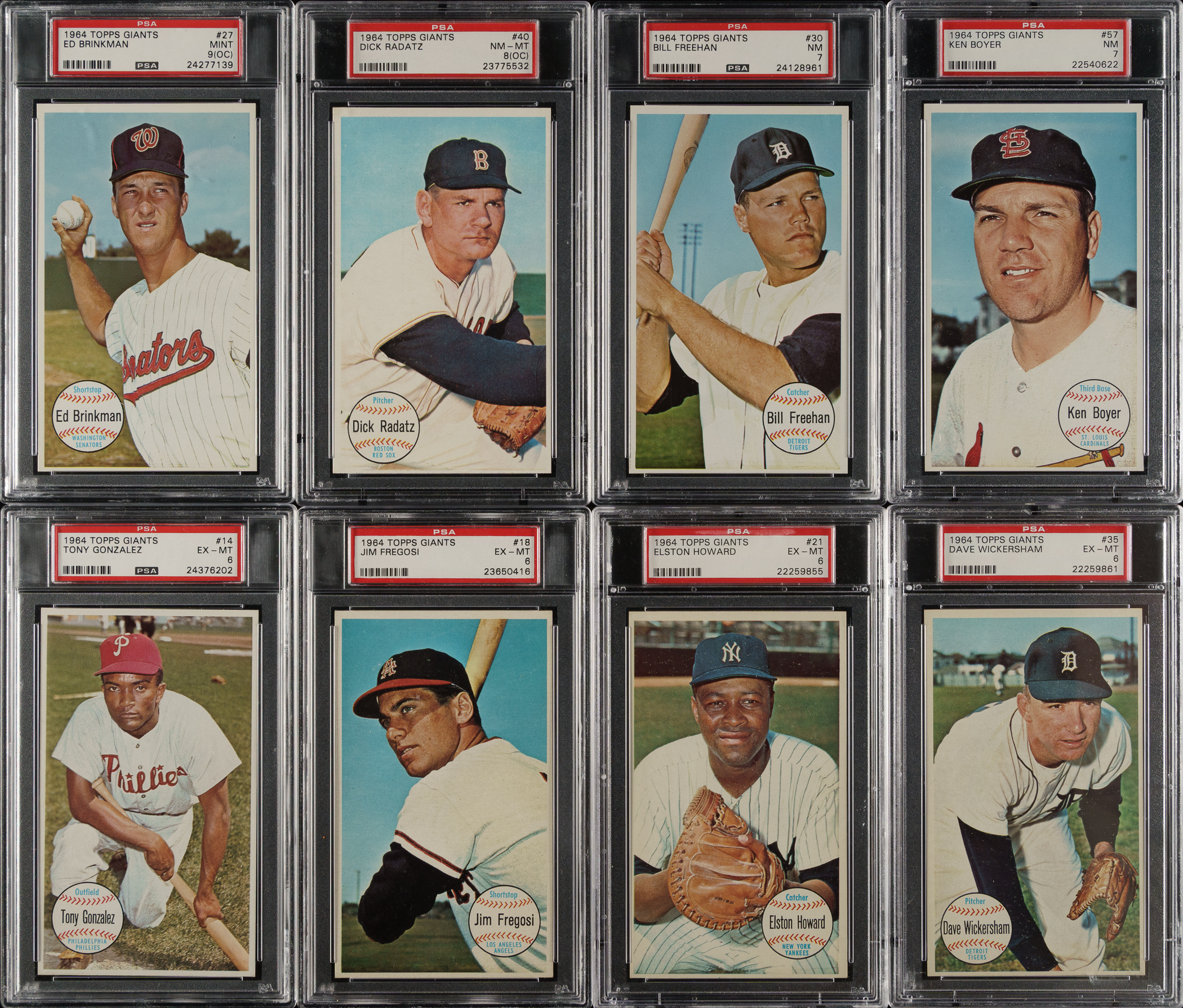 Collection of eight 1964 Topps Giants cards, each graded and encapsulated by PSA. PSA Grading Composite: MINT 9 (1 card): #27 (OC). NM-MT 8 (1 card): #40 (OC). NM 7 (2 cards): #30 and 57. EX-MT 6 (4 cards): #14, 18, 21, and 35. Total: 8 cards. The size/weight of this item requires that there will be an additional shipping charge for this lot.