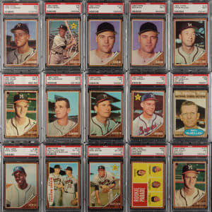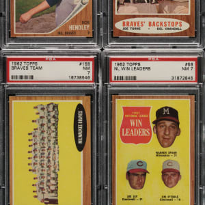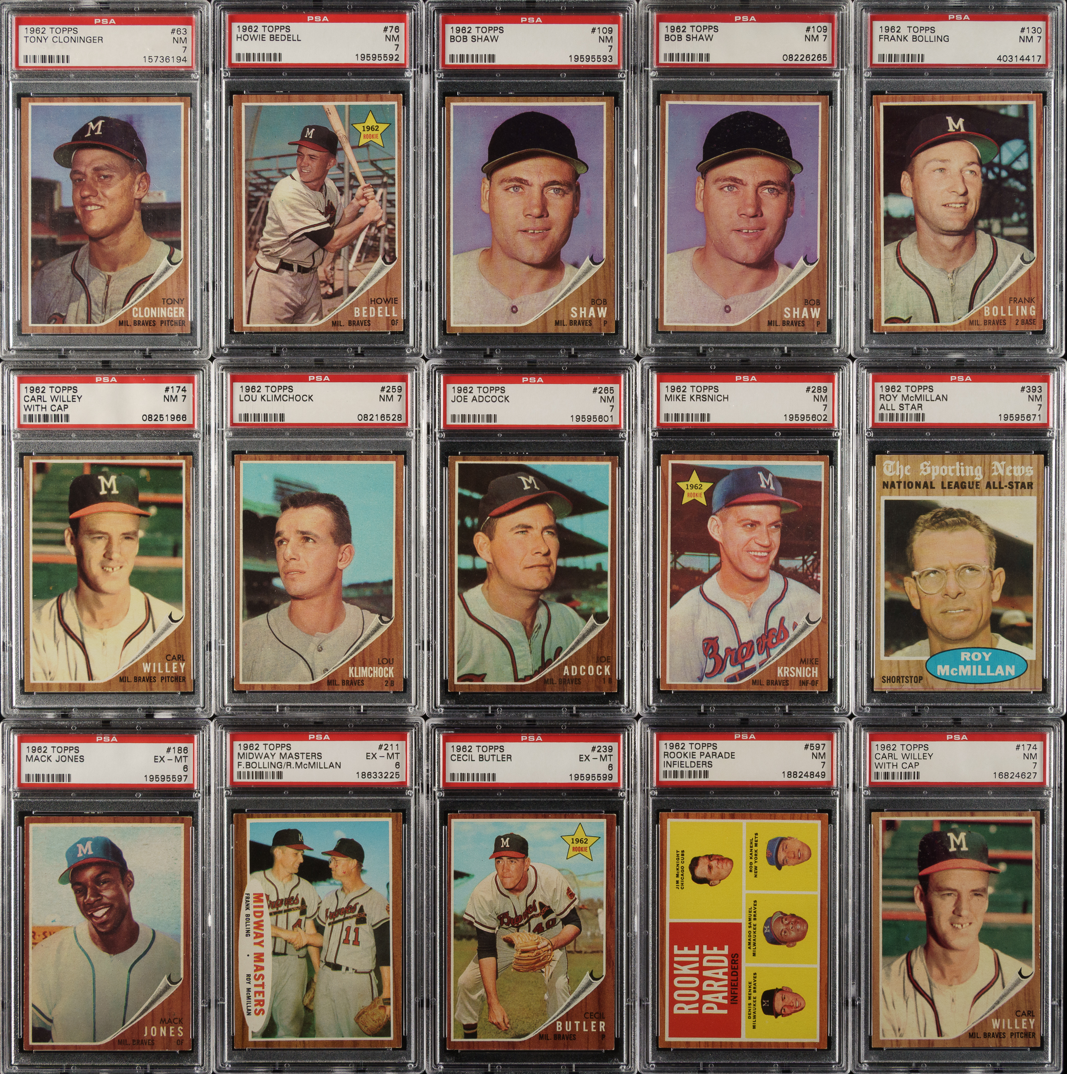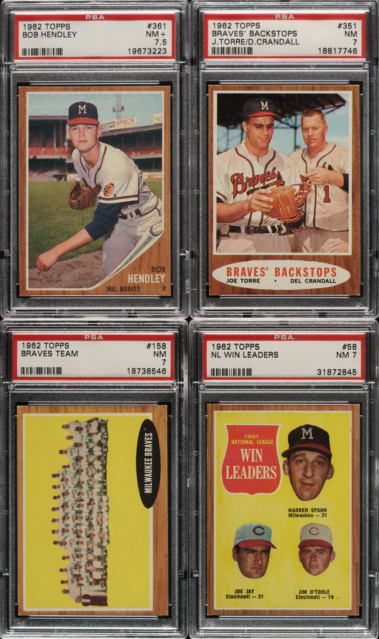 Collection of twenty 1962 Topps cards, each graded and encapsulated by PSA. PSA Grading Composite: NM+ 7.5 (1 card): #361. NM 7 (16 cards): Two #58 NL Win Leaders with Spahn, 63, 76, two 109, 130, 158, two 174, 259, 265, 289, 351 Torre/Crandall, 393 AS, and 597. EX-MT 6 (3 cards): #186, 211, and 239. Total: 20 cards. The size/weight of this item requires that there will be an additional shipping charge for this lot.