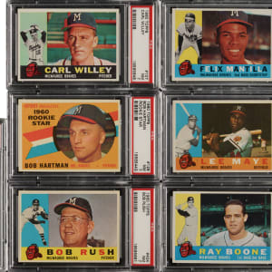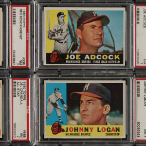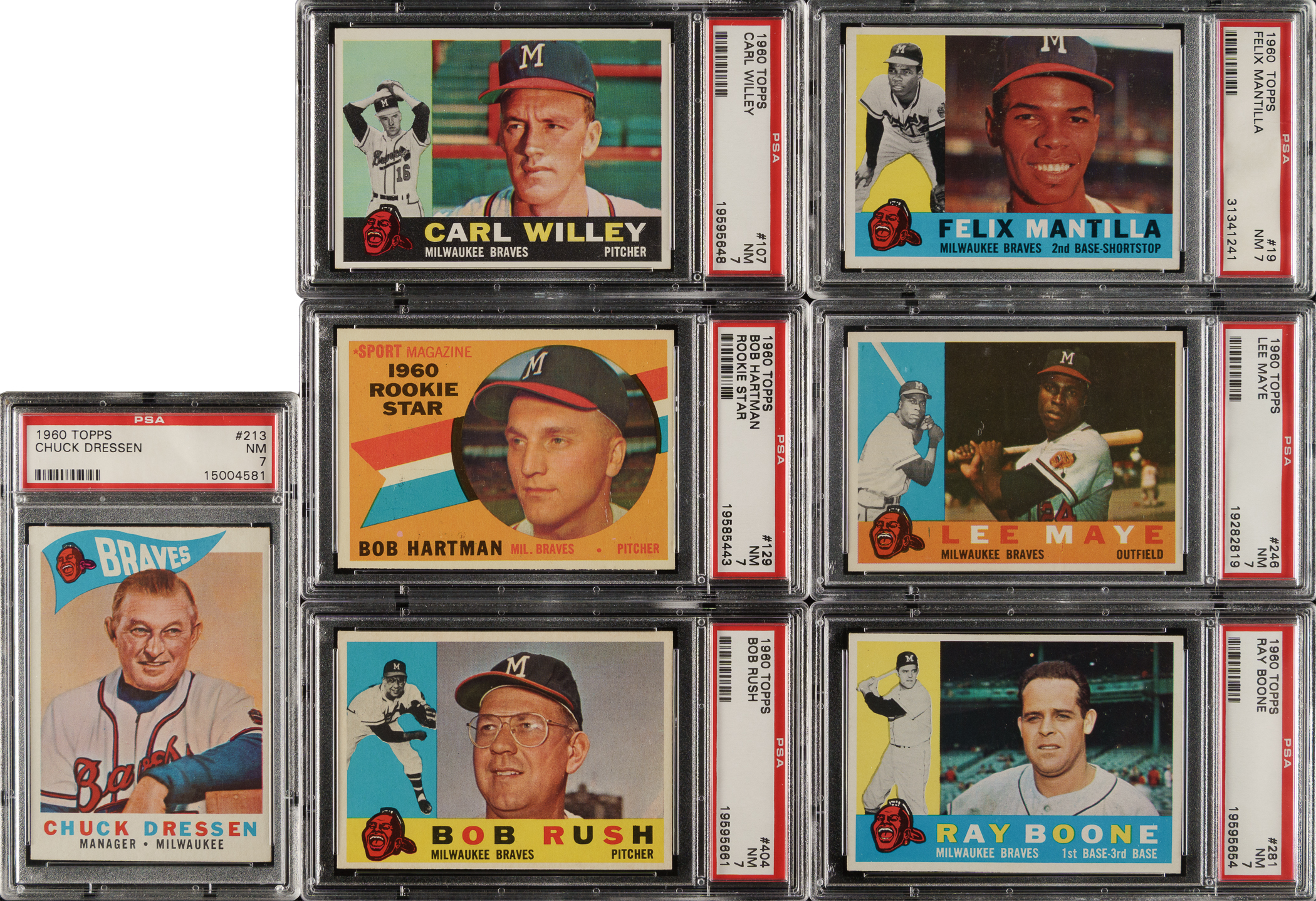 Collection of eleven 1960 Topps cards, featuring Milwaukee Braves Hall of Famer Red Schoendienst. Each card has been graded and encapsulated NM 7 by PSA. This collection consists of the following: #3, 19, 107, 129, 205, 213, 246, 281, 335 Schoendienst, 404, and 568 AS. Total: 11 cards. The size/weight of this item requires that there will be an additional shipping charge for this lot.
