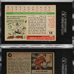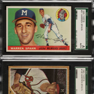 Pair of 1955 and 1962 Topps cards, featuring Milwaukee Braves Hall of Famer Warren Spahn. Both cards have been graded and encapsulated Authentic by SGC. This pair consists of the following: 1) 1955 Topps #31 Warren Spahn. 2) 1962 Topps #100 Warren Spahn. Total: 2 cards.