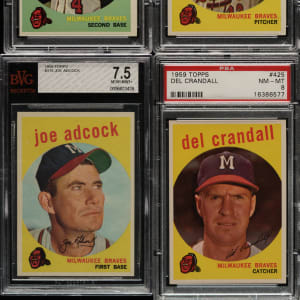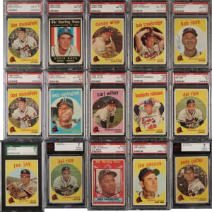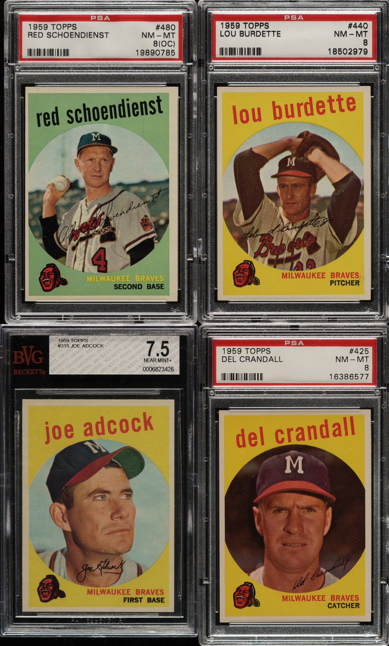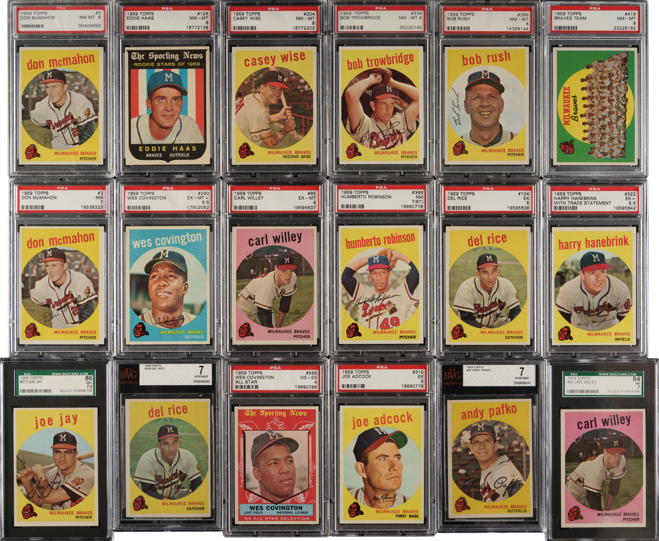 Collection of twenty-two 1959 Topps cards, each graded and encapsulated by PSA (17), SGC (2), and BVG (3). PSA Grading Composite: NM-MT 8 (9 cards): #3, 126, 204, 239, 396, 419, 425, 440 , and 480 (OC). NM+ 7.5 (2 cards): #273 (SGC NM+ 86) and 315 (BVG NM+ 7.5). NM 7 (5 cards): #3, 27 (BVG), 95 (SGC NM 84), 104 (BVG), and 366 (ST). EX-MT+ 6.5 (1 card): #290. EX-MT 6 (1 card): #95. EX+ 5.5 (1 card): #322. EX 5 (2 cards): #104 and 315. VG-EX 4 (1 card): #565 AS. Total: 22 cards. The size/weight of this item requires that there will be an additional shipping charge for this lot.