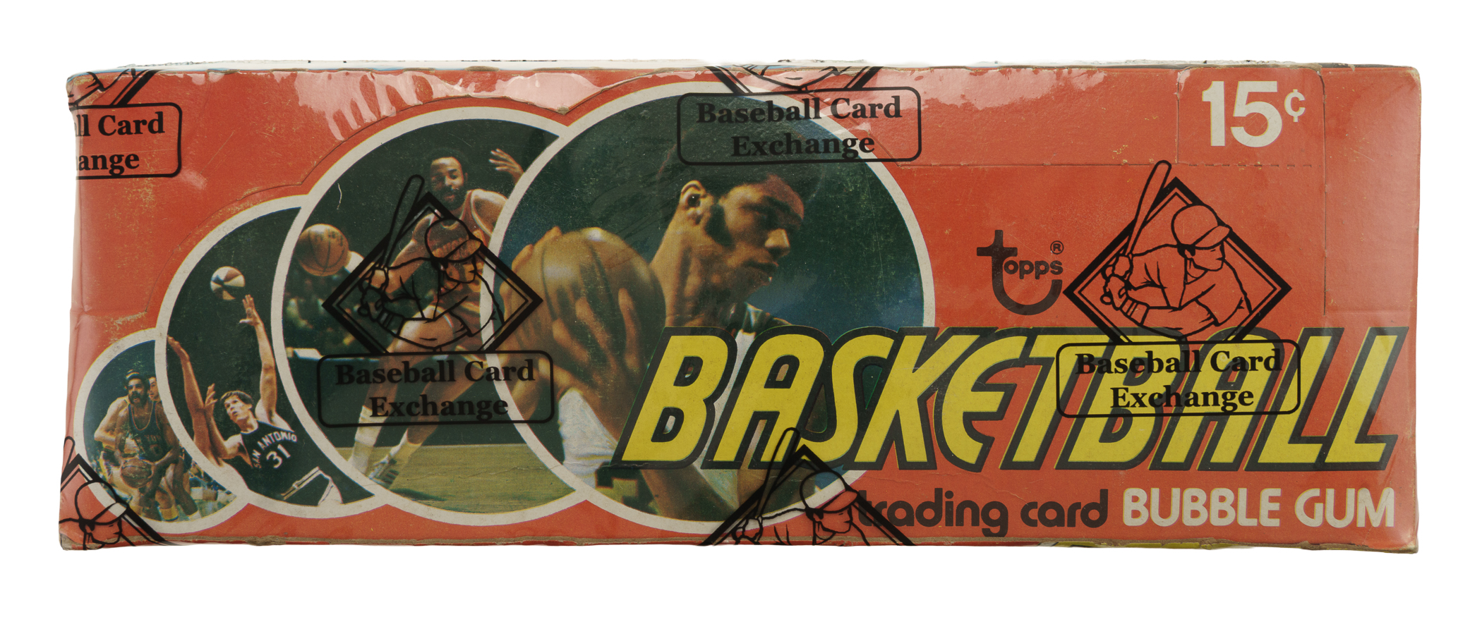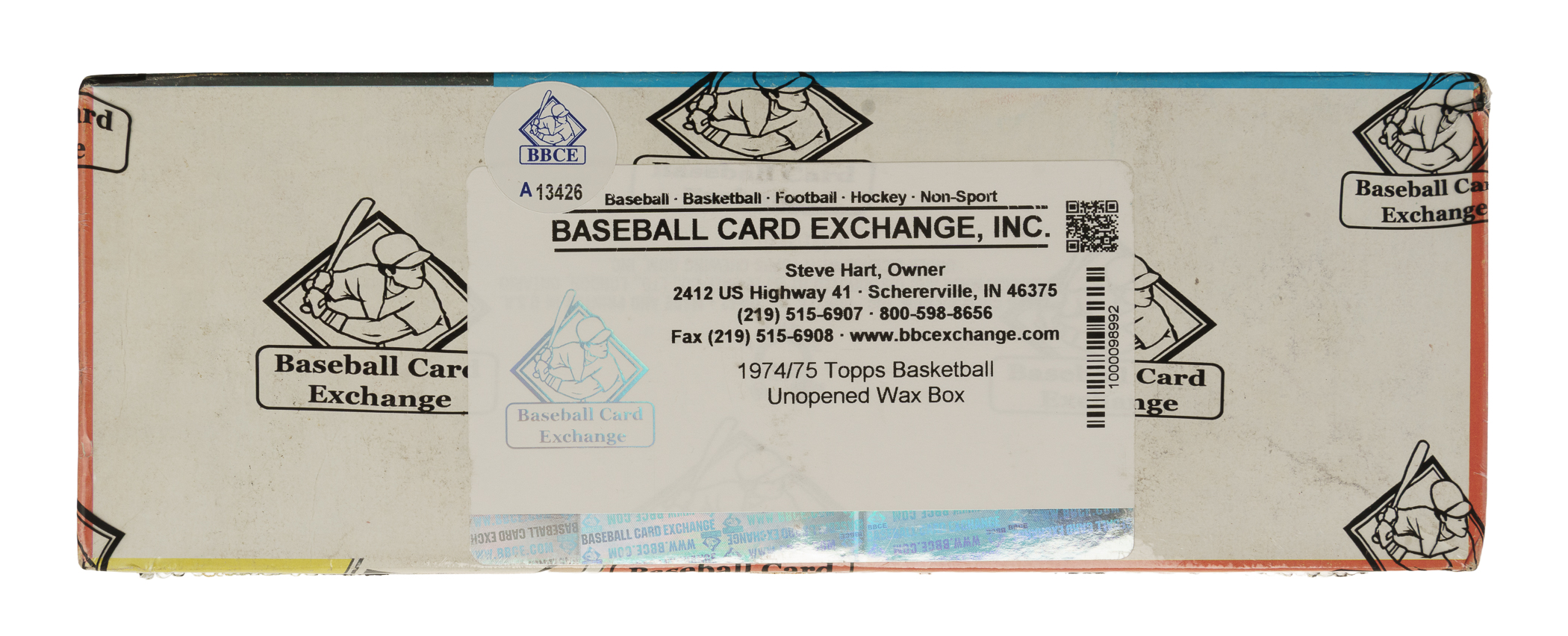Complete, original unopened wax box of 1974-1975 Topps basketball. A complete wax box of 1974-1975 Topps houses 24 packs with each pack containing 10 cards for a total of 240 cards. This set contains the rookie cards of Hall of Famers George Gervin and Bill Walton as well as many other stars, including Kareem Abdul-Jabbar, Pete Maravich, and Wilt Chamberlain. This box comes shrink-wrapped by Baseball Card Exchange (owned by Steve Hart, the foremost expert on unopened material). The display box shows light-to-moderate shelf wear, including a bit of creasing along the lid. Extremely rare complete wax box worthy of even the most advanced collection!