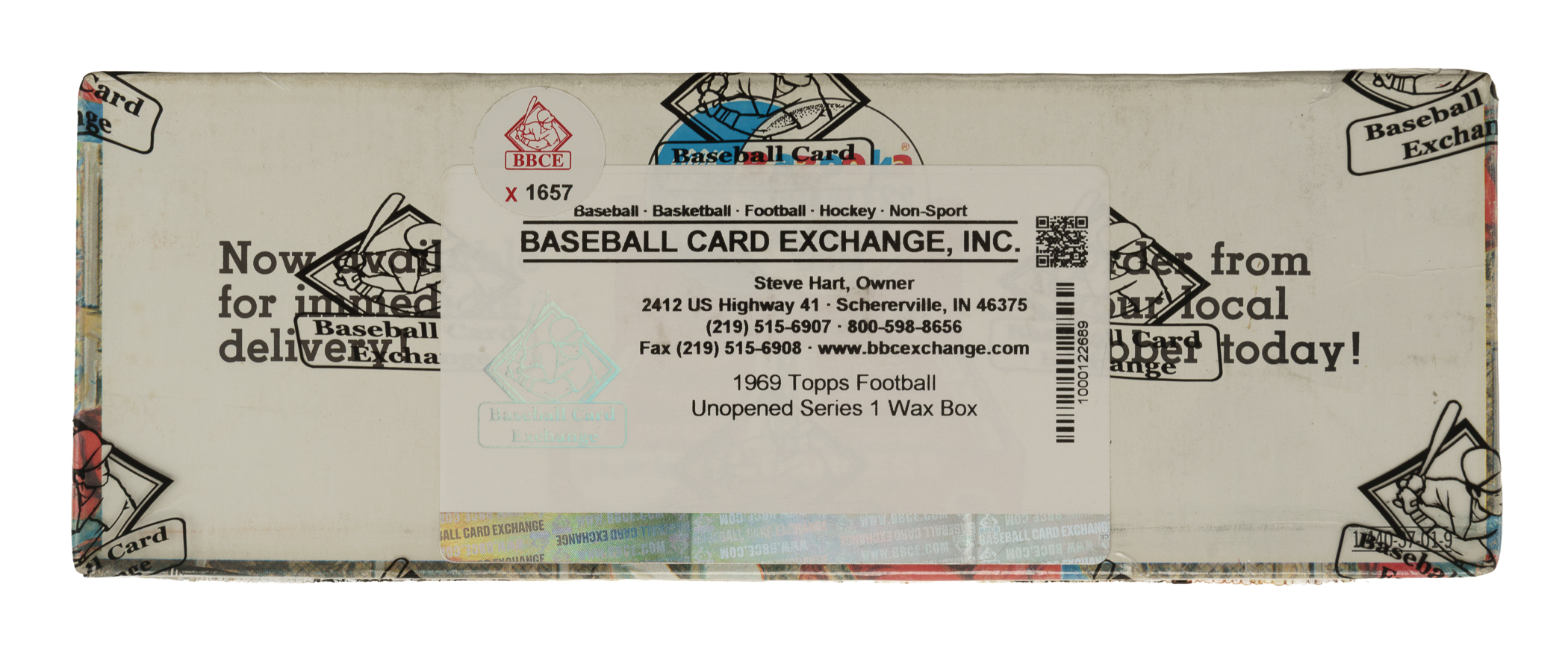 Presented is an extremely rare, complete, original unopened wax box of 1969 Topps football. This is a first-series (#1-132) box, which includes Joe Namath, Gale Sayers, and Johnny Unitas as well as numerous other stars and Hall of Famers. This is only the second example we have offered in the past 21 years! The box houses 24 packs with each pack containing 12 cards for a total of 288 cards. While no guarantees can be made with respect to the grading of unopened material, there is a very real possibility that within this box are Mint or Gem Mint cards. This box comes shrink-wrapped by Baseball Card Exchange (Steve Hart), the foremost expert on unopened material. The box displays beautifully. This is an incredible unopened wax box from this very popular 1960s football issue!