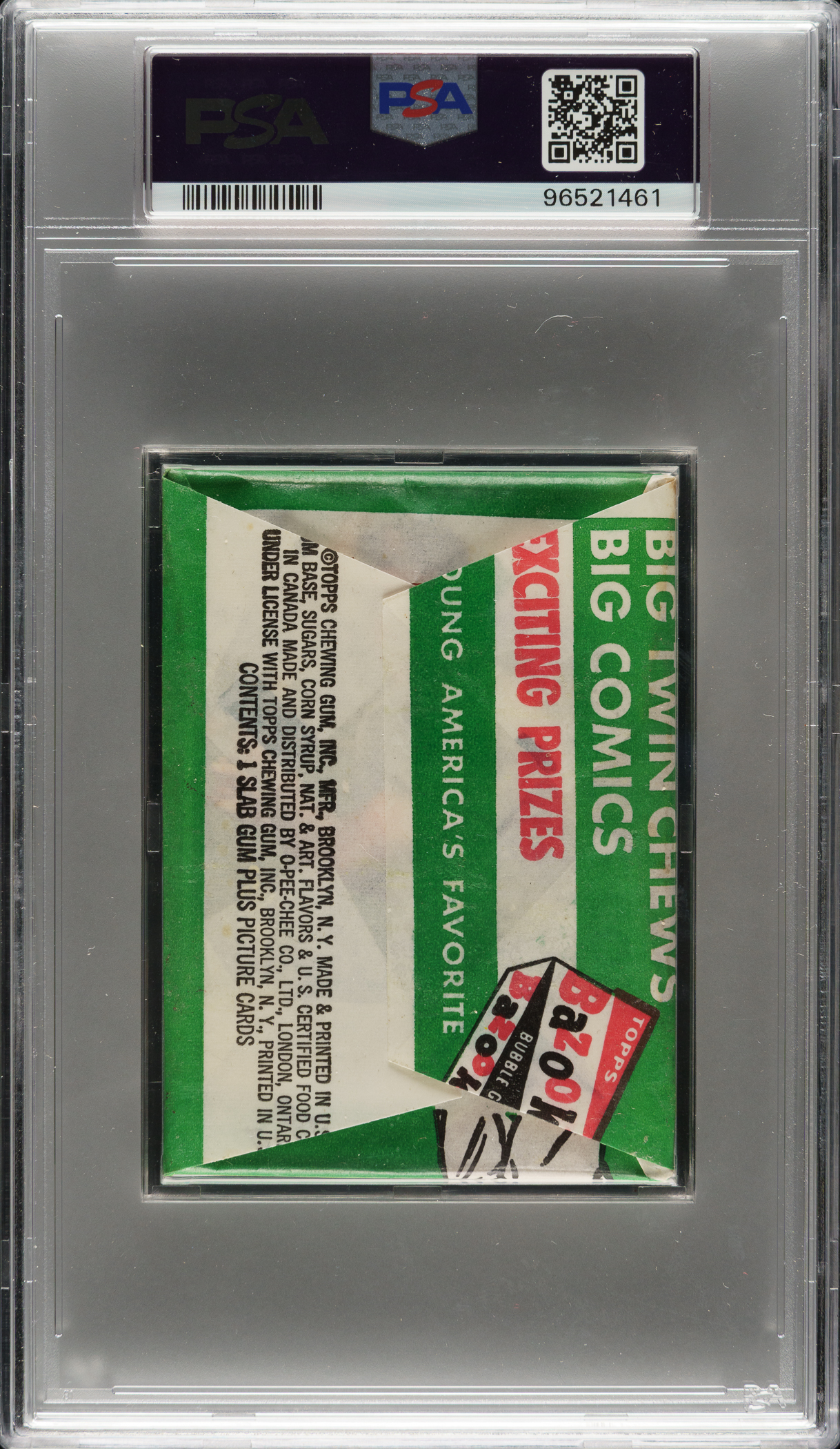 Graded NM-MT 8 by PSA. Original unopened five-cent wax pack from the 1962 Topps baseball set. The set features the rookie cards of both Lou Brock and Gaylord Perry and is loaded with stars, including Mickey Mantle, Roger Maris, Roberto Clemente, Sandy Koufax, Hank Aaron, Willie Mays, Stan Musial, Ernie Banks, Duke Snider, Bob Gibson, and Yogi Berra. The pack has a beautiful full-color wrapper and tight seal. A worthy addition to any unopened pack collection or companion to any complete 1962 Topps set.