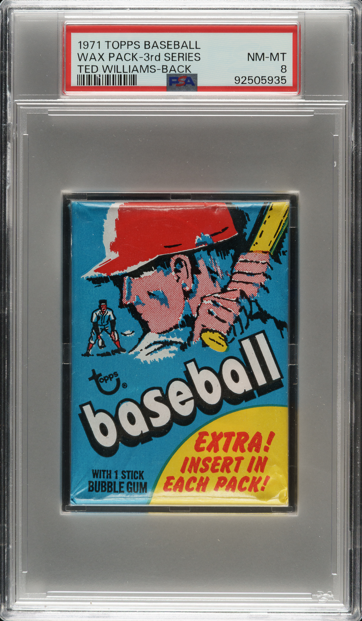 Graded NM-MT 8 by PSA. Original unopened wax pack from the third series of the 1971 Topps baseball set, noteworthy as having Hall of Famer Ted Williams (card #380) showing on the back. In addition to Ted Williams, featured in this series are Hall of Famers Joe Morgan, Fergie Jenkins, Brooks Robinson, Don Sutton, and Rollie Fingers, along with the rookie cards of star players George Foster and Steve Garvey.