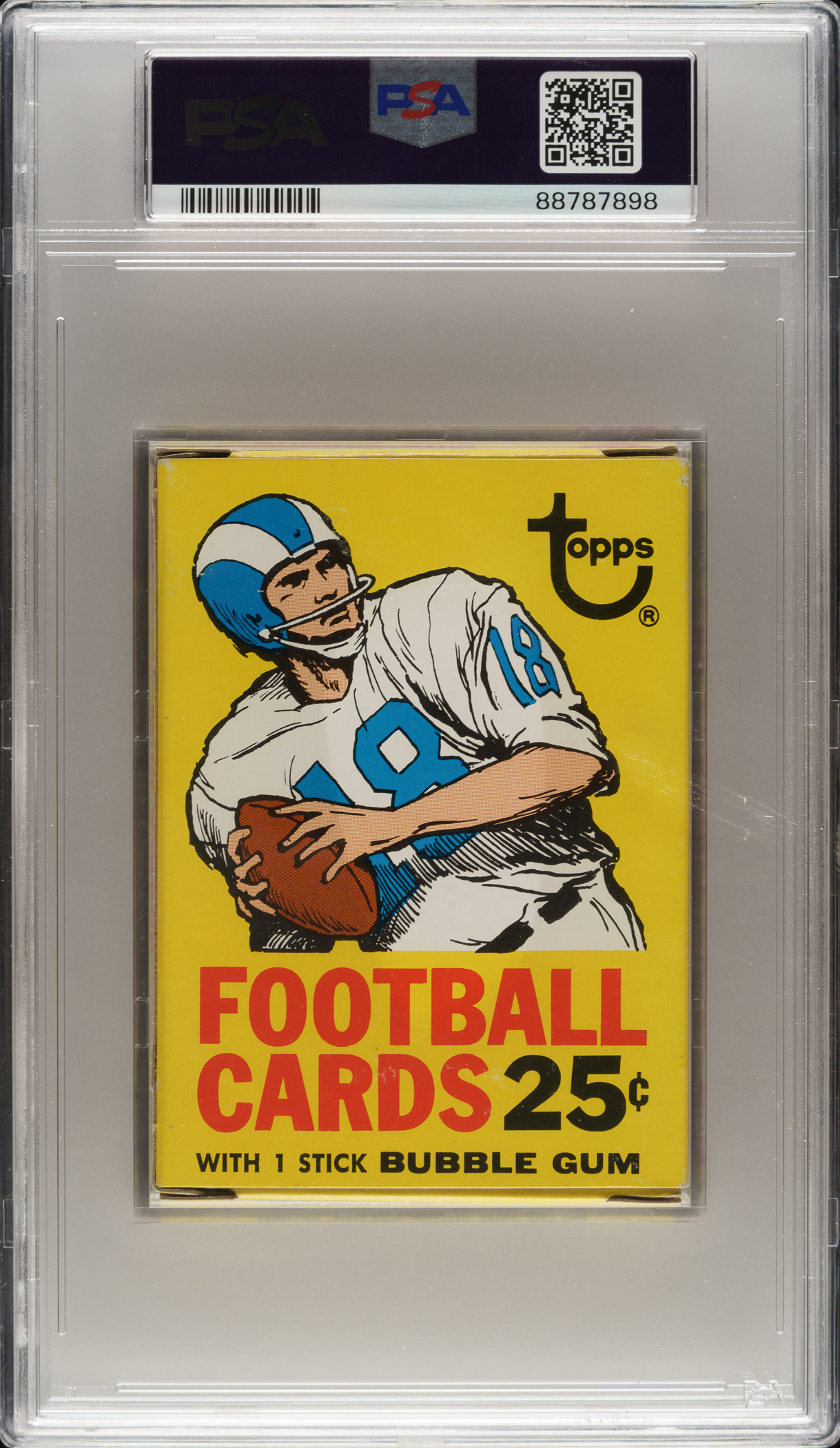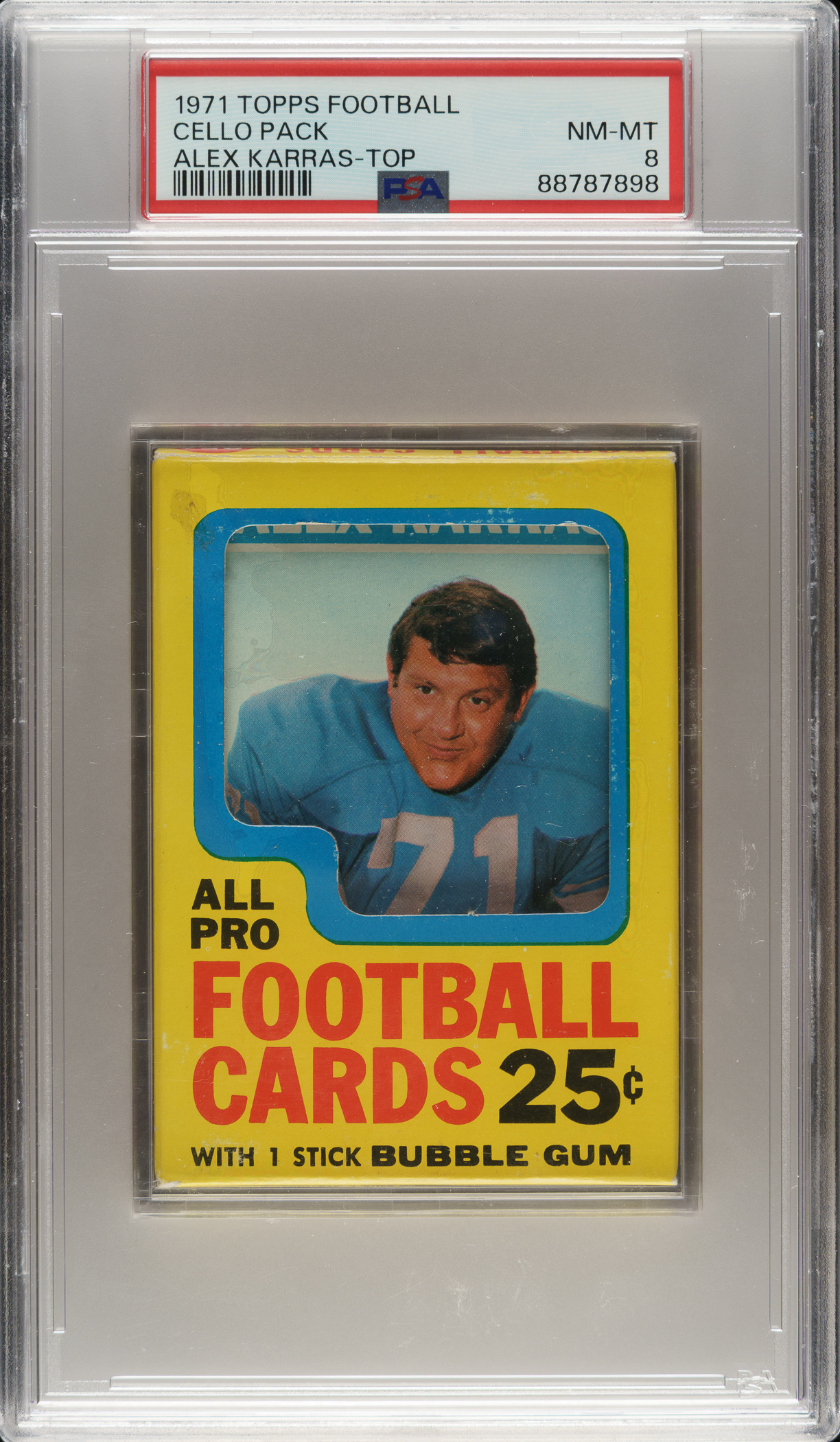 Graded NM-MT 8 by PSA. Superb unopened cello pack in original box packaging from the 1971 Topps football set with Hall of Famer Alex Karras showing on the top. The pack is tightly sealed. This is an outstanding original, unopened cello pack.