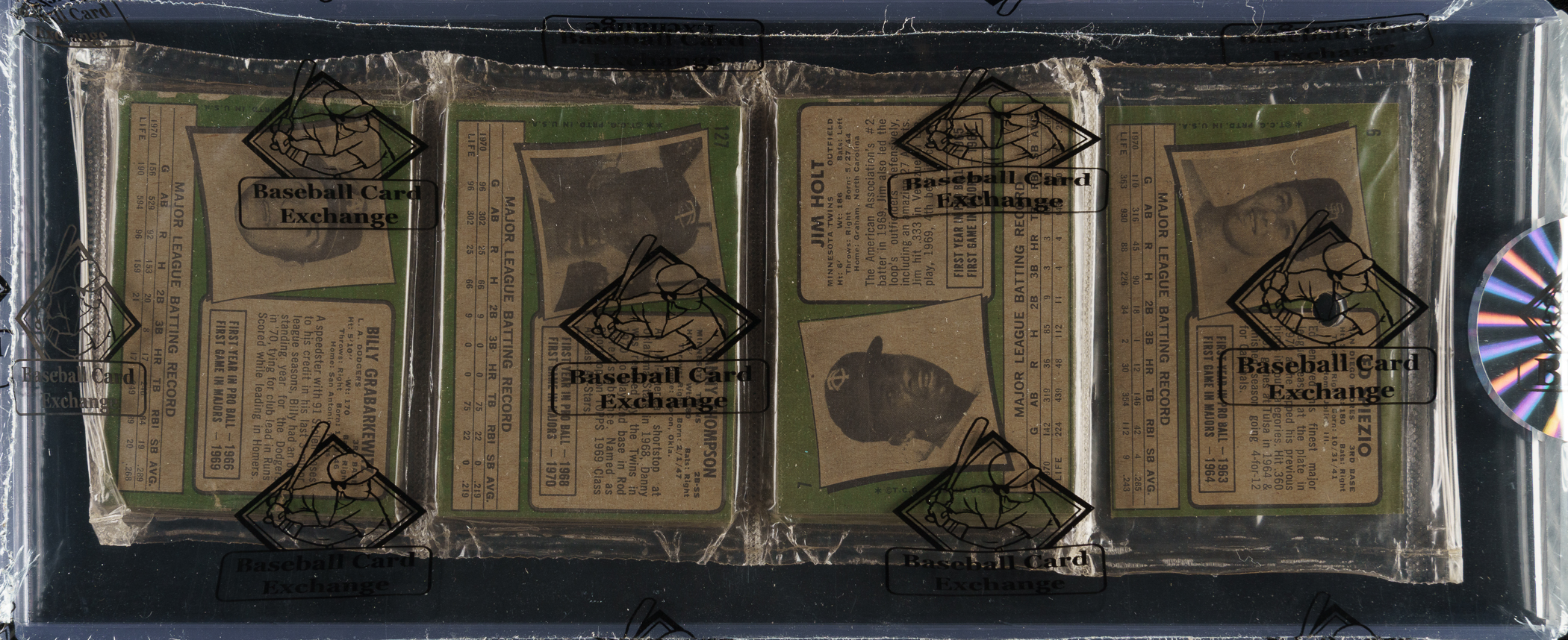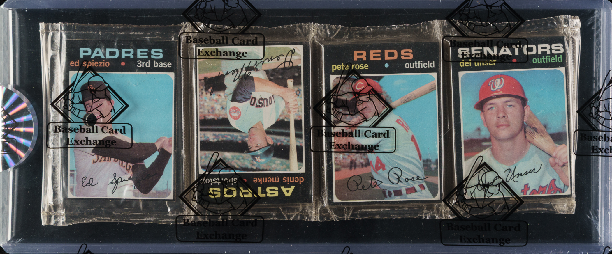 Original unopened rack pack from the 1971 Topps baseball first-series with #100 Pete Rose showing on top. The pack houses 54 cards as well as an additional card that has been inserted in the header position and punched at the top to allow for hanging at retailers. This series is highlighted by Hall of Famers Reggie Jackson, Jim Hunter, Bert Blyleven (rookie), Willie McCovey, Ted Simmons (rookie), and Steve Carlton, as well as New York Yankees legendary star Thurman Munson. Any unopened material from 1971 Topps is extremely rare and, in our experience, it becomes available less than any other 1970s set. 1971 Topps are especially condition-sensitive, as the black flush-to-the-border design of the set makes them particularly susceptible to corner and edge wear. This pack comes shrink-wrapped by Baseball Card Exchange (Steve Hart), the foremost expert on unopened material. The pack displays well overall, with minor toning and normal crimping along the plastic edges. This is a superb original unopened rack pack from one of the most popular and condition-sensitive of all 1970s Topps issues. It would be a worthy addition to even the most advanced collection of 1971 Topps or unopened material.